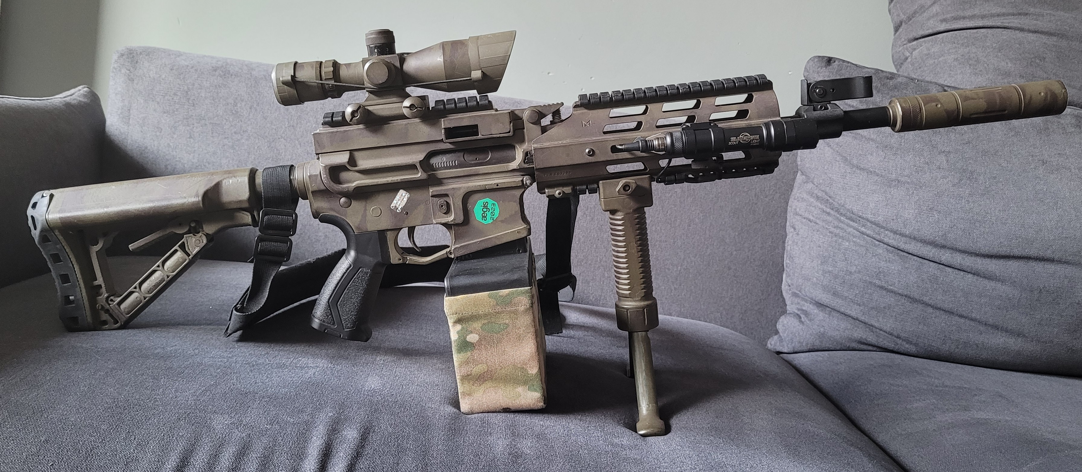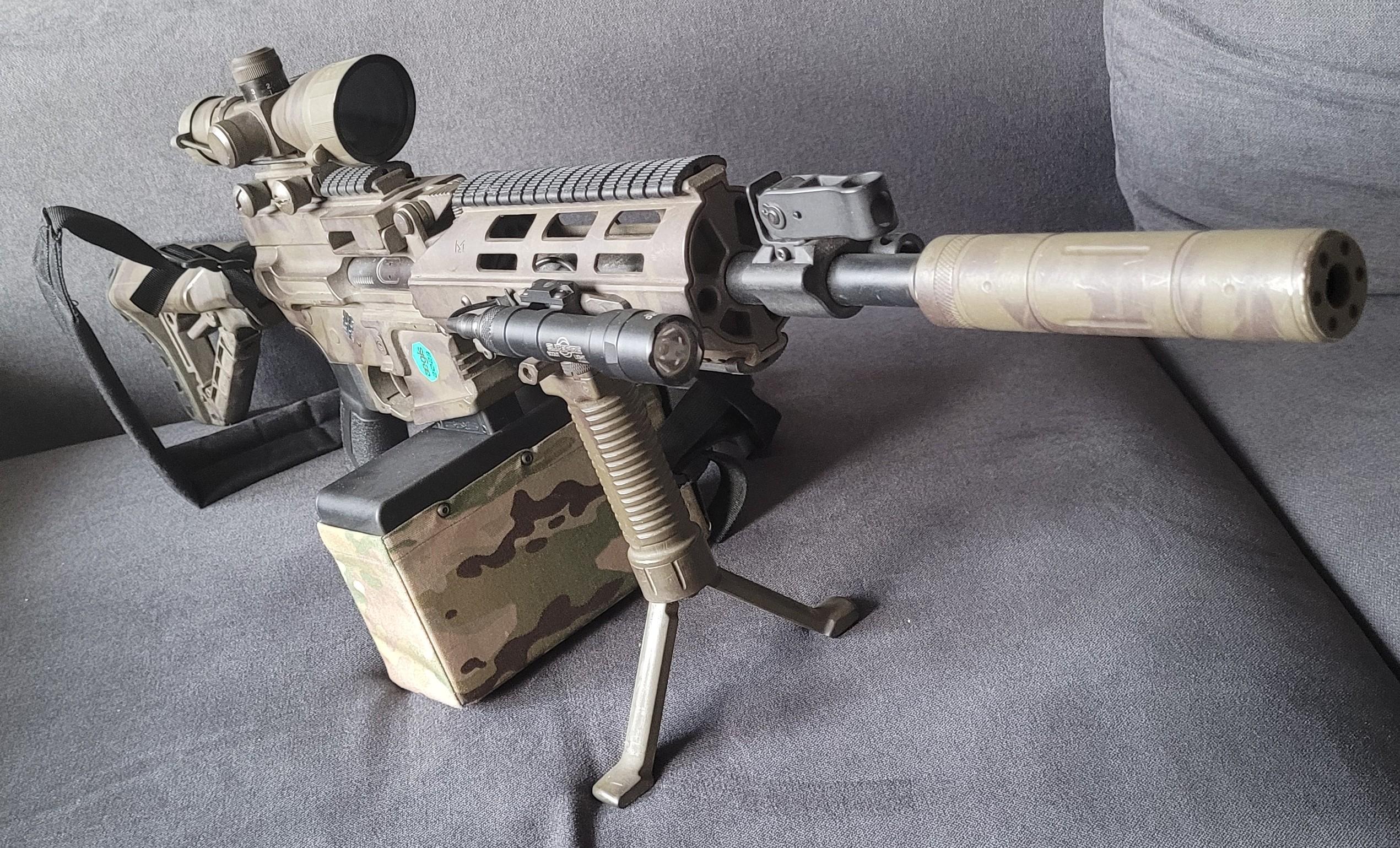 Replika asg po modyfikacjach, sprawna, w stanie bardzo dobrym Moc ~1.8j (ok 440 fps) Lufa precyzyjna Lambda ONE 6,01x363 mm Aluminiowa komora Maxx Model Złącze T-Connect dodatkowo na replice zamontowana: -replika latarki SureFire -luneta z ali (chyba ok x10) z laserem W zestawie z repliką 2x bateria lipo 11v, dodatkowy magazynek, 2 repliki taśmy amunicyjnej, zawieszenie do repliki