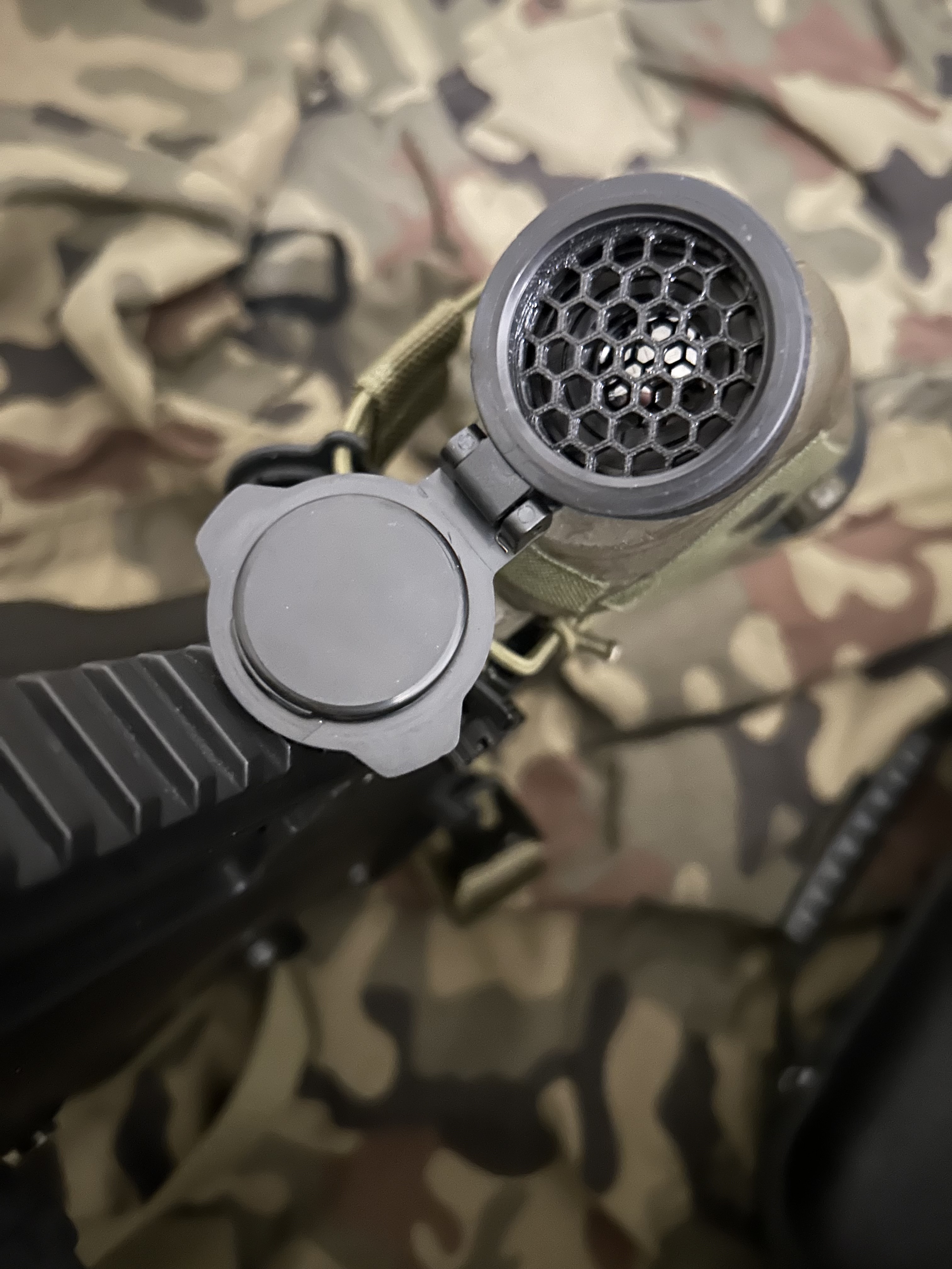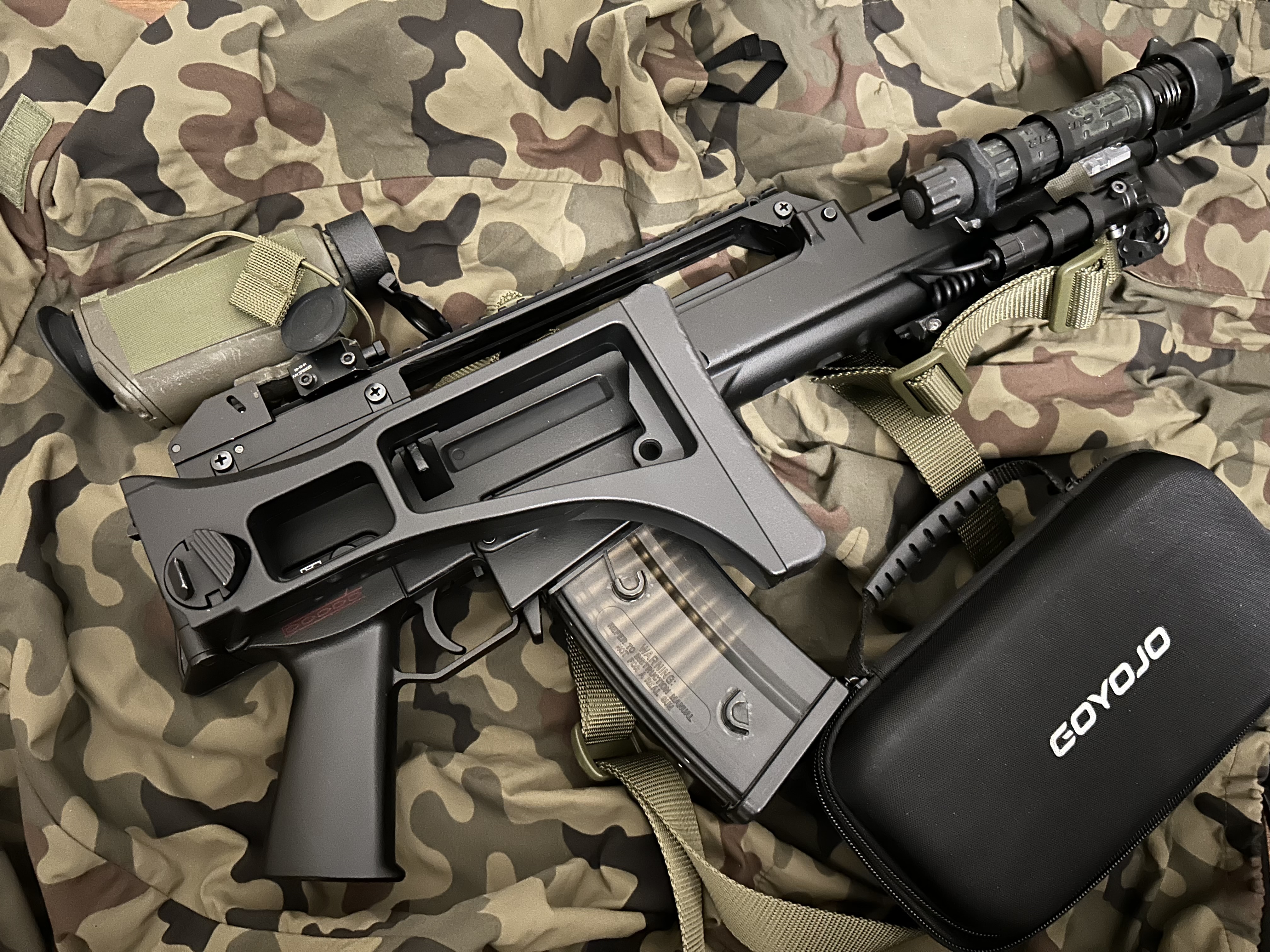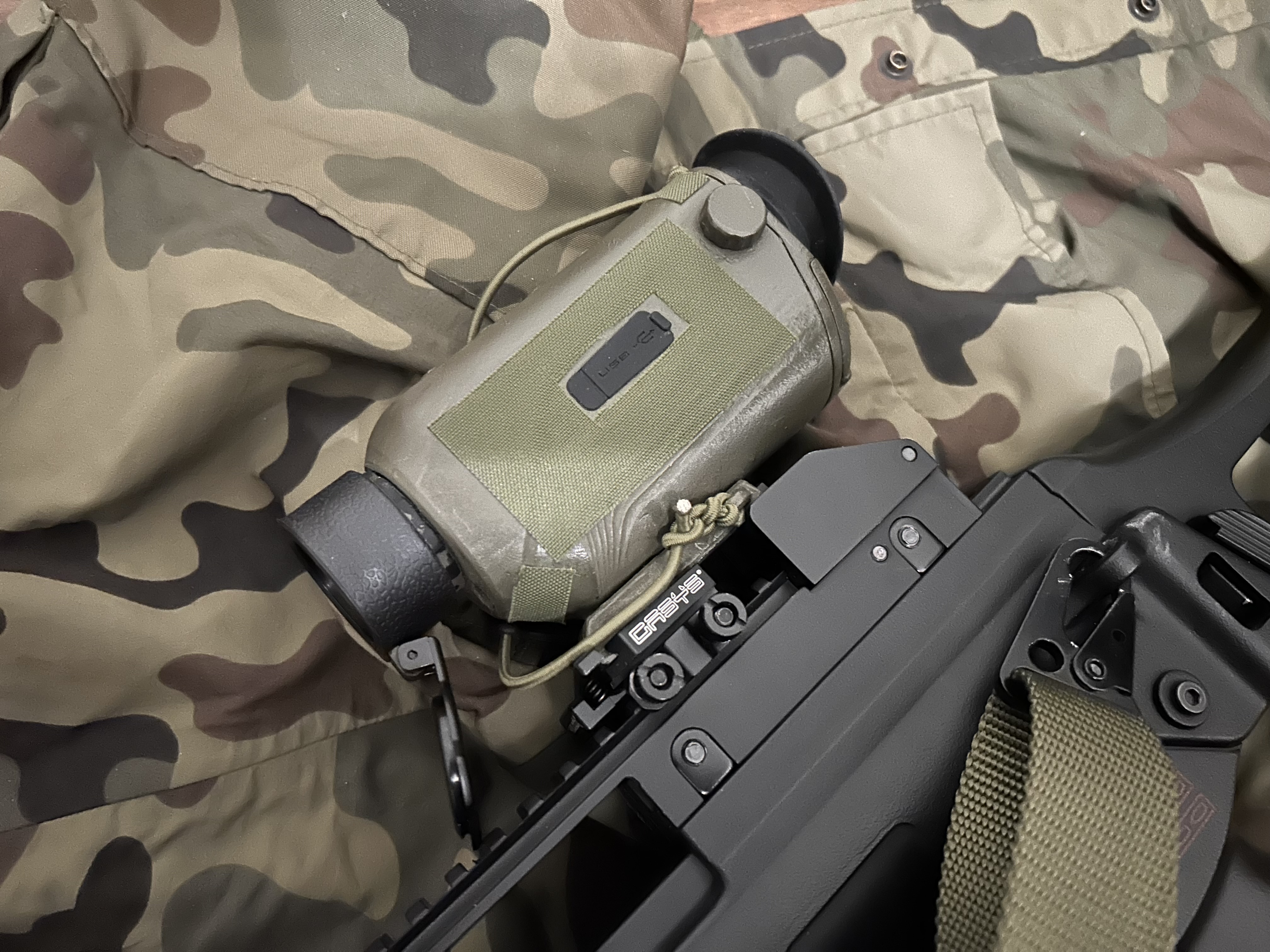 Witam, na sprzedaż idzie monokular termowizyjny GoYojo g215 z adapterem QD i montażem na szynę RIS Wilcox, dostosowany do zamontowania na replikach ASG. Jako ochrona przed kulkami osłony typu plaster miodu i flip up. Sprzęt w stanie bdb, pomalowany i oklejony w celu nadania bardziej militarnego wyglądu jednak nie posiada żadnych uszkodzeń. Sprzęt bardzo dobrze się spisuje na karabinku AEG, posiada celownik z funkcją ustawienia wybranego zera oraz kilka dostępnych wersji krzyża, w głównym trybie palet koloru inni gracze na szarym tle podświetlani są na czerwono co daje bardzo dużą przewagę w lesie lub w ciemnych pomieszczeniach CQB. Ma również funkcję nagrywania video oraz robienia zdjeć. Można w kilka sekund założyć go na replikę dzięki mocowaniu QD lub zdjąć i używać jako monokularu do obserwacji ręcznej. Zasilany jest ze standardowych akumulatorów 18650 co jest dużą zaletą w porównaniu z konkurencją - w zestawie 3 akumulatory. Parametry: Type: Thermal Image Focal Length: 15mm Field of view: 11.7’ x8.8’ Detector Type: Vanadium Oxide Uncooled Infrared Focal Plane Arrays Resolution: 256x192 Pixel size: 12um Working wavelength: 8~14um NET D: 50mK 25 oC,F#1.0,50Hz Frame Rate: ≤50Hz Focus Method: Manual Focus