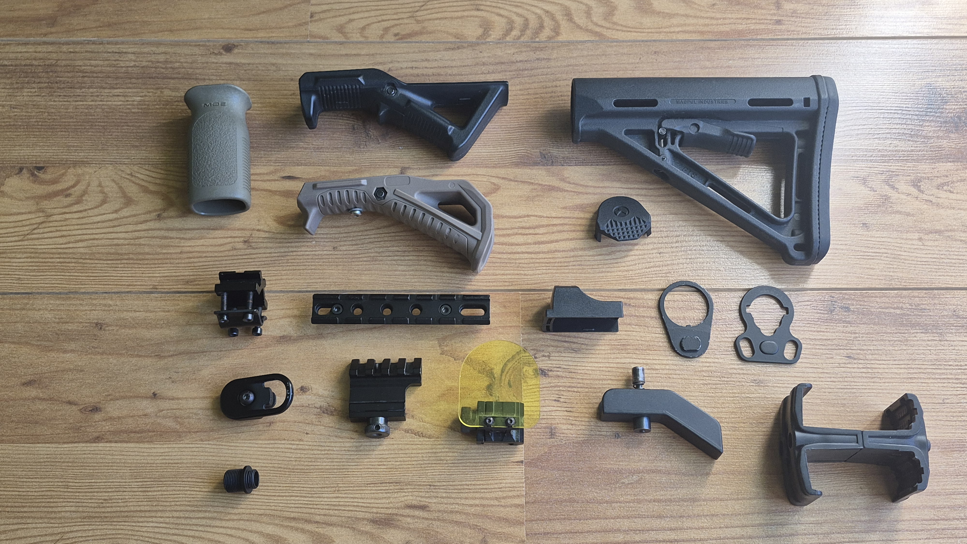 kolba magpul, chwyt, przejściówka, end plate i inne części