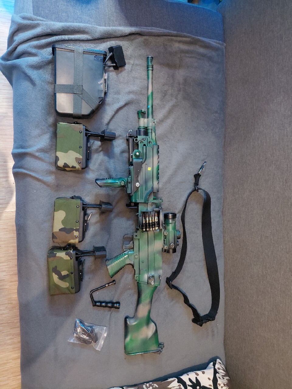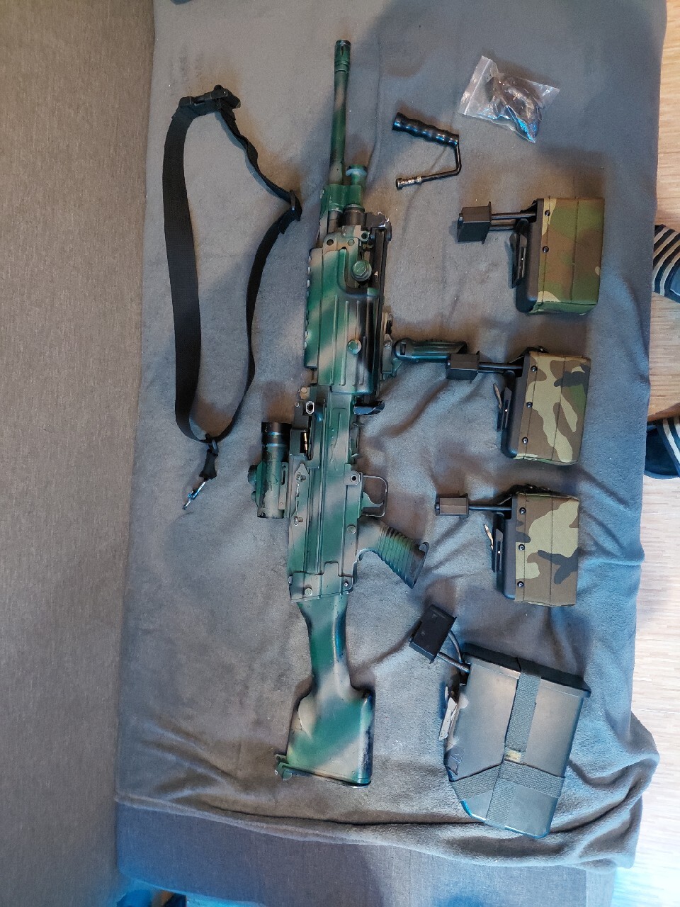 Witam Mam na sprzedaż M249 marki specna arms Replika to stary wypust specny z w pełni metalowym korpusem, replika jest po modyfikacjach, po przeglądzie zerowym i ma zamontowany mosfet, sprężynę solink m120, wzmocniony tłok i wtyczkę Dean T (Tconnect) Replika w pełni sprawna, gotowa do gry ma zamontowany chwyt przedni na customowym bocznym montażu, oraz montażu na pasek (dołączony do zestawu) Replika strzela z mocą 1.6j na kulkach 0.20g Replika podaje i strzela na każdym z dodanych boxów oraz może strzelać z magazynkami m4 Z mankamentów jest ułamany kawałek znalu przy montażu dwójnogu oraz 3 przycięte śrubki w celu łatwiejszego demontażu dwójnogu, do tego brak muszki W zestawie z repliką znajdziemy: -kolimator -dekoracyjną taśmę amunicji -solidny pasek na specjalny montaż -3 boxy marki dboy na 1500 kulek - 2 ładowarki do boxów - Chwyt transportowy bez montażu -Customowy montaż na chwyt przedni razem z chwytem -Oryginalny box na 2400 kulek z klejonym gniazdem zasilany na 2 baterię AA W razie pytań zapraszam do konwersacji, najlepszym wyjściem był by odbiór osobisty ze względu na gabaryt, ale jest też opcja wysyłki dla chętnych