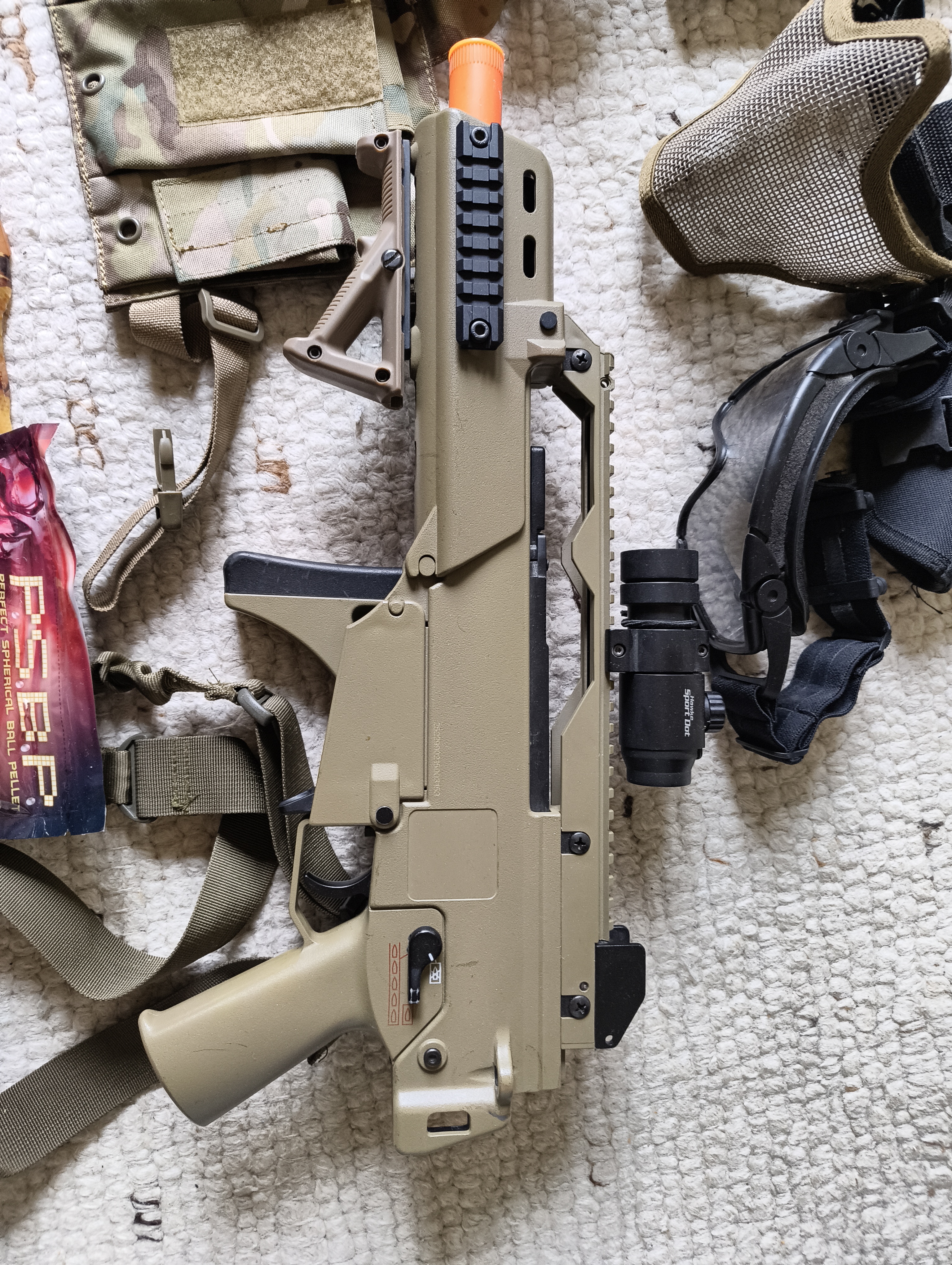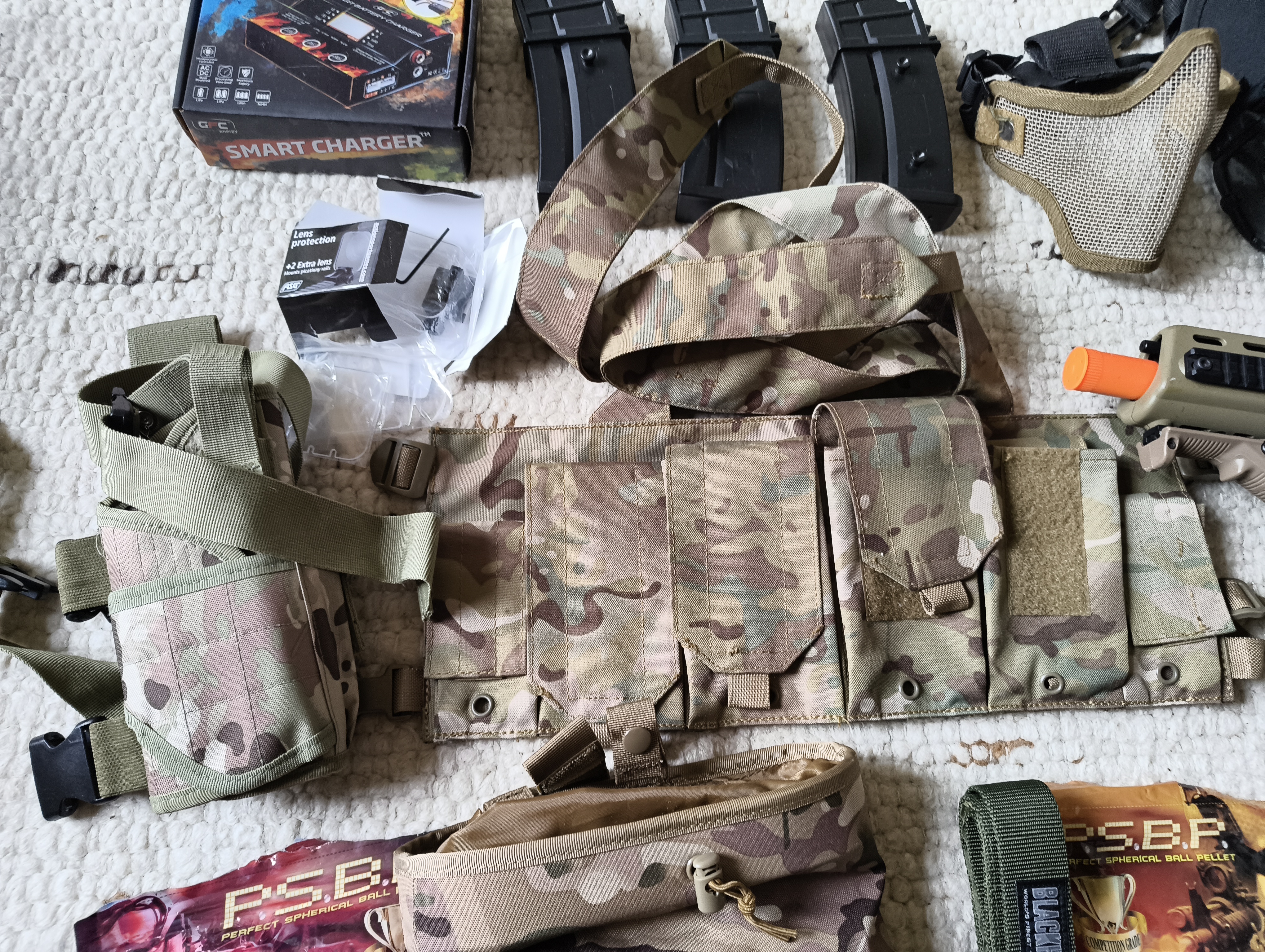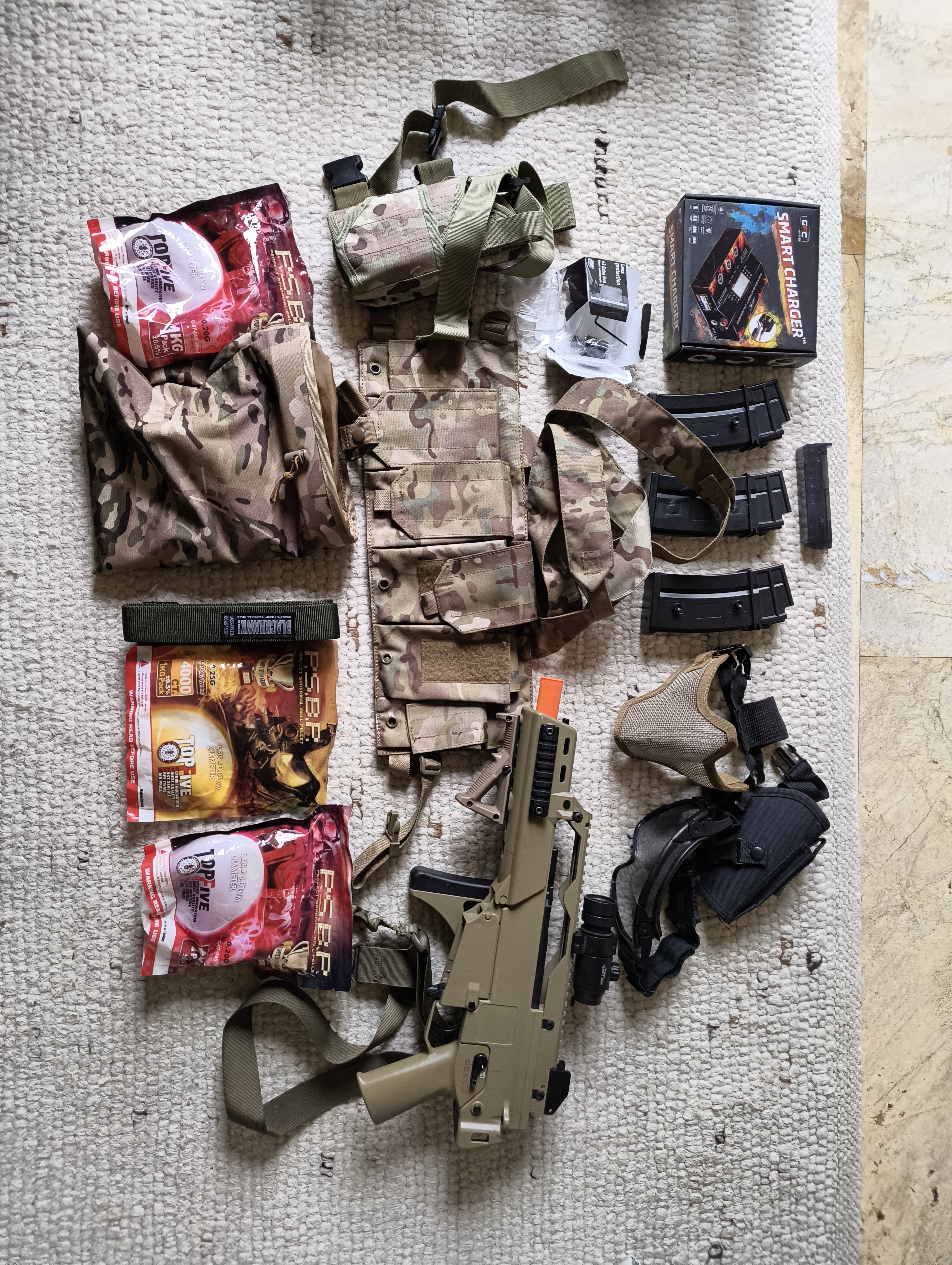 Sprzedam kompletny, bogaty zestaw do rozpoczęcia przygody z ASG "od zera". Bardzo dbałem o sprzęt. Uzyłem go raptem na około 4-5 lokalnych strzelankach. Główny element: Replika G36C od firmy JG – model kultowy, pancernej wytrzymałości. Stan mechaniczny bdb, UWAGA: Kolimator jest uszkodzony (elektornika włacznik szwankuje). Zestaw wymaga dokupienia nowej baterii LiPo (stara jest do wymiany). Cena zestawu uwzględnia te mankamenty. Co jeszcze wchodzi w skład zestawu: Magazynki: 3 sztuki typu Mid-cap (ciche, nie grzechoczą, zapewniają lepsze podawanie kulek). Inteligentna ładowarka mikroprocesorowa GFC Energy Smart Charger: W oryginalnym pudełku, z wyświetlaczem. Dba o Twoje baterie. RĘKAWICZKI Mechanix Wear FastFit (Multicam): Oryginalne, stan bardzo dobry, bez przetarć i dziur. Bardzo wygodne. Rozmiar M Kamizelka typu Chest Rig (Multicam): Lekka, wygodna, z ładownicami. Gogle z wbudowanym wentylatorem (świetnie zapobiegają parowaniu). Maska typu Stalker (siatkowa). Osłona kolimatora ASG montowana na szynę RIS. Pas taktyczny: Solidny pas militarny marki Black Hawk. Akcesoria: Torba zrzutowa (dump pouch) na puste magazynki, szybkoładowarka (speedloader) oraz dwie kabury pistoletowe. Jeszcze smycz na ramie do broni Kulki G&G P.S.B.P. 0.2g: Topowa jakość. Jedna pełna paczka (4000 sztuk) + druga otwarta (ok. połowa).