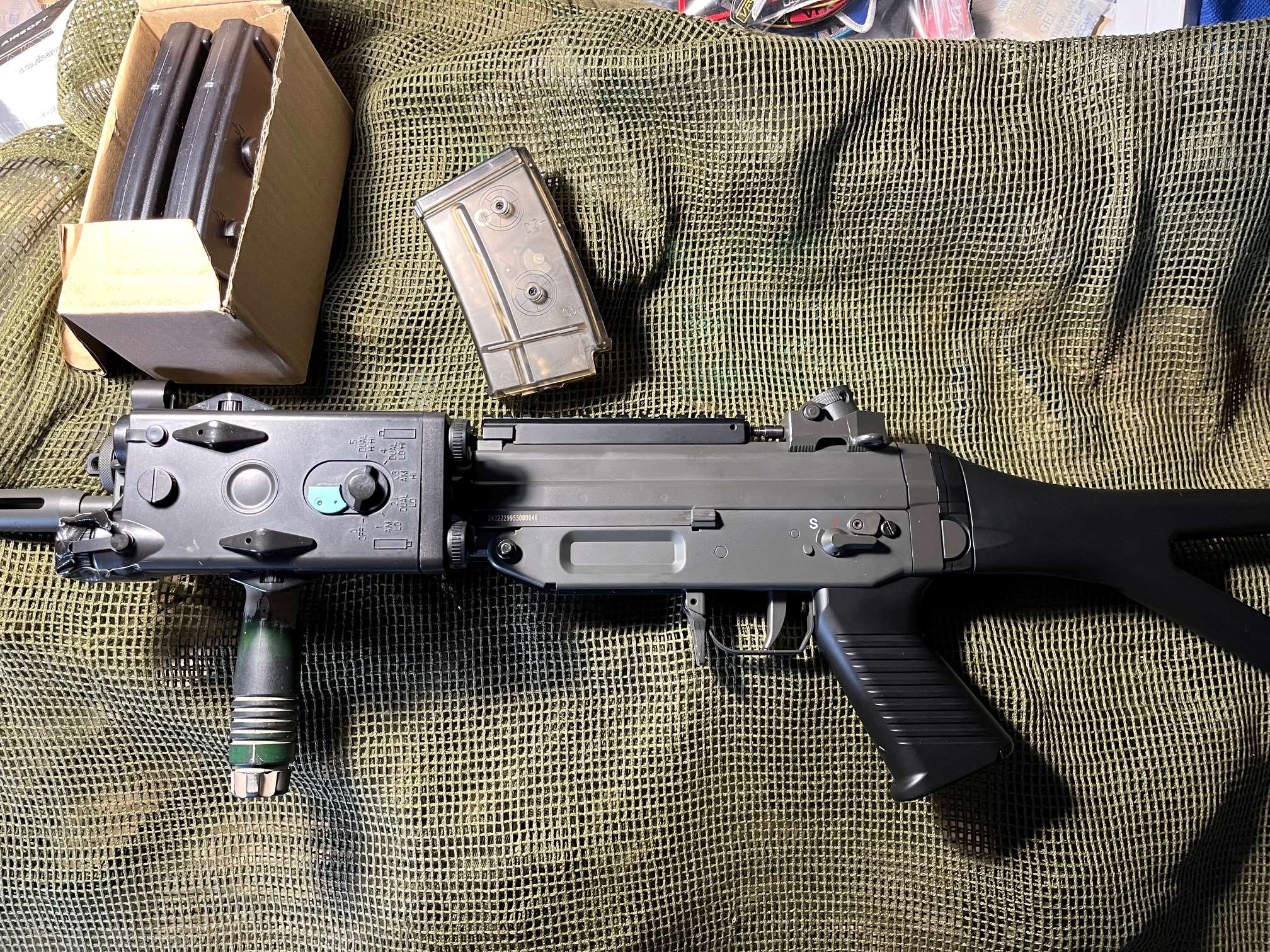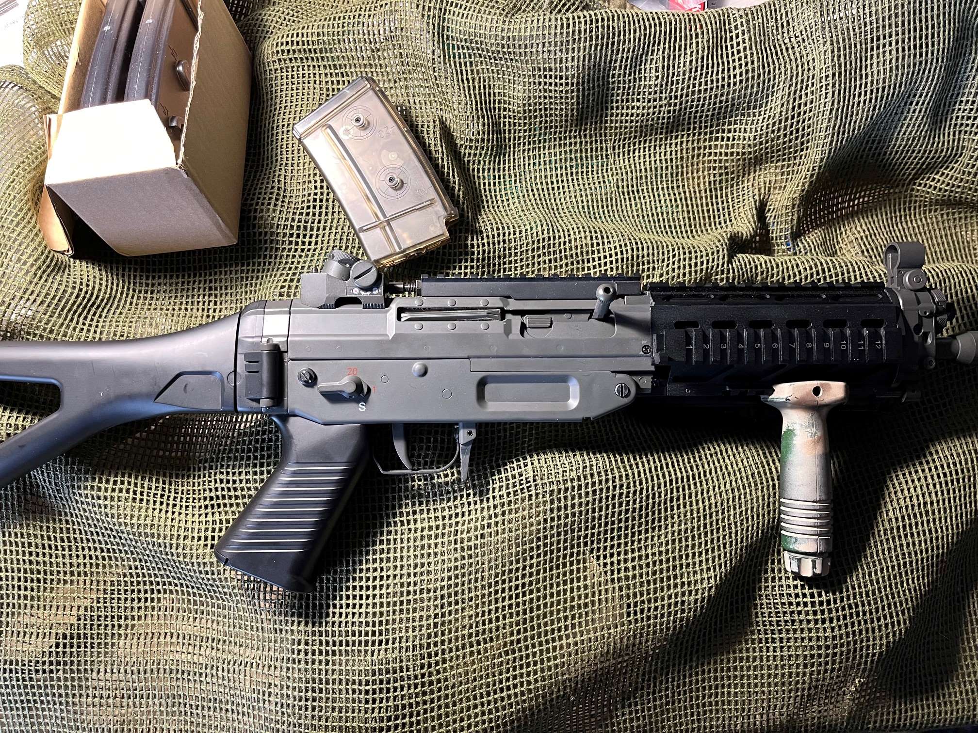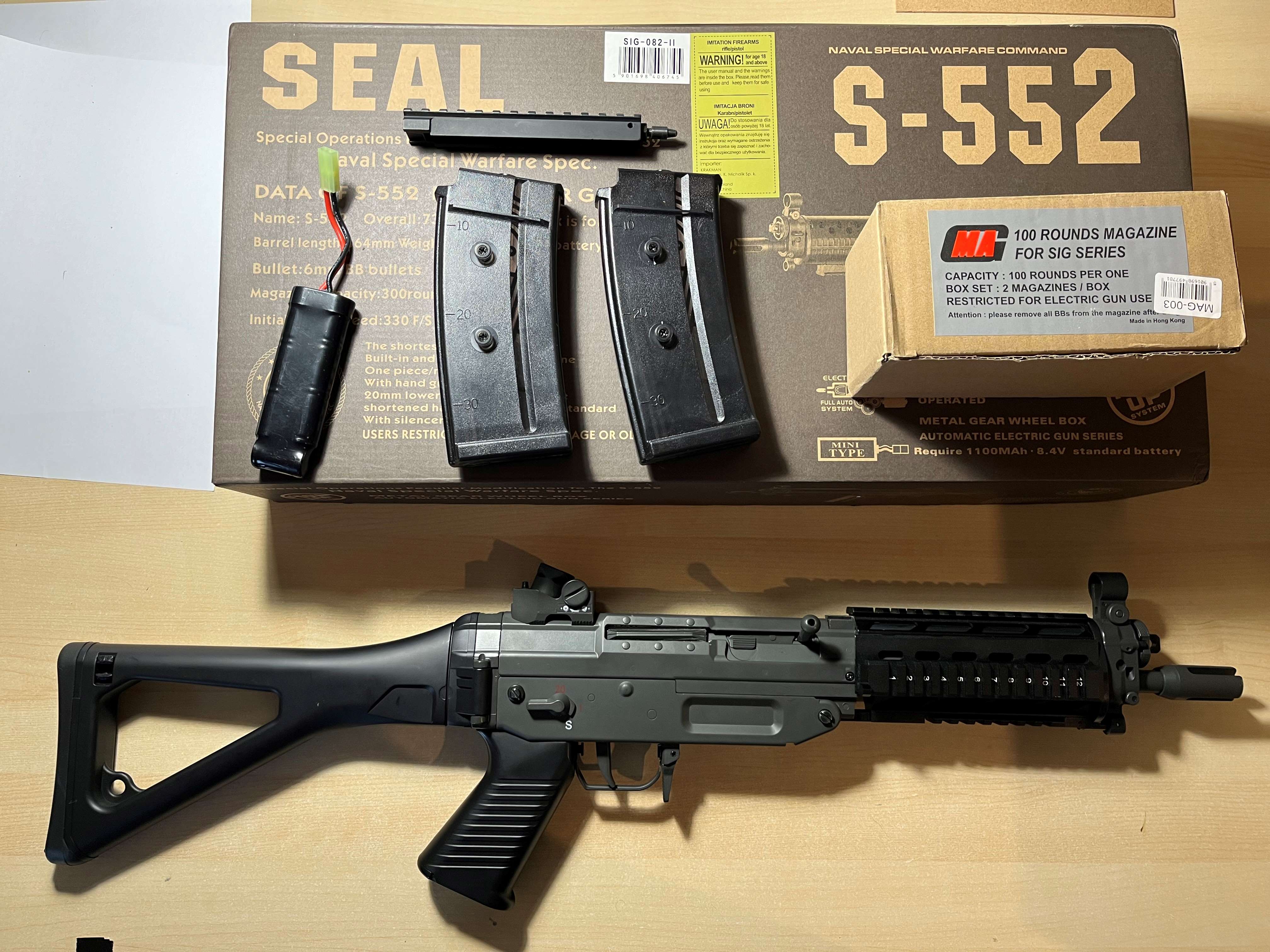 Na sprzedaż replika SIG 552 od JG (wersja kompozyt) szyny alu. Stan bardzo dobry. Replika nie używana w terenie. W większości przeleżała w kartonie. W zestawie to co na zdjęciach ( 4 magazynki dodatkowe mid capy ) dorzucam atrapę An/PEQ2 jako pojemnik na baterię. Wymiana bateri bez demontażu szyn. Cena 555 z kosztami wysyłki ( do negocjacji ).