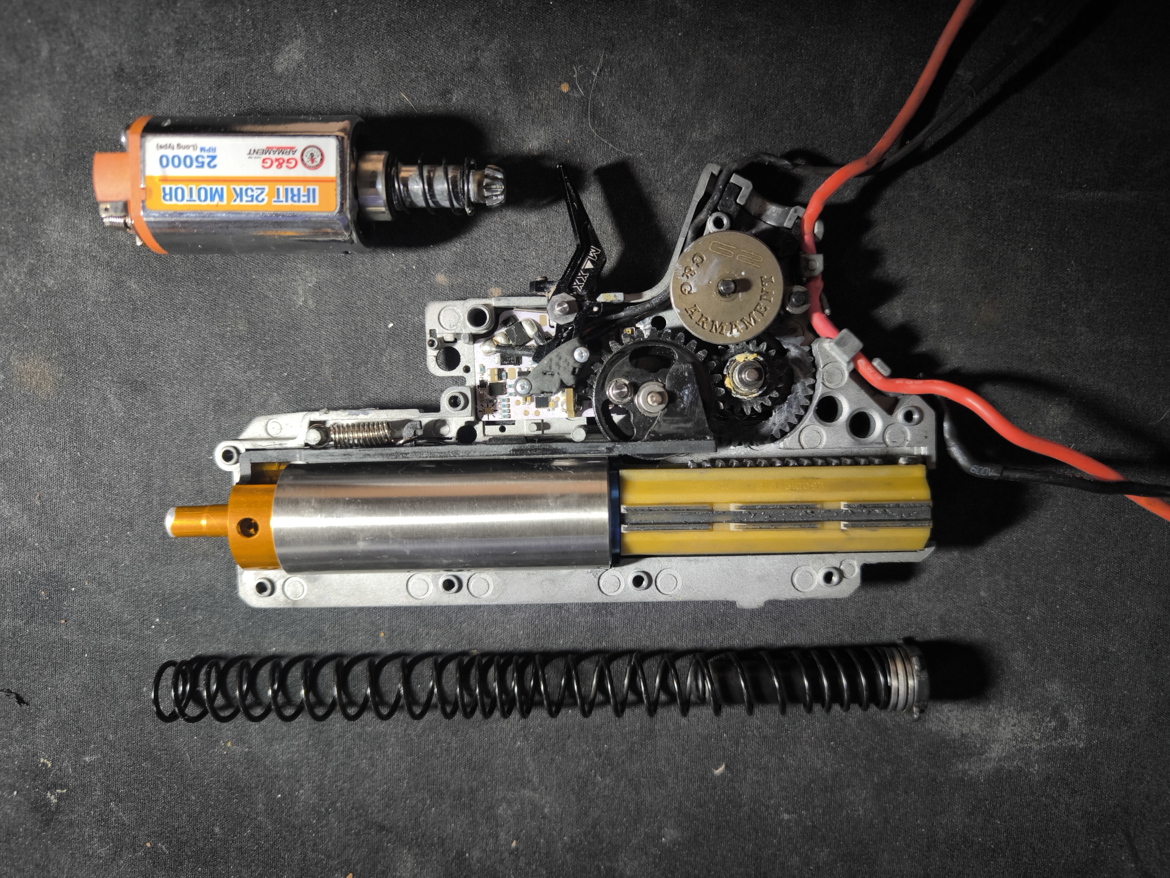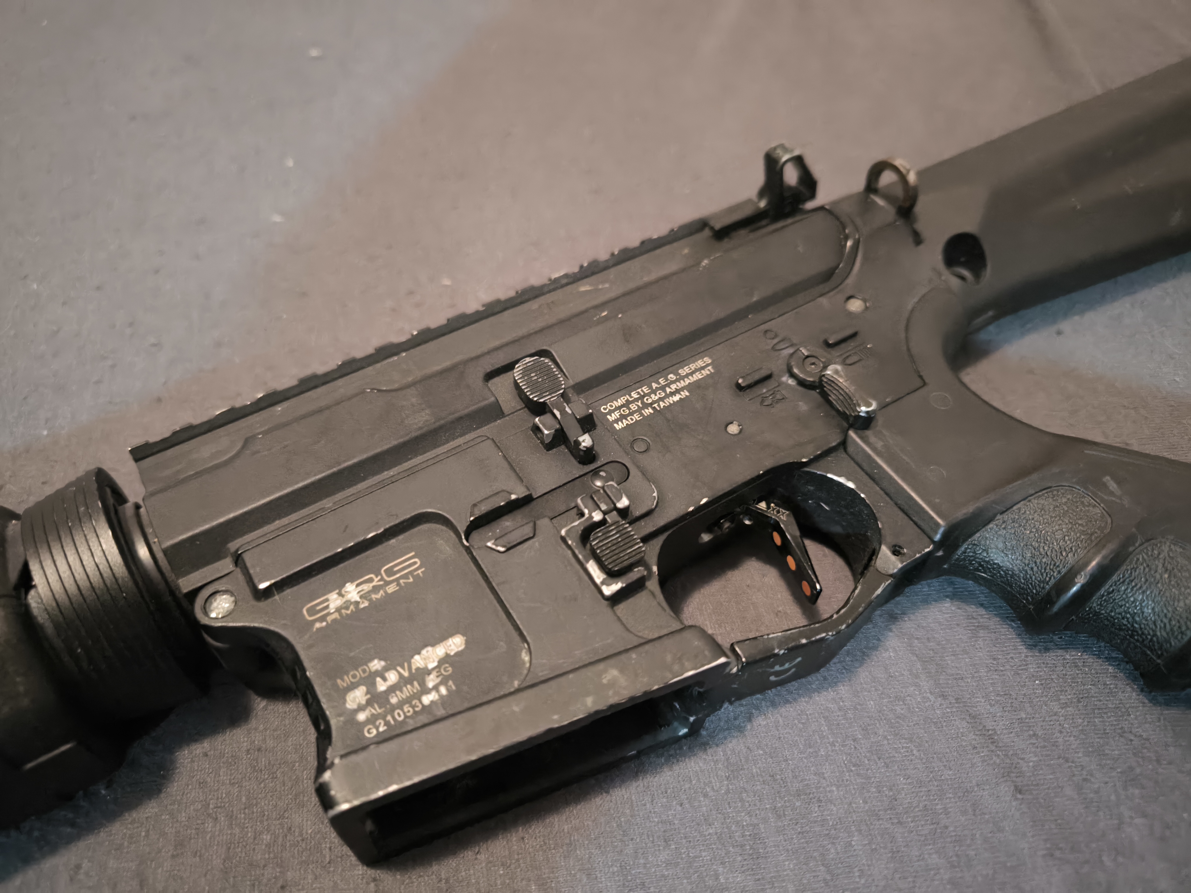 Cześć, pozbywam się jednego z droższych elementów swojej kolekcji. Repliki nie dotykałem przez rok i przez nadchodzącą operację raczej też nie będę miał okazji. Baza repliki to G&G TR16 556 WH. Obecnie zbudowana jest w konfiguracji DMR - niecałe 2.2J. Replikę składąłem w 2022, producentów niektórych elementów nie pamiętam. Całość ma przebieg około 50k kulek, dwa razy do roku replika była rozbierana i serwisowana przeze mnie. Lista wymienionych elementów: Aluminiowa głowica tłoka Dysza dopasowana własnoręcznie Zębatki big dragon CNC 18:1 + silnikowa zębatka G&G Mosfet perun hybrid v2 Mocniejsza sprężyna dosyłacza Kable o grubszym przekroju Spust maxx model, podwójna regulacja, wypodkładkowany pod szkielet Sprężyna na 2.3J Komora hopup SHS/podróbka prowina Gumka zielona G&G, flat (wymieniona 5.04.26, przed zrobieniem zdjęć) Dystanser flat + przerobione ramie Lufa Lambda lub davinci - skracałem z dłuższej, sam zarobiłem koronę, kiedy składałem replikę używałem luf jednej z tych firm Kolba została wymieniona na oryginalną kolbę od magpula i przerobiona pod replikę ASG Łoże to już replika, nie oryginał Niskoprofilowy blok gazowy nadający sztywność łożu replika przez wystawieniem aukcji została skontrolowana wewnątrz, wymieniłem smary na pneumatyce i zmieniłem gumę (poprzednia sparciała, blokowała kulki). Replika posiada funkcjonalny bolt stop i bolt catch, nie posiada czujnika puistego magazynka (przez wymianę mosfetu). Kolba ma delikatny ruch wokoł śruby mocującej, ale jest to niezauważalne w czasie użytkowania. Do repliki specjalnie kupiłem baterie konkretnego rozmiaru - dwie sztuki, jak na foto. Mieszczą się do kolby idealnie - mogę dać jako gratis dla zdecydowanego kupującego. Aku nie są spuchnięte, ładowane zawsze prądem poniżej 1A. Zapraszam