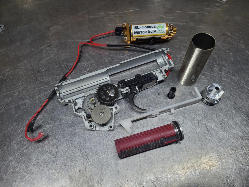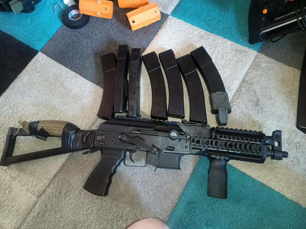 Sprzedam replikę LCT Vitya, czyli pistolet maszynowy zza wschodniej granicy. Replika pierwotnie miała okładziny z tworzywa, zmieniłem na dedykowane szyny od lct. W zestawie jeden low cap na 50 kulek, reszta to midcapy. Generuje 1,66J na 0,25. Lufa komora i gumka to stockowe części. Chwyt w wersji slim wraz z dedykowanym silnikiem od aresa. Popychacz dyszy retro arms Glowica cylindra retro arms Dysza modify albo lonex Zębatki stock Selektor ognia wymieniony na bardziej taktyczny. Jeśli coś nie wyszczególnione, to znaczy, że jest stockowe. Link do allegro https://allegrolokalnie.pl/oferta/replika-pistoletu-maszynowego-pp1901-witiaz-lct-vityaz-aeg