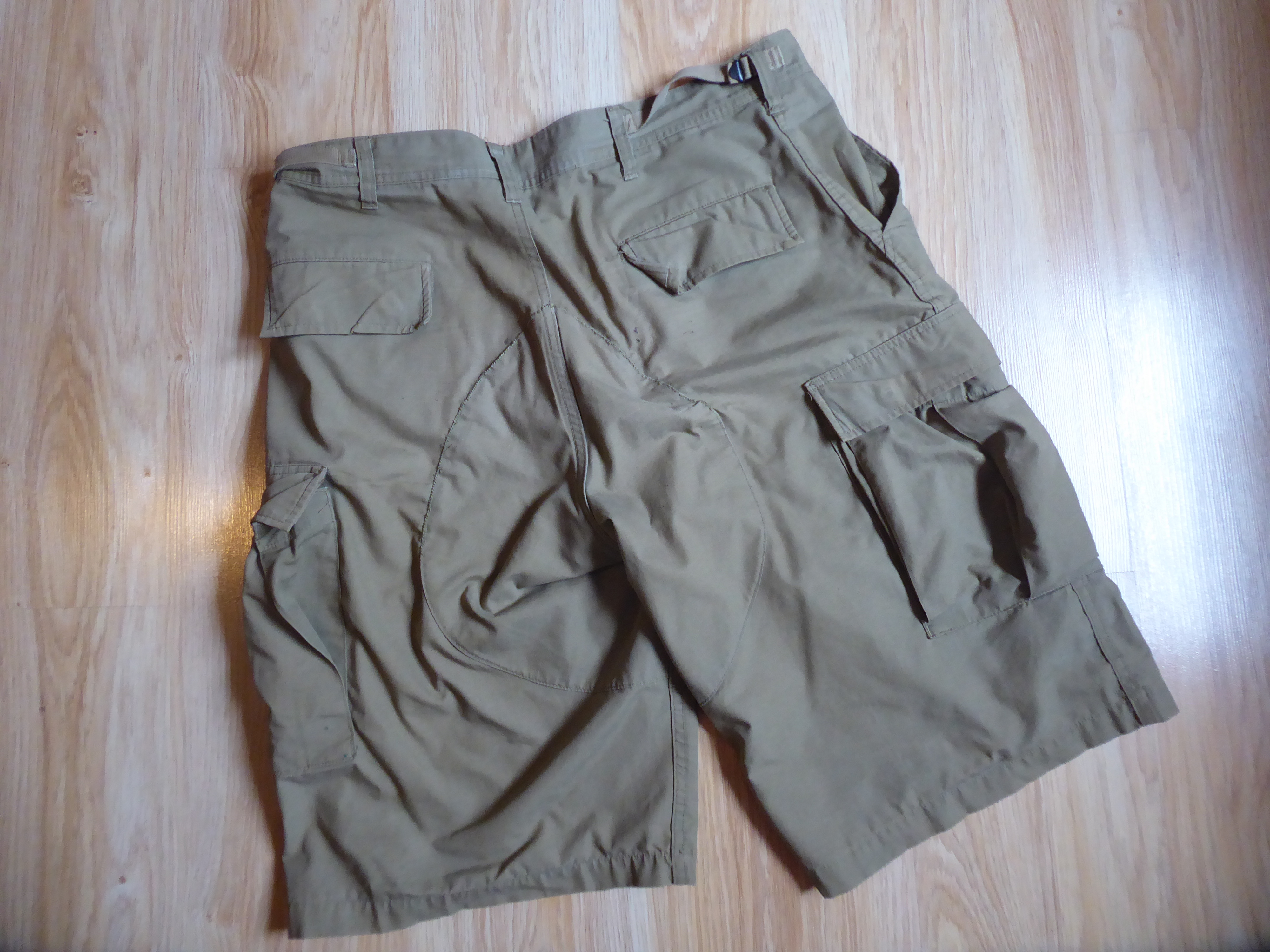 Sprzedam krótkie spodenki BDU Helikon. Uszyte z nieprodukowanej już mocnej tkaniny rip-stop NYCO 50/50. Kolor coyote Brown. Rozmar L – w pasie 94 z możliwością zmniejszenia o ok. 10 cm. Używane – funkcjonalnie są OK., ale mają kilka plamek i śladów napraw. Wzmocnienie z tyłu ma nieoryginalny szew – zahaczyłem o siodełko roweru i szew puścił. Jeden guzik w innym kolorze – oliwkowym. Tkanina nie jest nigdzie rozdarta czy przetarta.