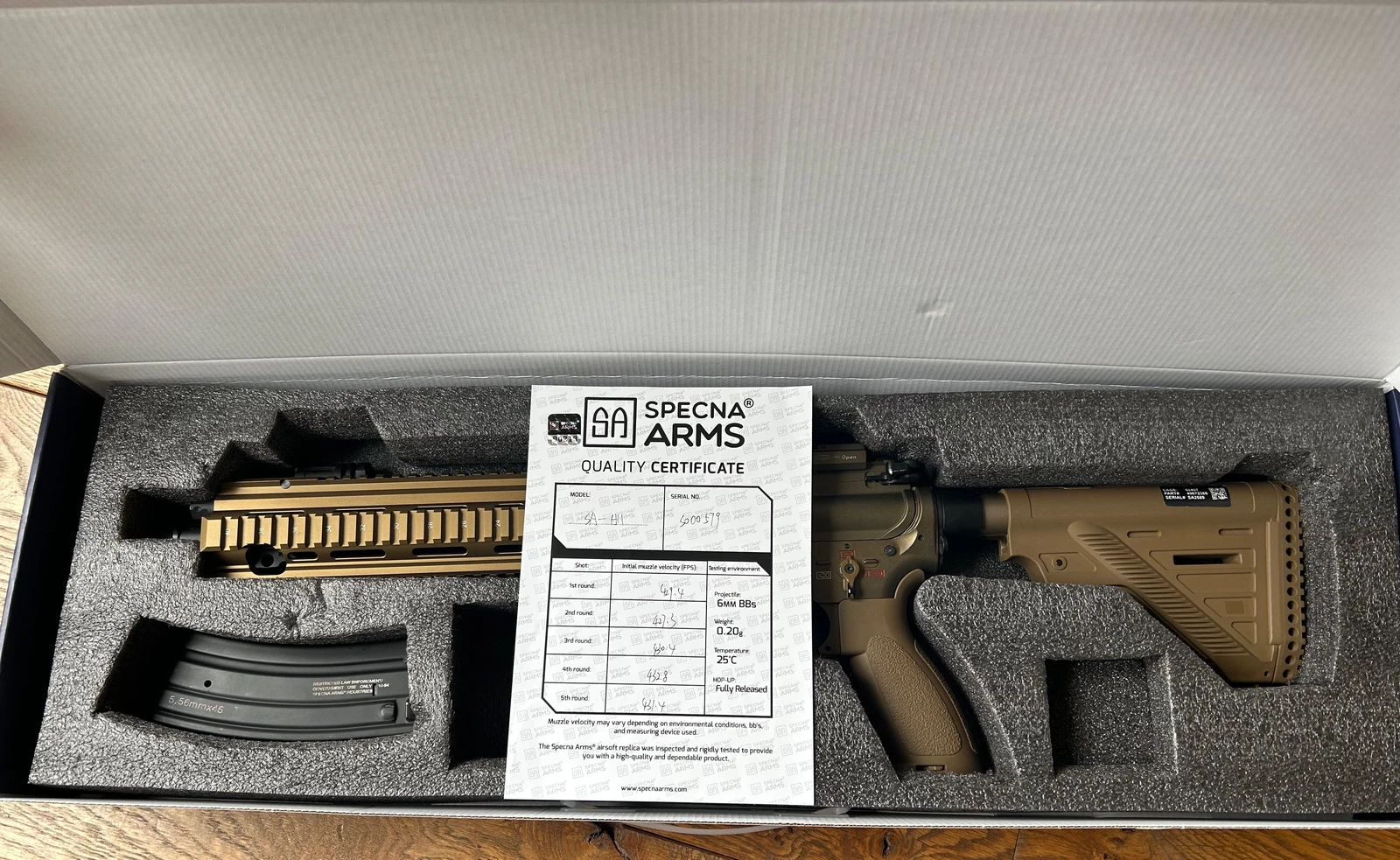 SA-H11 One, replika słynnego HK416A5. W kolorze brązowym. Jak nowy, nigdy nieużywany. Kilka drobnych rysek tu i ówdzie, ale nic więcej. W zestawie HiCap i certyfikat. Z pudełkiem; możliwy odbiór osobisty lub wysyłka.
