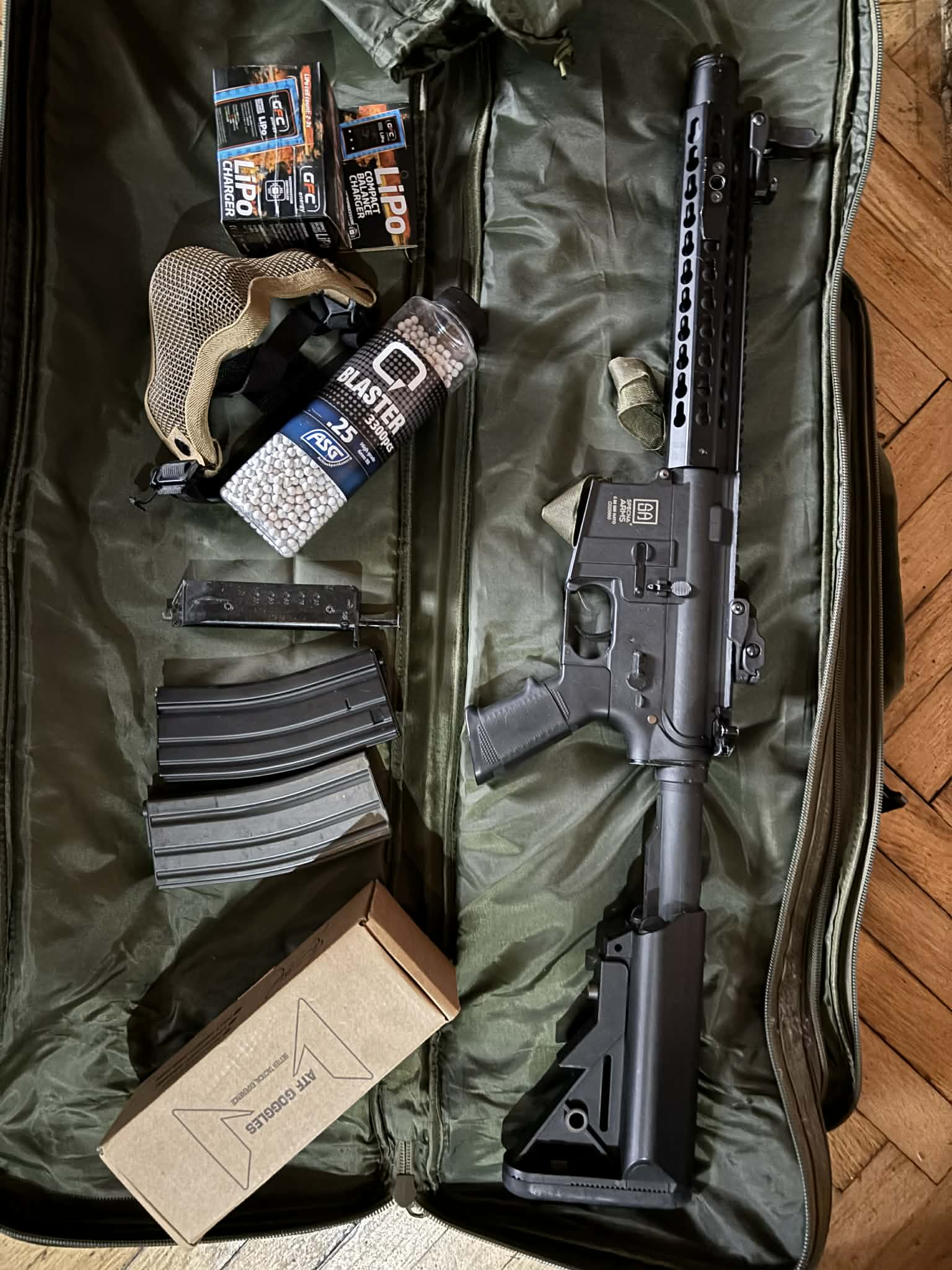 Witam , posiadam do sprzedania Karabinek szturmowy AEG Specna Arms SA-C07 CORE , jest to replika asg oraz akcesoria. Do repliki posiadam oryginalny karton w którym znajduje się : wycior i sprężyna cqb (założona w replice jest mocniejsza). Oprócz tego posiadam jeszcze niecałe opakowanie kulek , 2 dodatkowe magazynki (jeden wytrzymalszy z marki CYMA), szybkoładowarkę,ładowarkę LI-PO do baterii , gogle panoramiczne wentylowane z 3 soczewkami które można wymieniać , maskę ochronną typu stalker ,akumulator LiPO do repliki oraz torbę transportową SPECNA ARMS . Replika działa bez zarzutów, było o nią dbane i po każdej strzelance była przeczyszczona oraz co jakiś czas smarowana olejem do broni. Po więcej informacji zapraszam do wiadomości prywatnej oraz w celu ustalenia wysyłki. Cena do negocjacji , zapraszam do zakupu.
