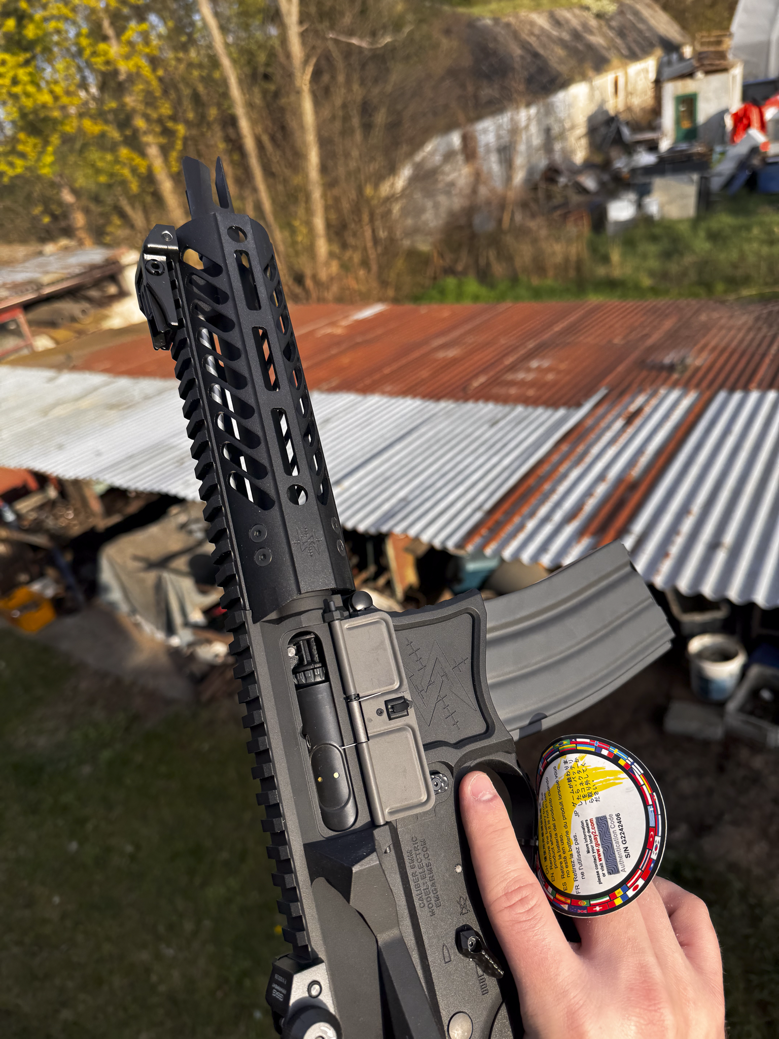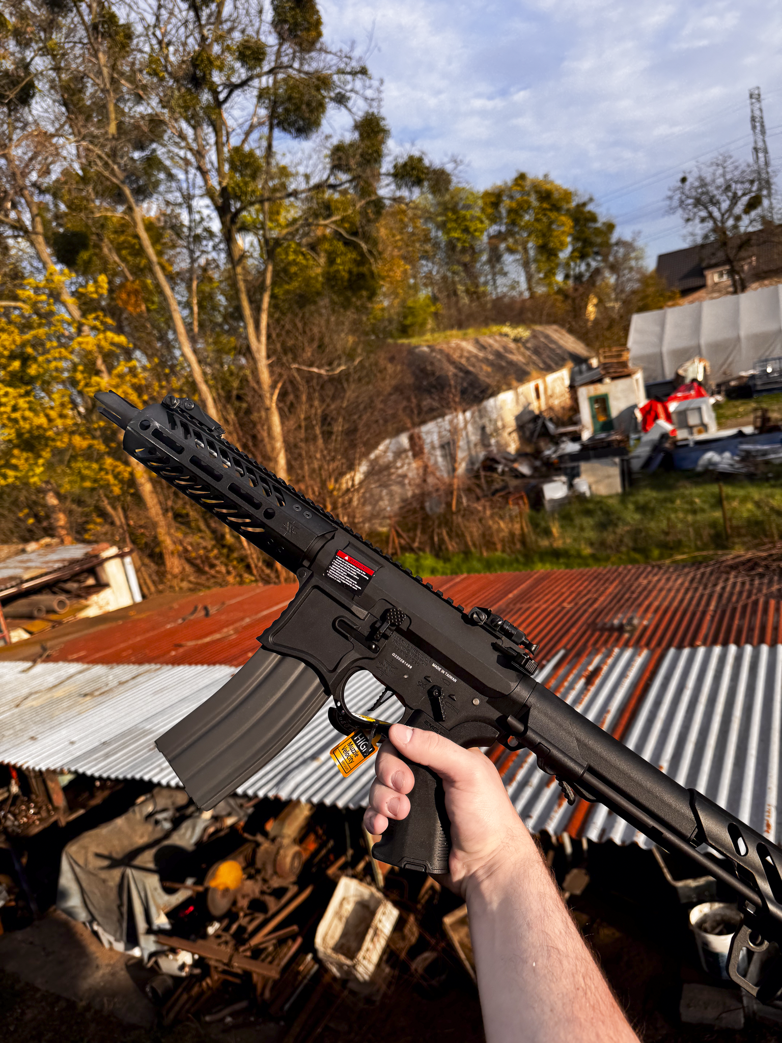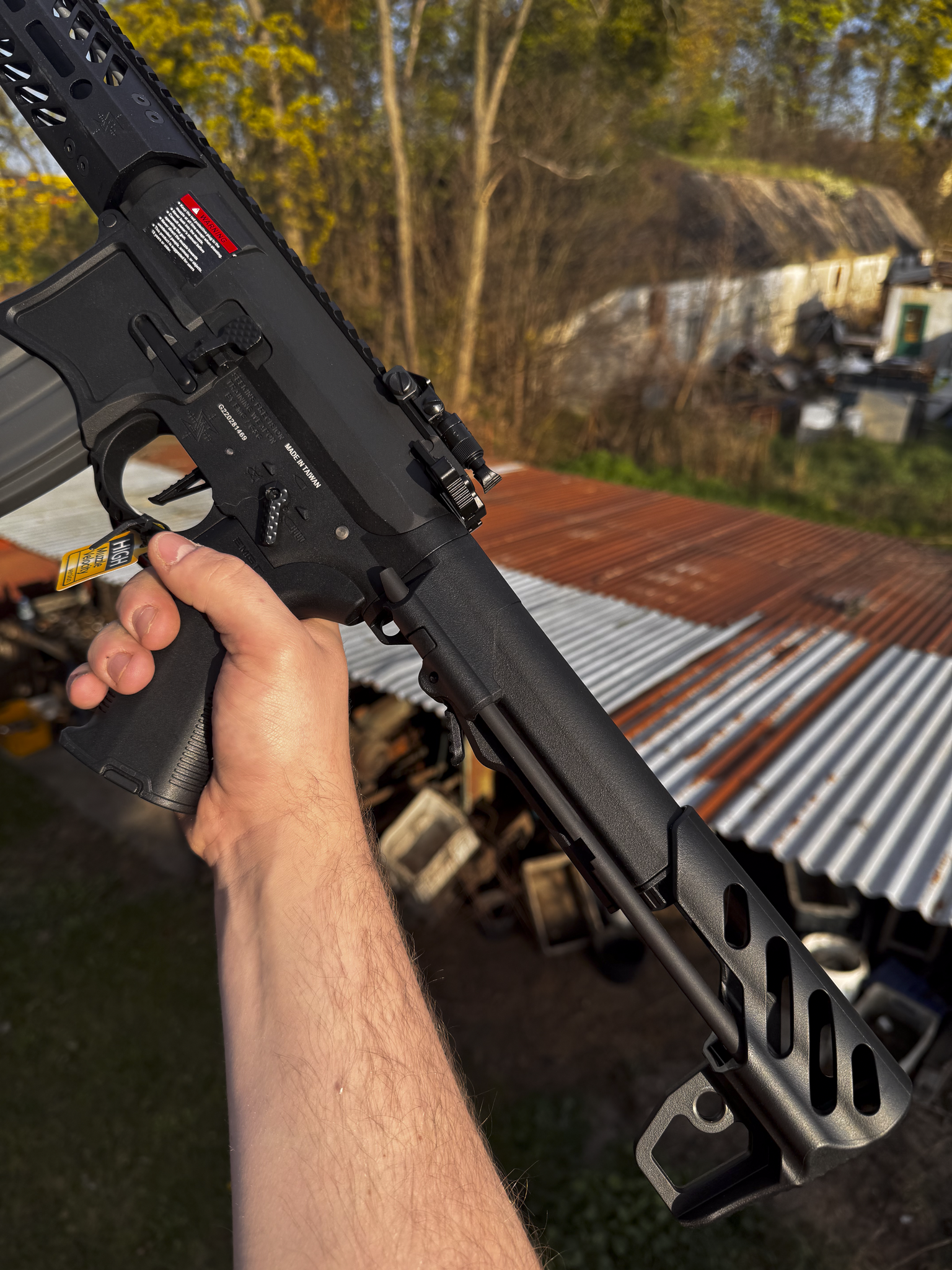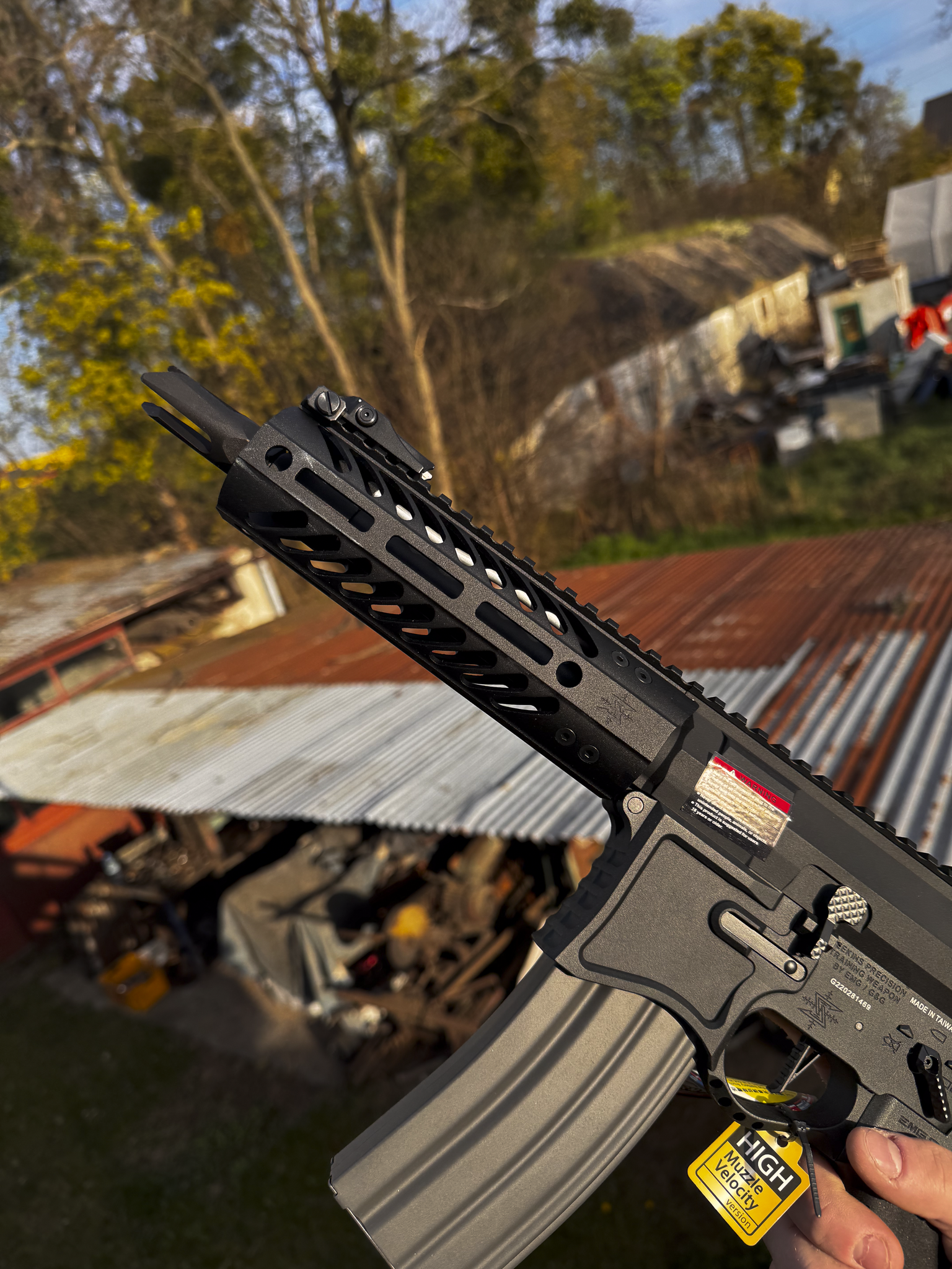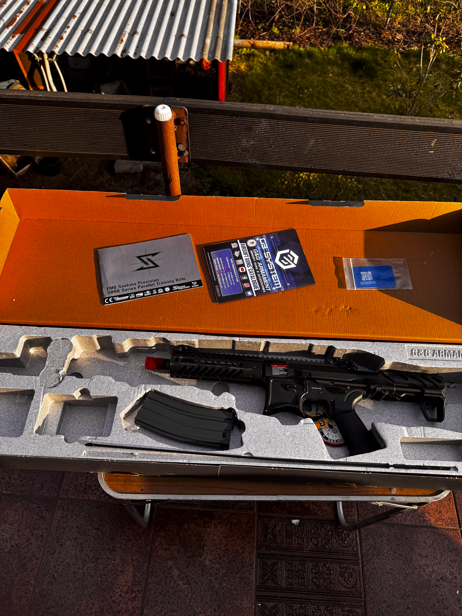 REPLIKA W OGÓLNYM SKRÓCIE: Nowoczesny karabinek AEG od G&G Armament, wykonany głównie z metalu z dodatkiem polimeru. Kompaktowa konstrukcja (PDW) sprawia, że świetnie nadaje się do CQB. Model posiada łoże M-LOK/RIS, regulowaną kolbę PDW oraz ergonomiczny chwyt EMG. Oferuje ok. 360–400 FPS, regulowany Hop-Up i dobrą celność dzięki lufie 6,03 mm. SZCZEGÓŁOWY OPIS TEGO MODELU: Replika po przeglądzie zerowym i innym układem ETU (HAL). Sprawna. Różnice między tym a nowym modelem: Zamontowany układ HAL ETU