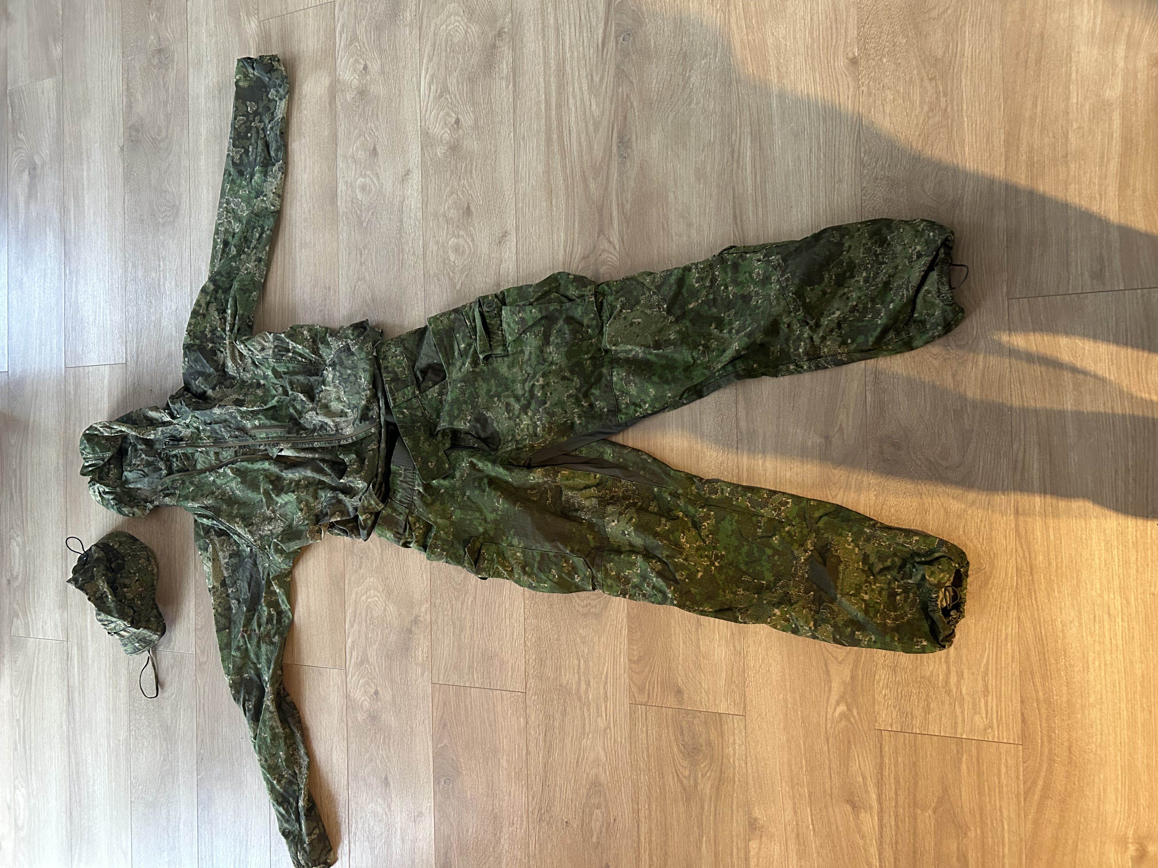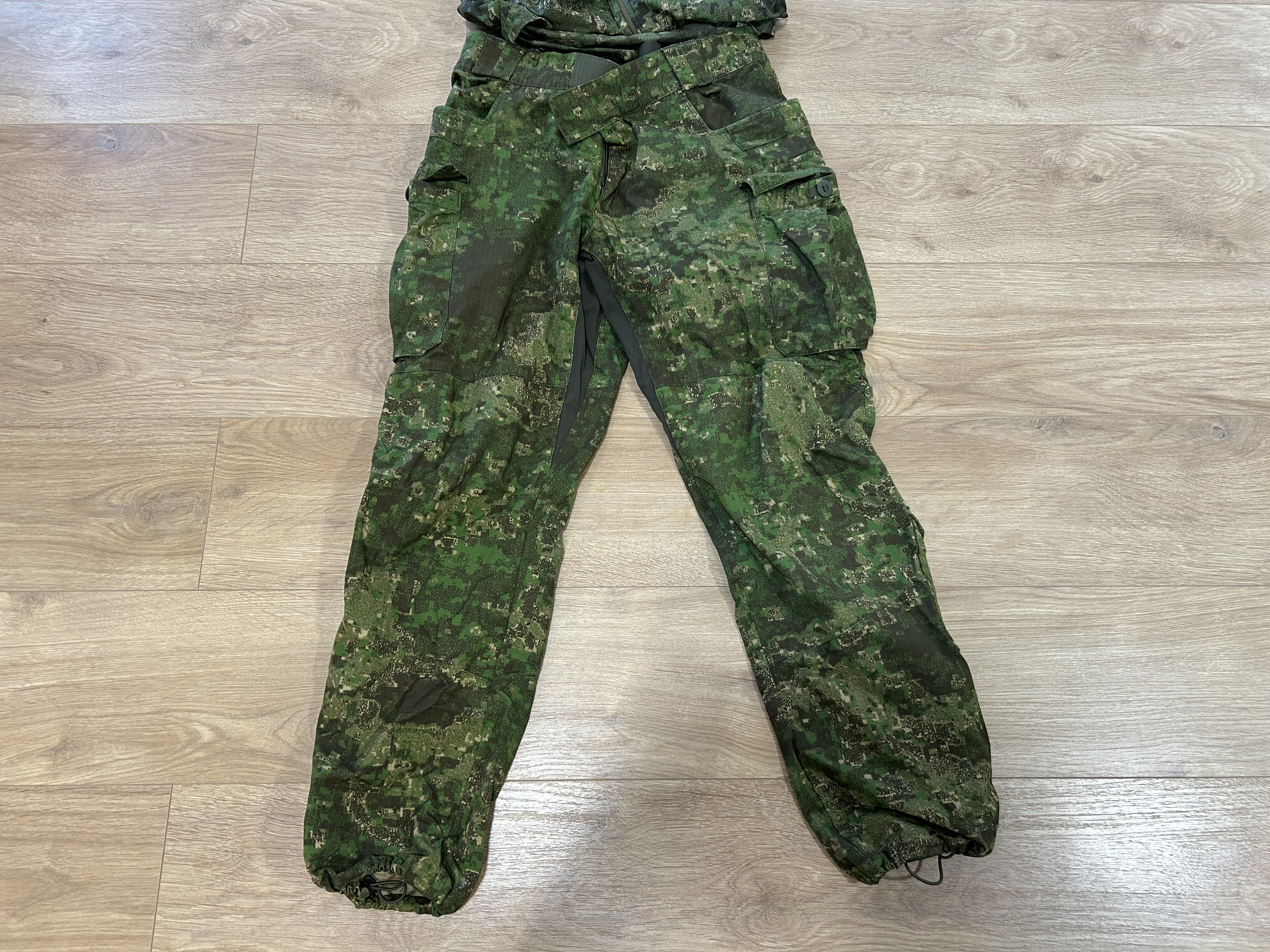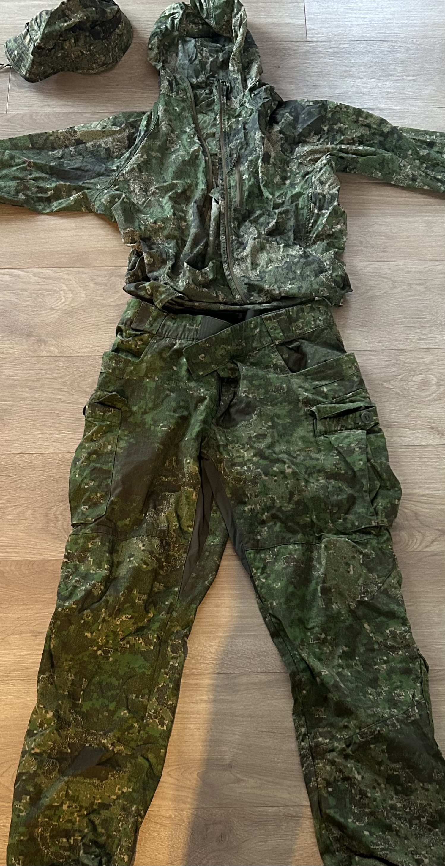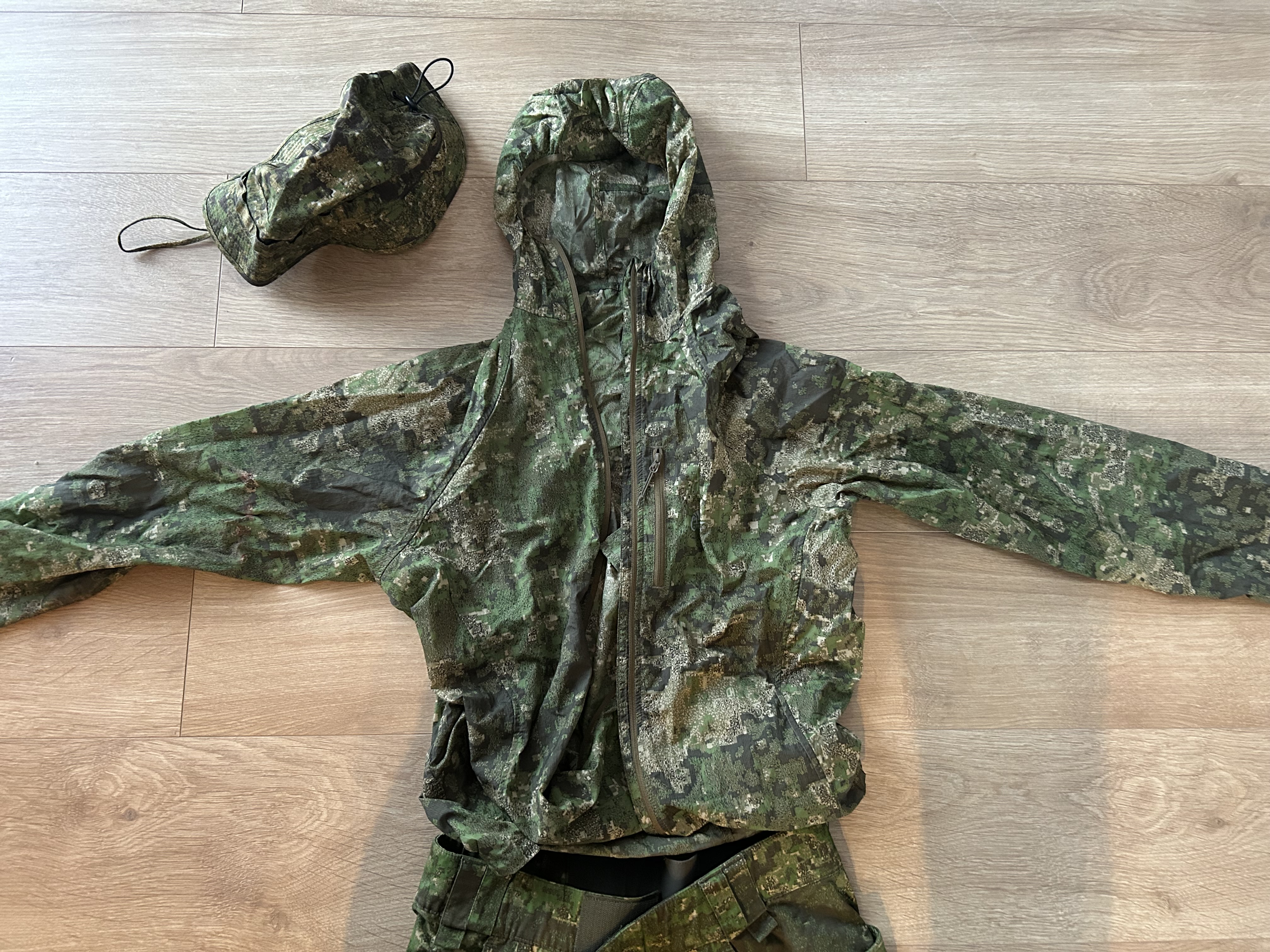 Witam. Mam do sprzedania Komplet Helikona tzn. Spodnie i kurtka w kamuflażu Pencott. Kapelusz nie jest firmy Helikon. Wszystko w bardzo dobrym stanie. Bez przetarć, zabrudzeń. Oceniam stan na bardzo dobry. Spodnie w rozmiarze L, kurtka w rozmiarze M. Spodnie mają zapięcie na rzep więc można dostosować szerokość w pasie. Posiadają również ściągacze na nogawkach. Kurtka jest cienka i bardzo lekka, ale dobrze chroni przed wiatrem. Kapelusz posiada ściągacz, dzięki czemu można dostosować go do rozmiaru głowy.