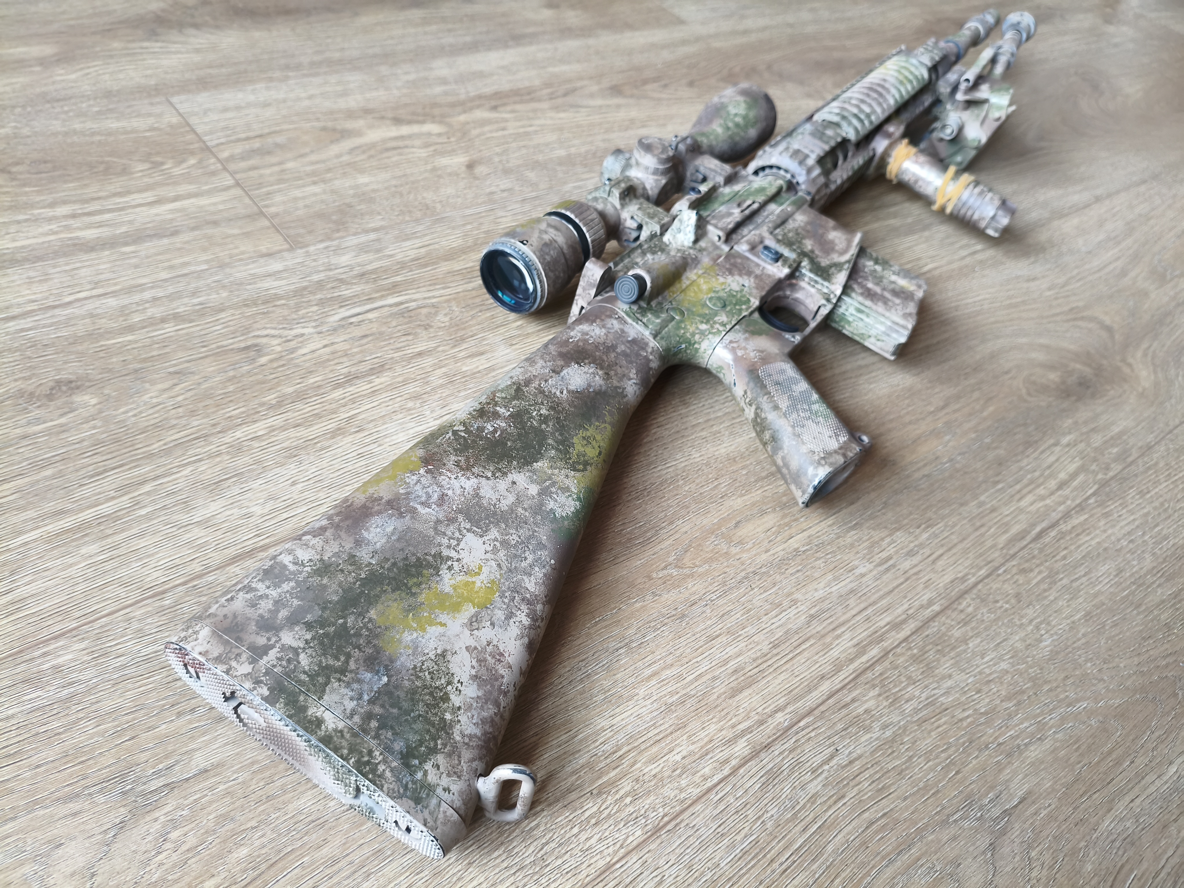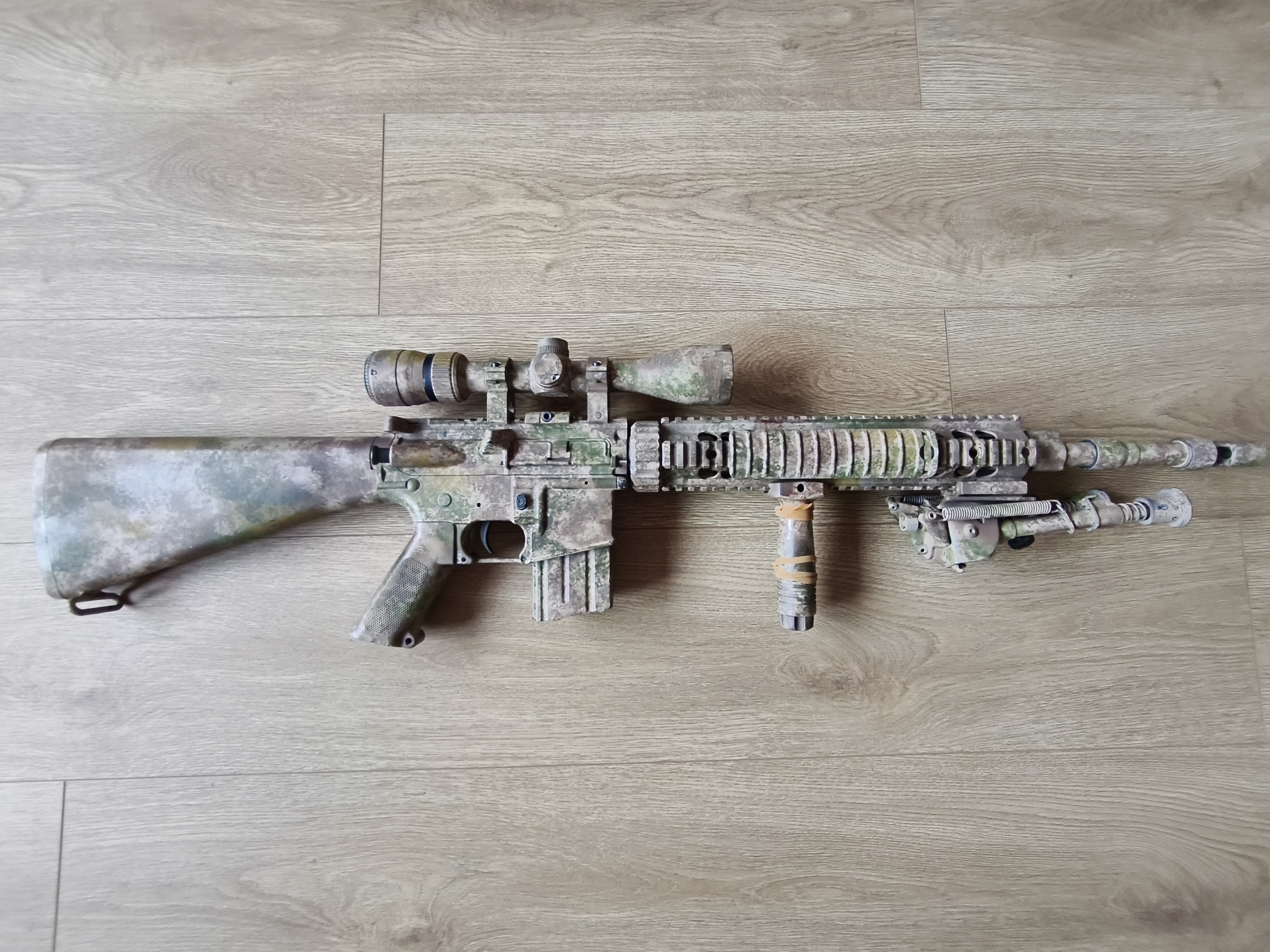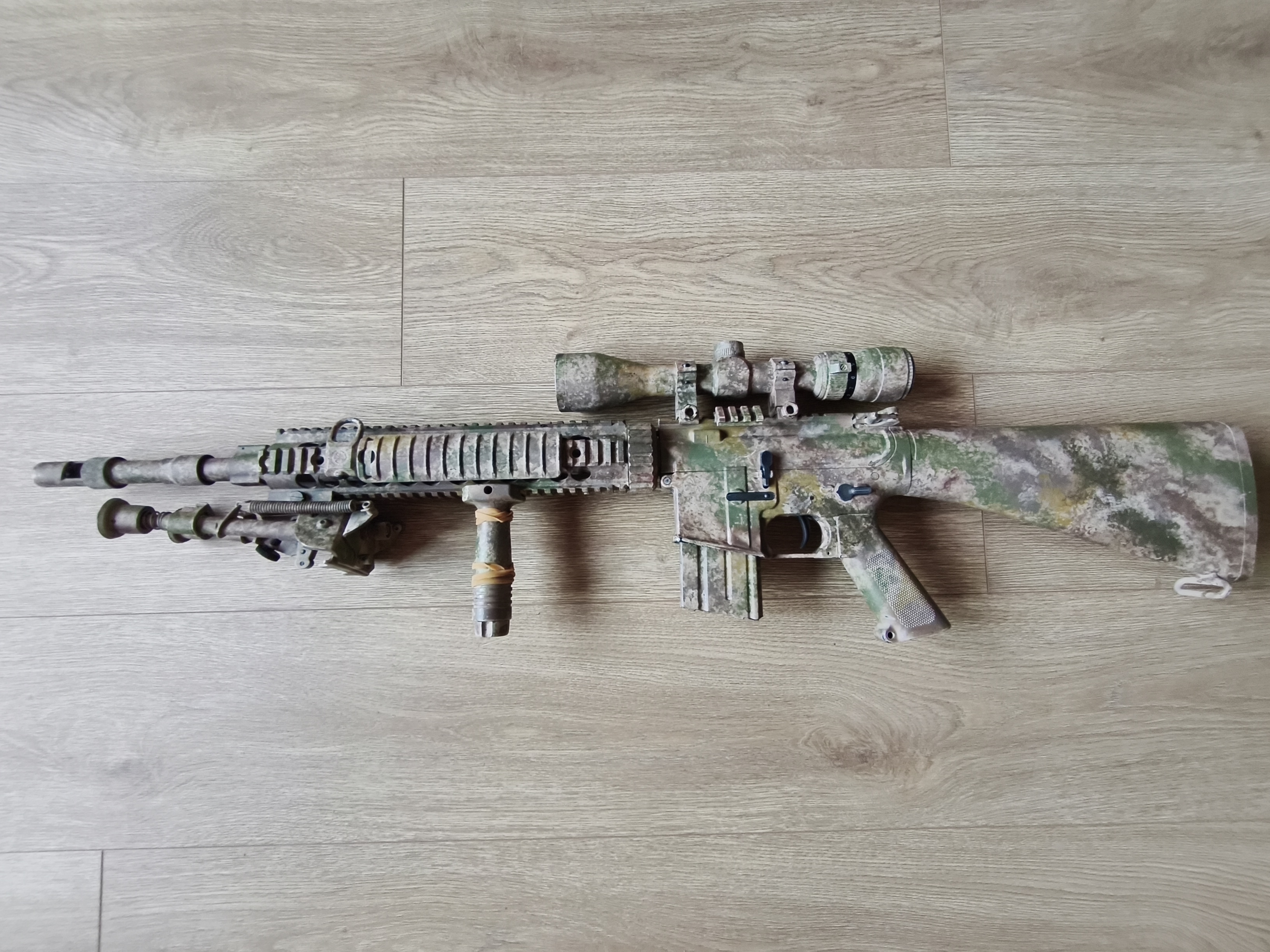 Sprzedam replikę MK-12 mod 1 od Vega Force Company z biciami Colta. Po zakupie od razu została przerobiona i posłużyła mi jako baza do legitnej DMR w HP. Obecnie została przywrócona do fabrycznej konfiguracji, czyli stockowego AEGa, na której wystrzeliła tylko kilkanaście kulek do testów na chrono. Dmucha stabilne 1,489-1,506J na kulkach 0,28g. Jest to fajna opcja na DMR, ponieważ mimo bycia repliką "zwykłej" emki 5,56, jest dopuszczona w limit 2,6J przez właściwie wszystkich orgów większych imprez w kraju. Replika pomalowana farbami Fosco. w zestawie widoczne na zdjęciach: dwójnóg, ucho zawieszenia, okładziny i chwyt pionowy. Do tego jeszcze z 2-3 krótkie magazynki i stockowy hi-cap. Luneta (Delta Optical Classic 3-9x40) nie jest częścią zestawu, ale dla zdecydowanego dorzuce ją w niższej cenie. 1200 +kw TYLKO SPRZEDAŻ!