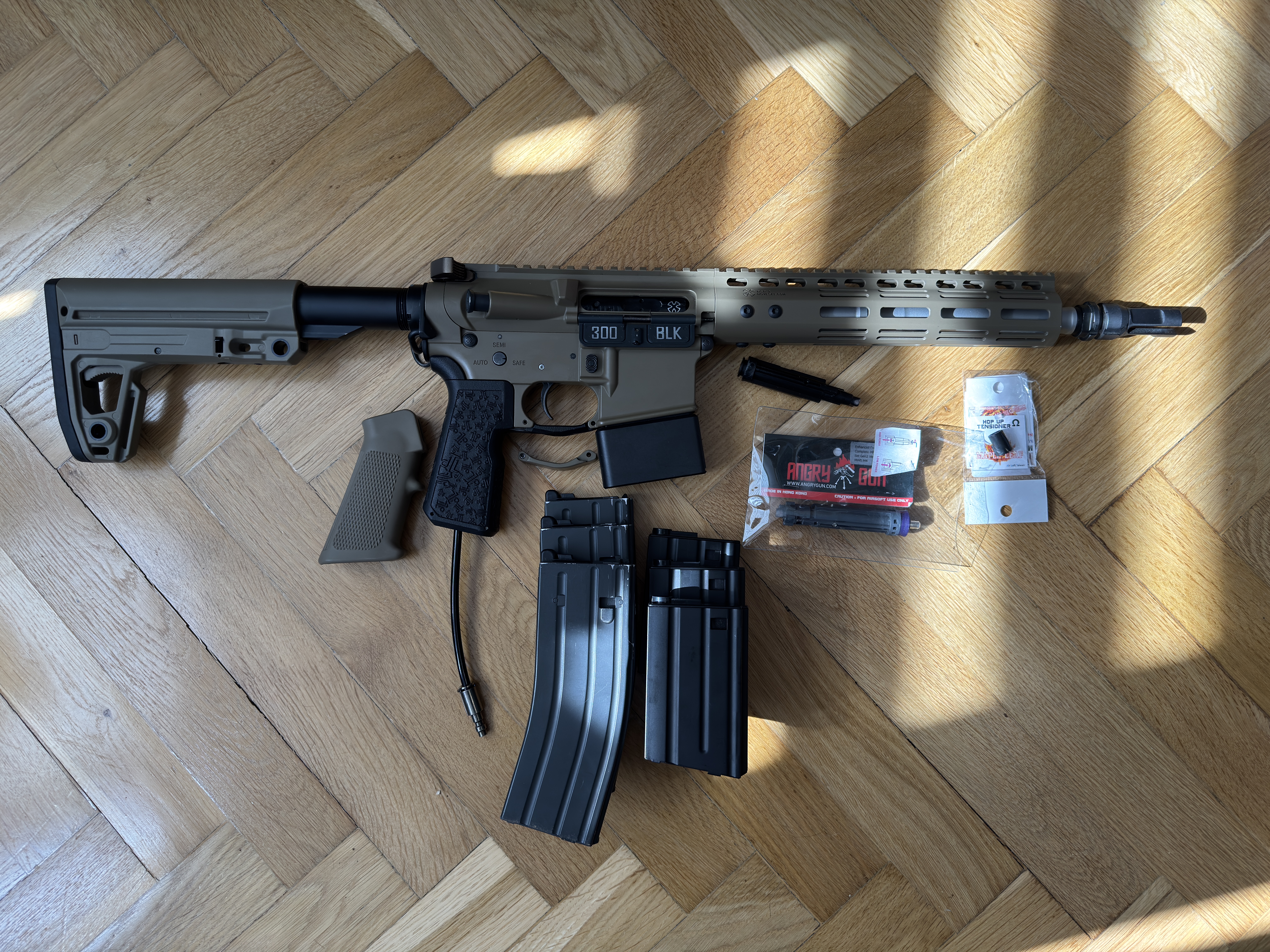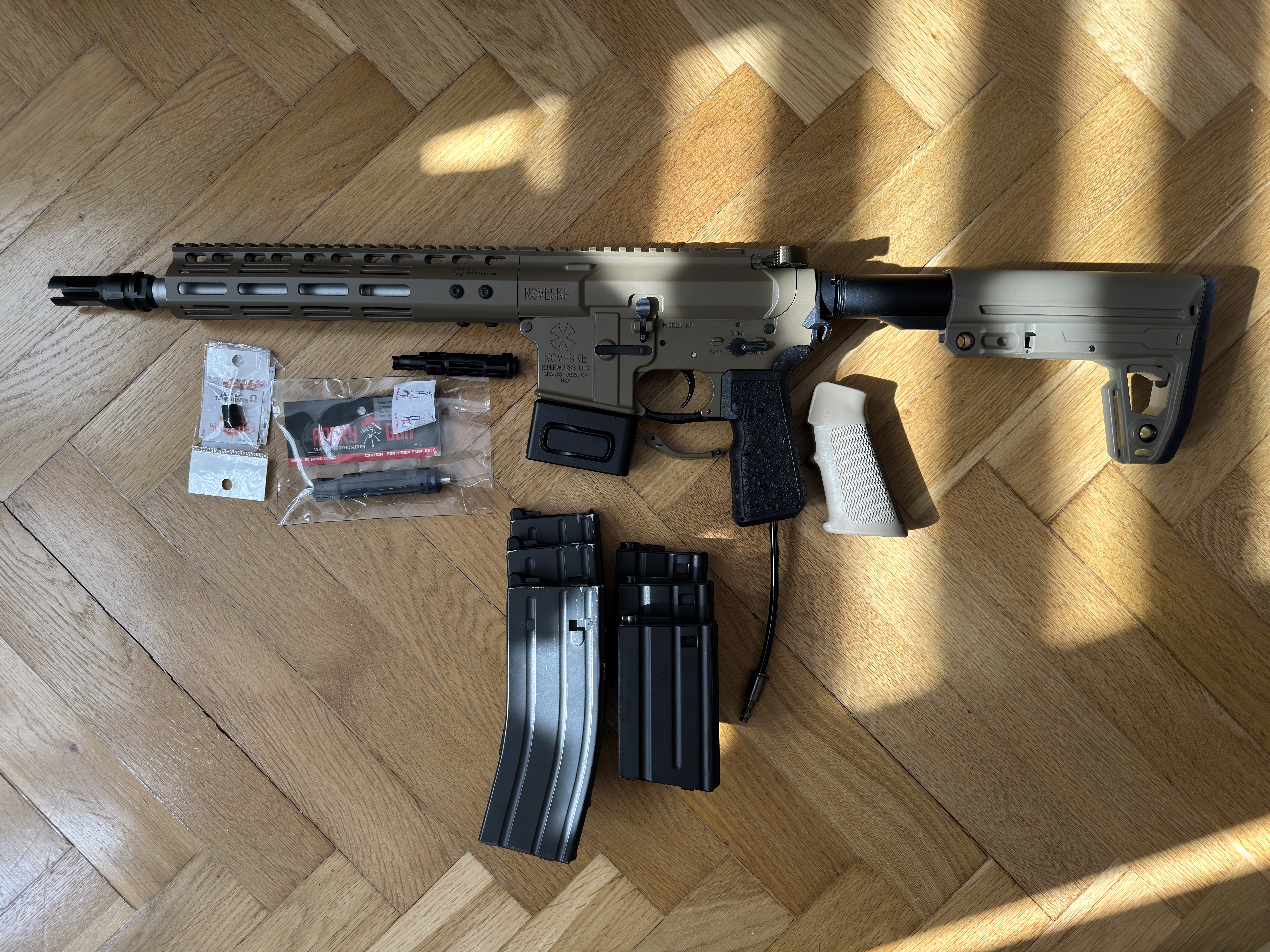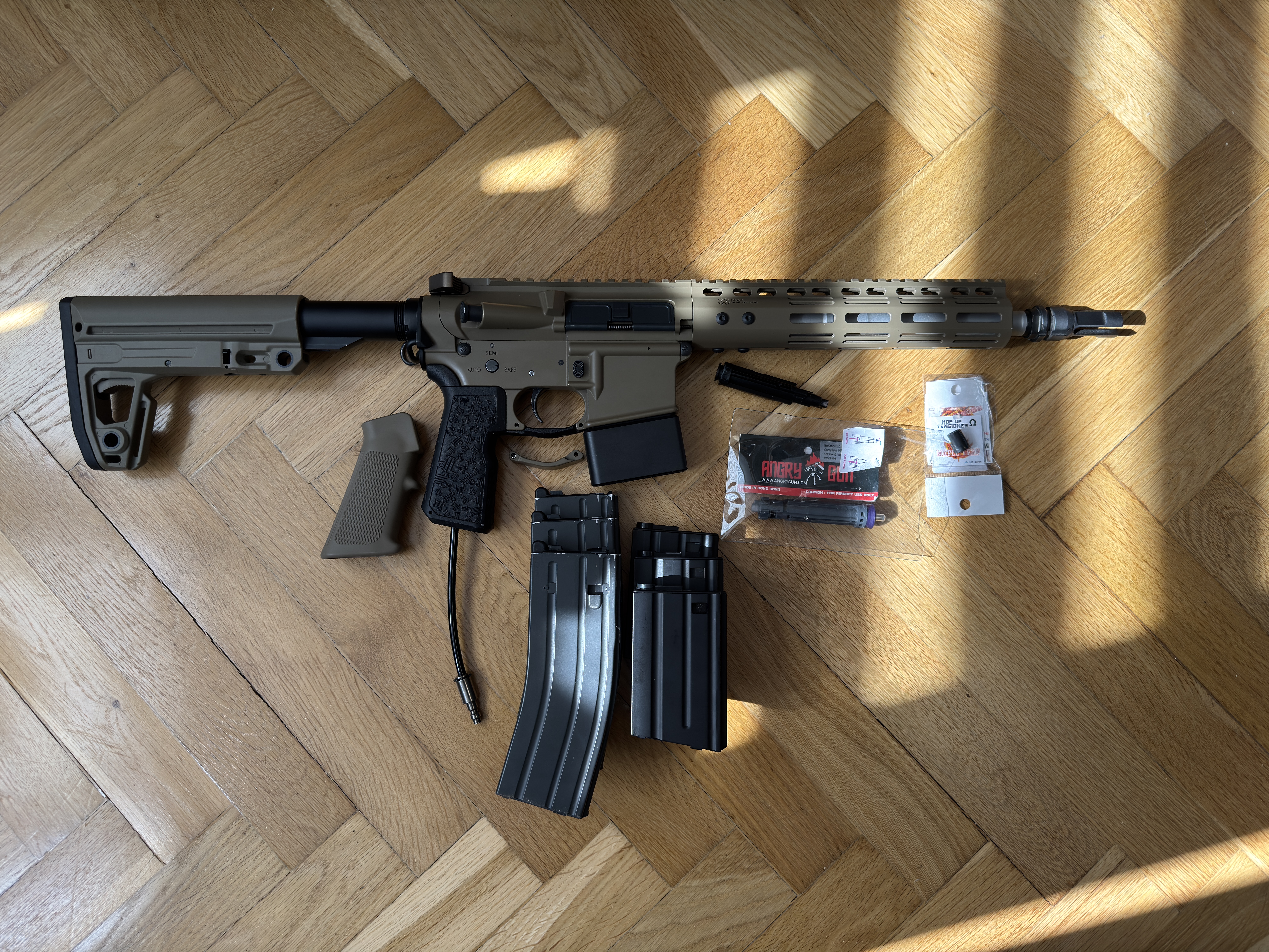 Noveske N4 MWS Gen3 GBBR (EMG, kolor Tan) Układ hop-up: - Gumka Maple Leaf MONSTER 60 –poprawiona celność i zasięg - Dystanser Maple Leaf OMEGA – lepsze skupienie i powtarzalność Magazynki GBB (Green Gas): - 3× Double Eagle MWS, 35 kulek (Black) Konwersja HPA: - Adapter Airtac (Tokyo Marui MWS / DE Noveske) - Chwyt pistoletowy HPA T1P Dead Drop Magazynki AEG: - 4× krótki stalowy magazynek 110 BB do AR-15/M4 (Double Bell, Black) Dysza z npas (upgrade): - Enhanced Drop-In Complete MPA Nozzle Set Gen 2 (do Marui MWS M4) (wcześniej uszkodzony – naprawiona, obecnie działa bez zarzutu) Dodatkowo: - Oryginalna dysza Double Eagle (również naprawiana – zapasowa)