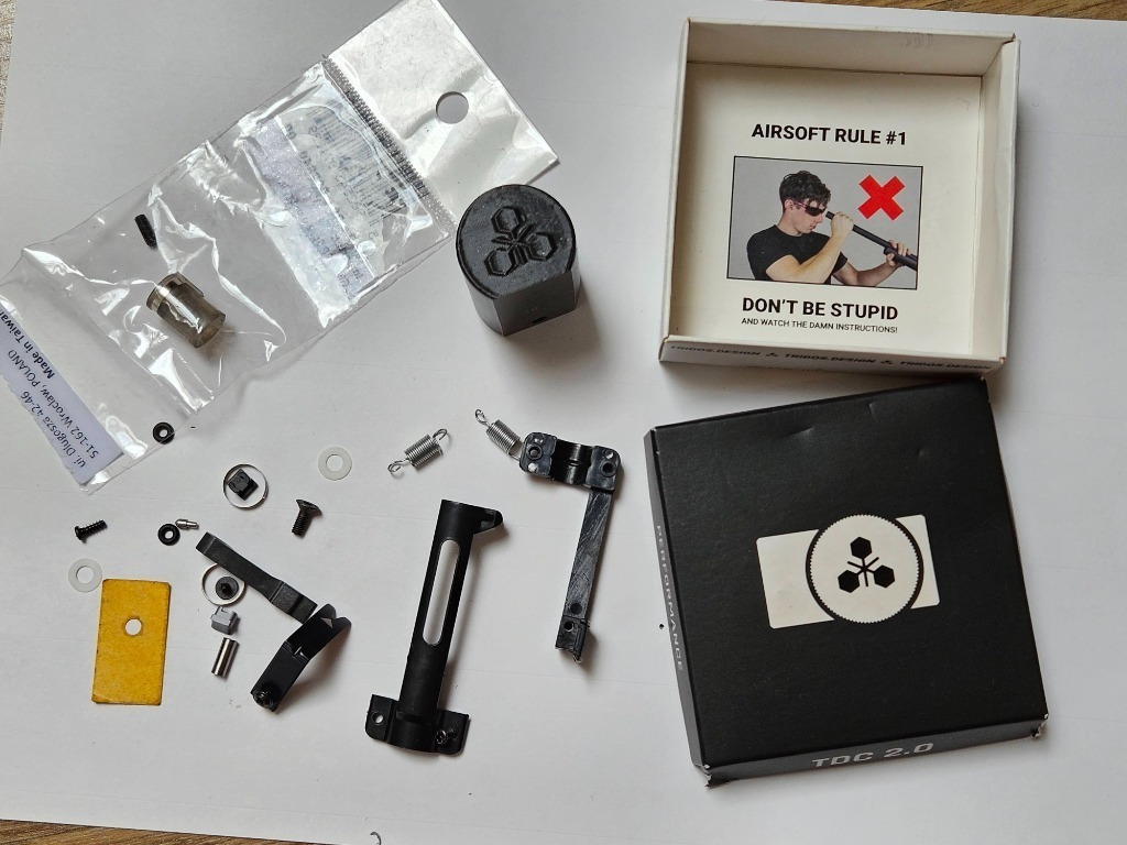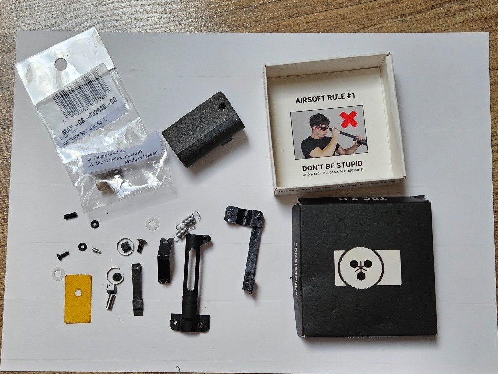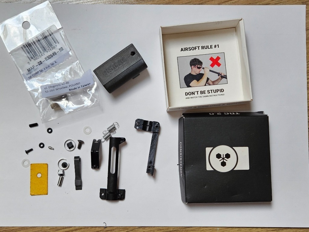 Mam na sprzedaż części komory hop-up z SSG10 po montażu TDC 2. NA sprzedaż to co na zdjęciu m.in. Hop-Up Adjuster Gen2, Hopup Chamber, zestaw zamienników sprężyn tłokowych gumka hop-up, uszczelnienia, ramie dociskowe, dystanser, elementy do montażu TDC 2.