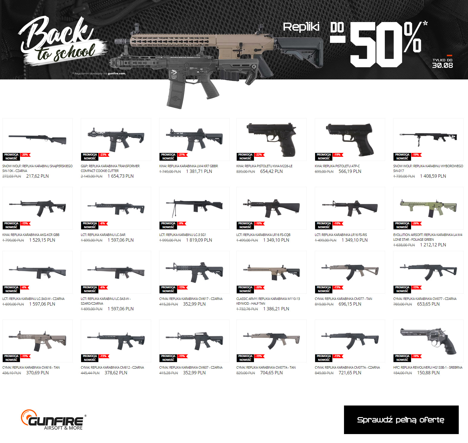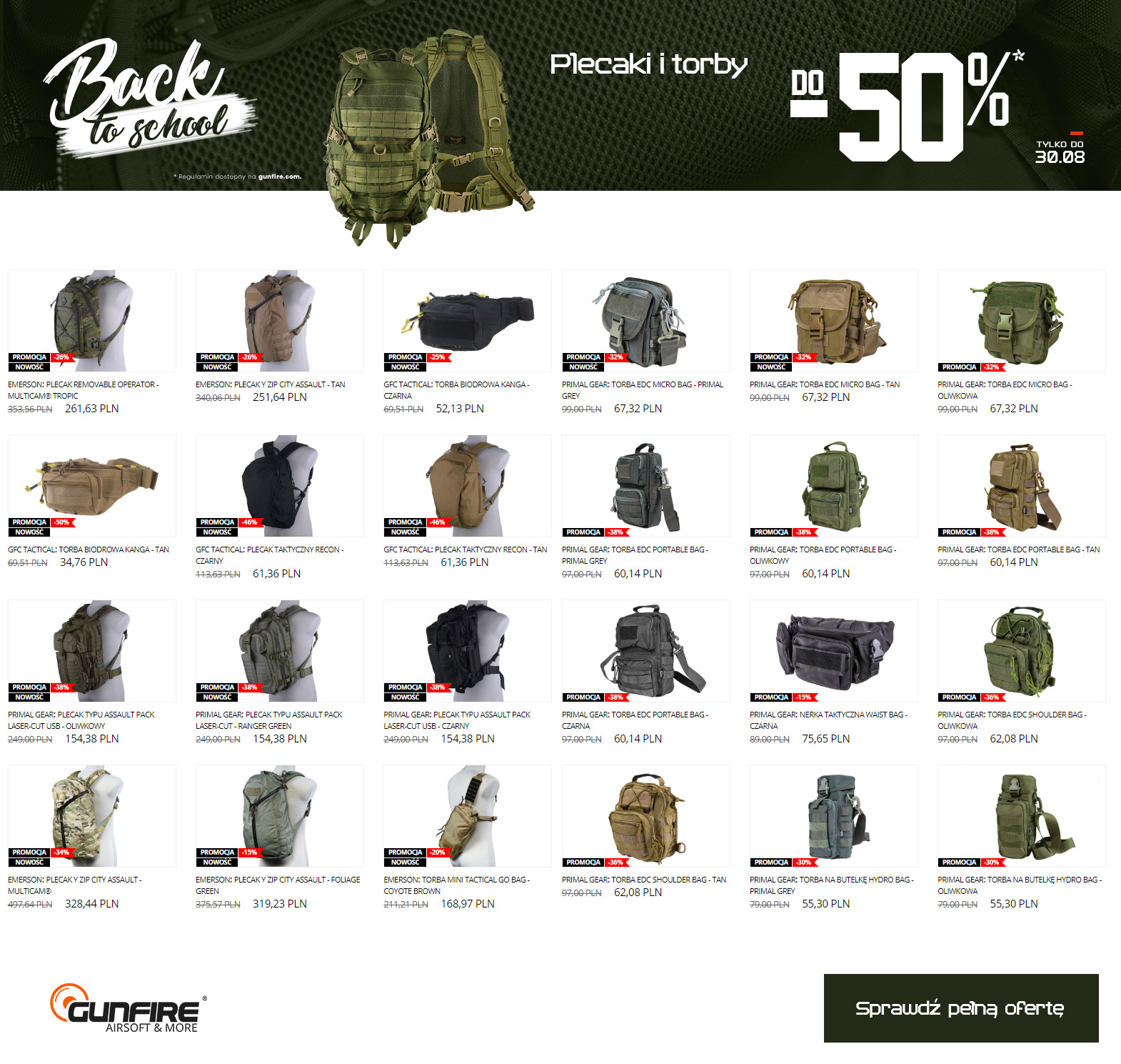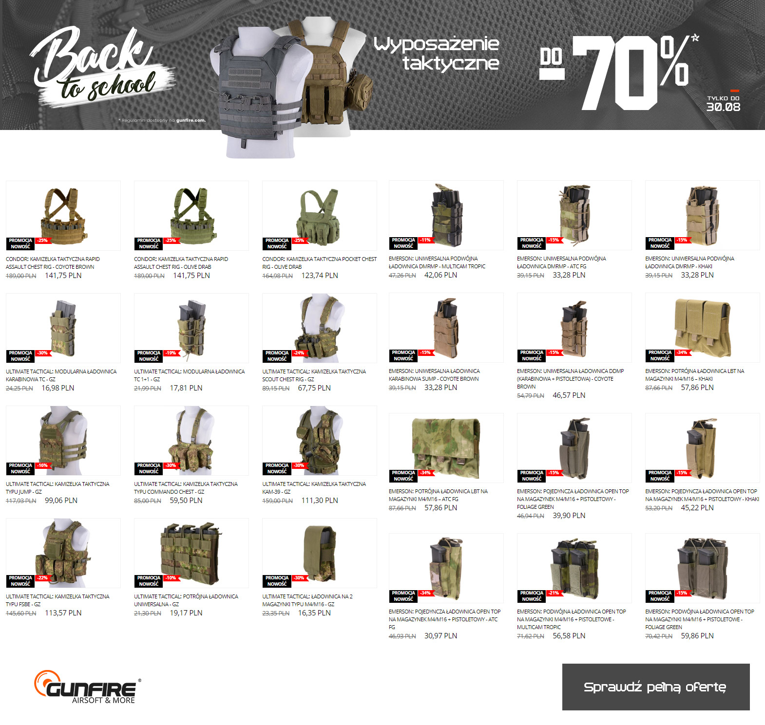 Rok szkolny zbliża się wielkimi krokami. Dlatego by poprawić Wam nastrój ruszamy z promocją Back To School i obniżamy ceny kilku tysięcy nawet do -70%. W ofercie znajdziecie plecaki oraz torby od takich marek jak Emerson, Condor czy GFC Tactical. Niektóre z nich zostały przecenione nawet o 50%. Do tego obniżyliśmy nawet do 70% ceny różnego wyposażenia taktycznego w tym kamizelek, pasów oraz hełmów oraz do 50% różne modele replik Cyma, Specna Arms czy G&G. Już teraz sprawdźcie naszą ofertę na Back To School i nie przegapcie najlepszych okazji.