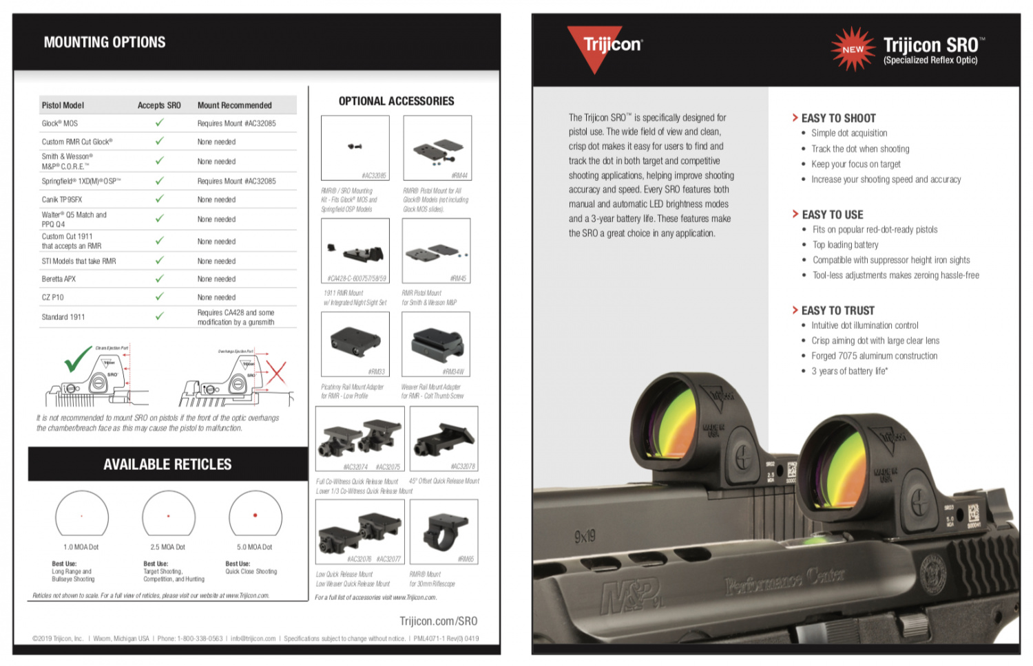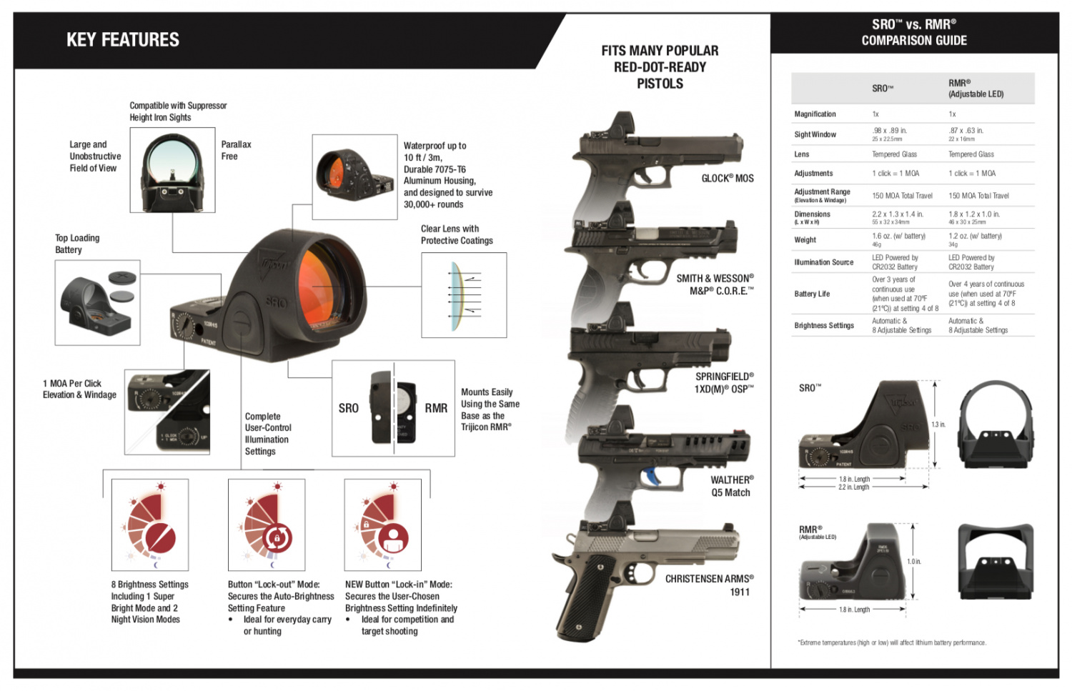 The SRO is compatible with RMR mounts and will work with the majority of pistols with which RMR was used, including Glock, S&W M&P, Walther and XDM. The dot in the SRO has the size 1MOA, the declared battery life (CR2032) is 3 years, with normal use. The collimator is waterproof to a depth of 10 feet (about 3 meters).