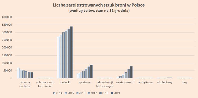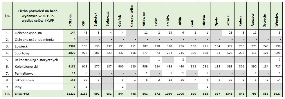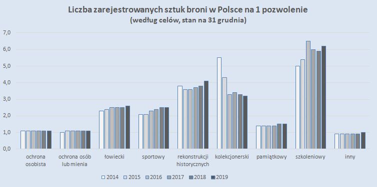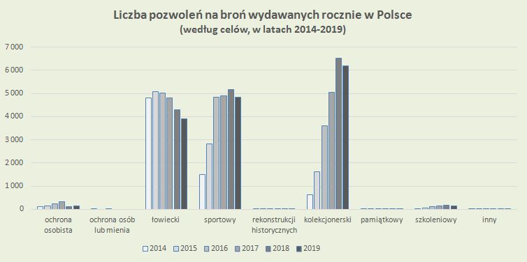 - Minimalne znaczenie w zmianach ogólnej liczby pozwoleń na broń w Polsce w 2019 r. miało 5 rodzajów pozwoleń: ochrona osób i mienia, rekonstrukcji historycznych, pamiątkowy, szkoleniowy i inny.
