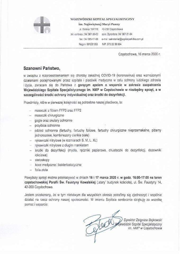 Fundacja w pierwszej kolejności odpowiedziała na prośbę Szpitala NPM w Częstochowie, zakupując w dwóch turach dla oddziału epidemiologicznego 13 par okularów ochronnych i 15 sztuk przyłbic.