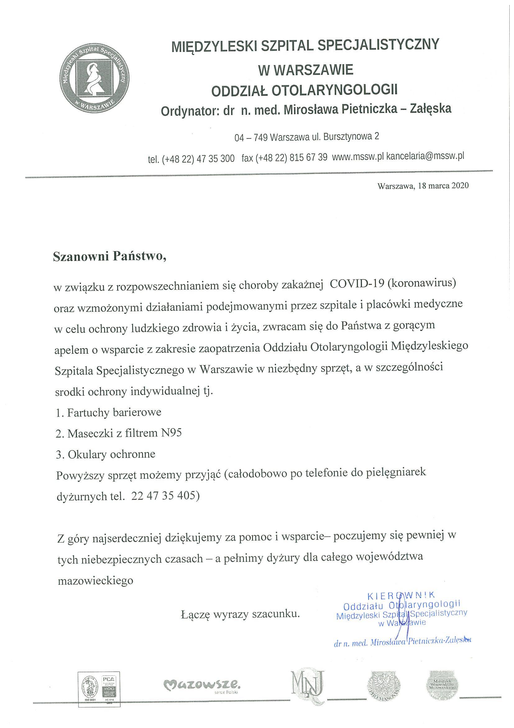 Kolejnym celem jest zakup za blisko 50tys. złotych, 1000 profesjonalnych masek N95 oraz masek klasie FPP3 dla Międzyleskiego Szpitala Specjalistycznego w Warszawie.