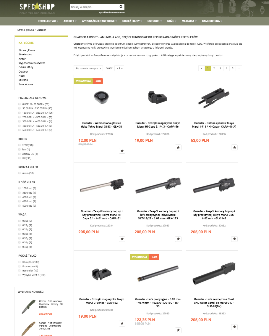 Do SpecShop.pl dotarła dostawa akcesoriów do replik od Guardera. Poza częściami zamiennymi do popularnych platform 1911, Hi-Capa, Glock i P226 pojawiły się również akcesoria do tuningu wizualnego. Lufy zewnętrzne w kolorze Titan przeznaczone do Glocków w standardzie Tokyo Marui, grawerowany zamek New World Order Commemorative oraz metalowe szkielety do Beretty, Detonicsa i innych. Ponadto znajdziecie tam silniki, sprężyny, zębatki lufy precyzyjne i wiele więcej.