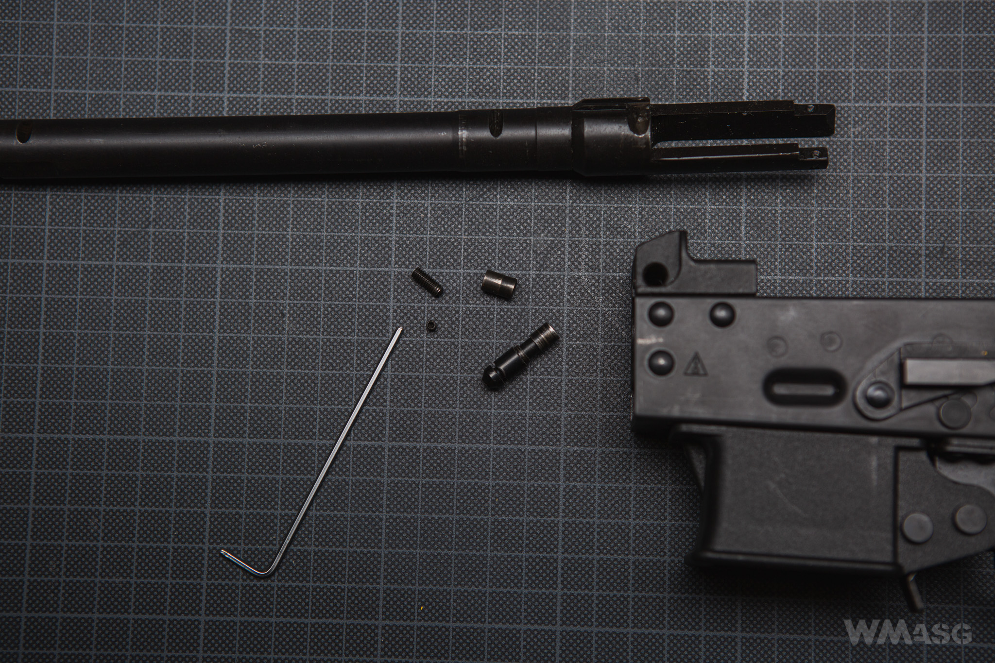 Konieczny jest demontaż nakładki i łoża. Od przodu należy wykręcić wkręt dociskowy (czerwona strzałka) i zdemontować nietypowy kołek osadczy lufy. Drugi wkręt dociskowy (biała strzałka) stabilizuje lufę o góry.