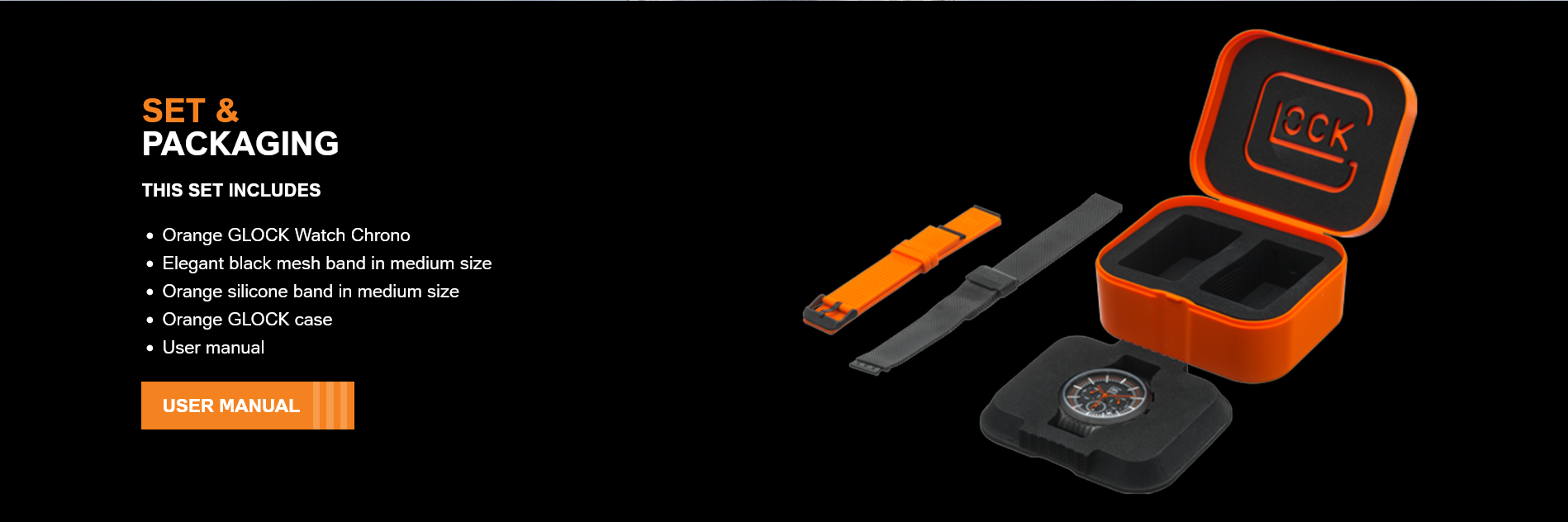 Czasomierz Glocka ma formę eleganckiego klasycznego, zasilanego słonecznie zegarka z pomarańczowymi, luminescencyjnymi wskazówkami. Kopertę zegarka wykonano z tytanu, na której zamontowano szafirowe szkło. Kopertę zegarka zdobią delikatne nacięcia, które przywodzą na myśl te, które możemy znaleźć na zamkach pistoletów legendarnego austriackiego producenta.