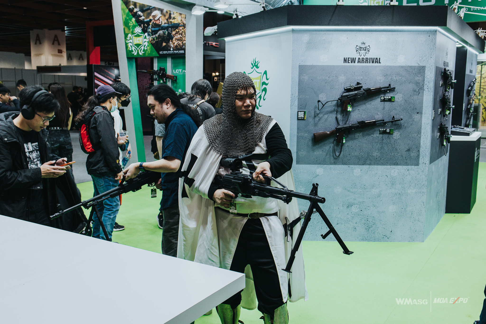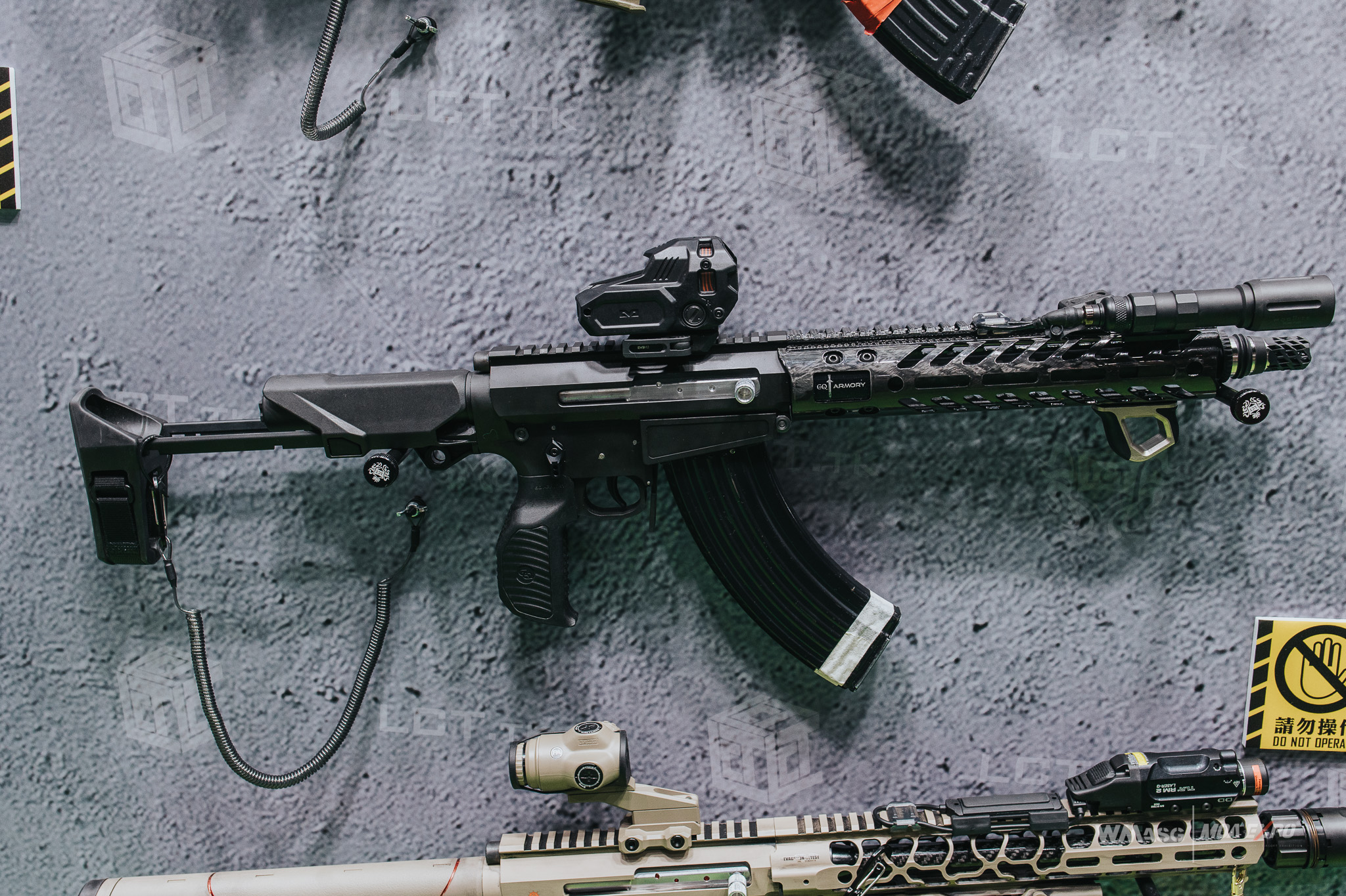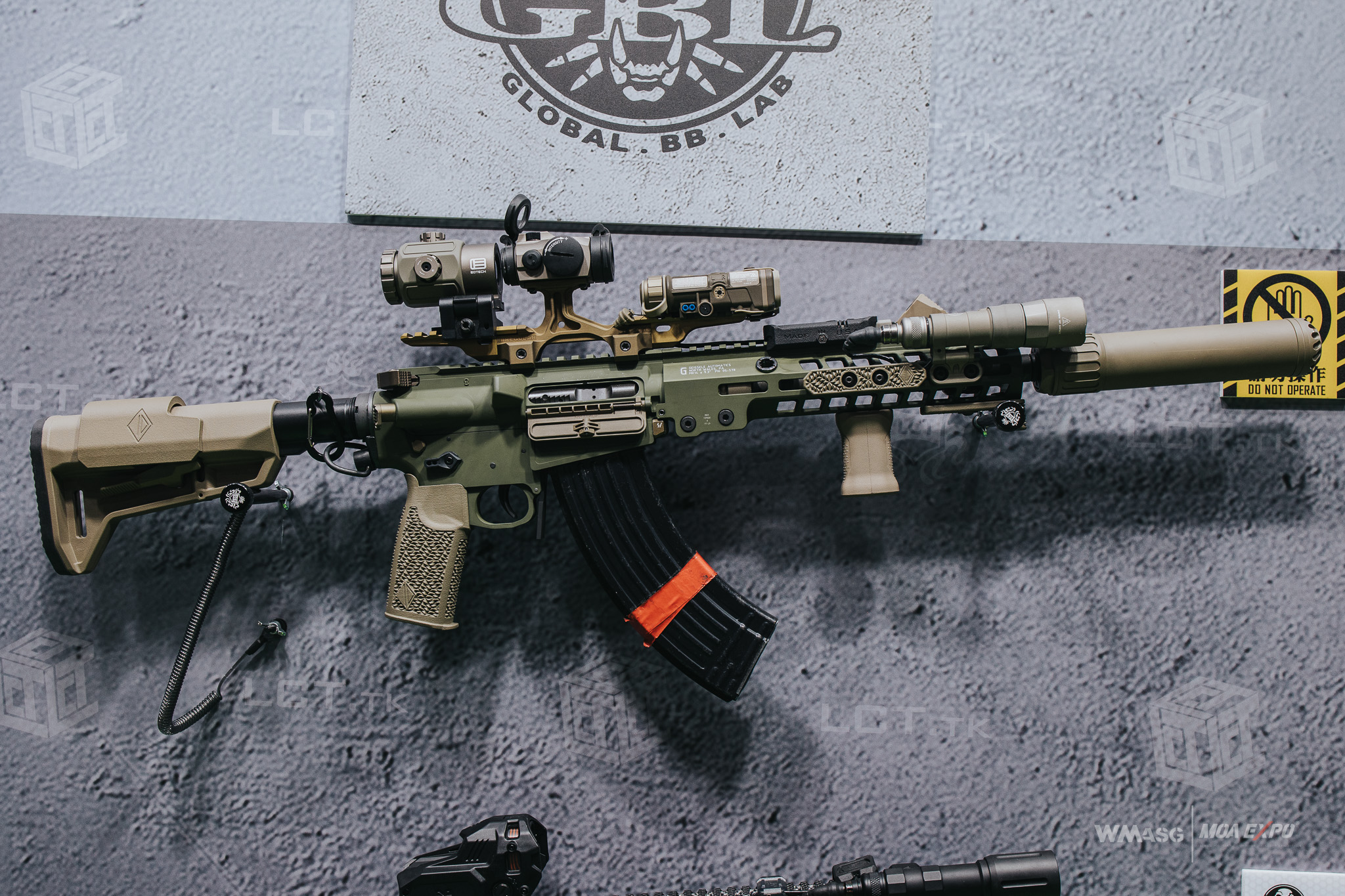Pewnym zaskoczeniem było pojawienie się kompletnie nowego typu repliki na stoisku LCT Airsoft. Mowa tutaj o replice przypominającej karabinka Mk.47 (nie jest to idealna kopia konstrukcji CMMG). Pod oznaczeniami AR-AK znajdziemy efekt współpracy marki Global BB Lab (GBL) znanej, chociażby z repliki ukraińskiej konwersji KRUK (Global BBs Lab z taktycznym zestawem konwersji "Kruk" dla AK). Same repliki łączą w sobie elementy dwóch platform: AR (ogólny zarys karabinka AR, prowadnica z kolbą, chwyt pistoletowy, selektor, łoże) oraz AK (magazynki, części wewnętrzne, sposób przeładowania). Jak można zauważyć na zdjęciach, przedstawiono dwa warianty repliki, gdzie jeden posiada odwzorowany komorę zamkową, zamek, dźwignię przeładowania oraz klapkę wyrzutnika łusek od AR oraz drugi wariant posiadający wyraźnie inną komorę zamkową, inny zespół zamka ze stałą dźwignią.