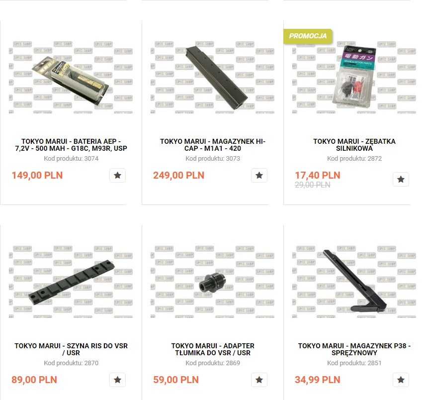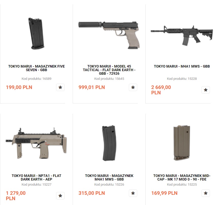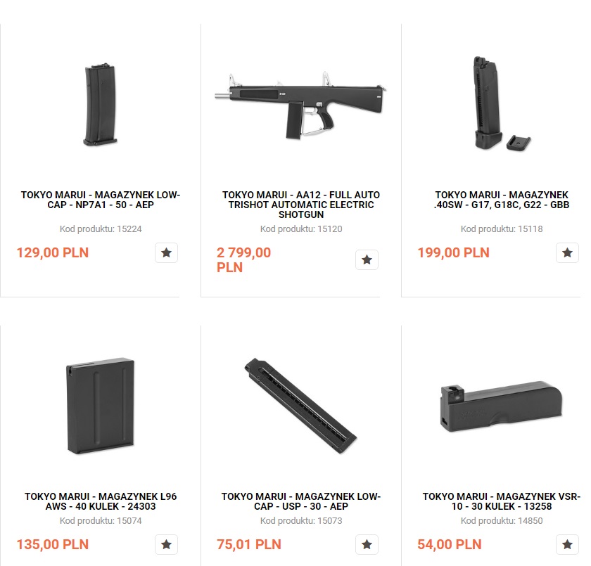 Oferta obejmuje między innymi takie produkty od firmy Tokyo Marui jak repliki (wśród nich znajdziemy MP7, AA12, VSR i M4), magazynki i części zamienne.
