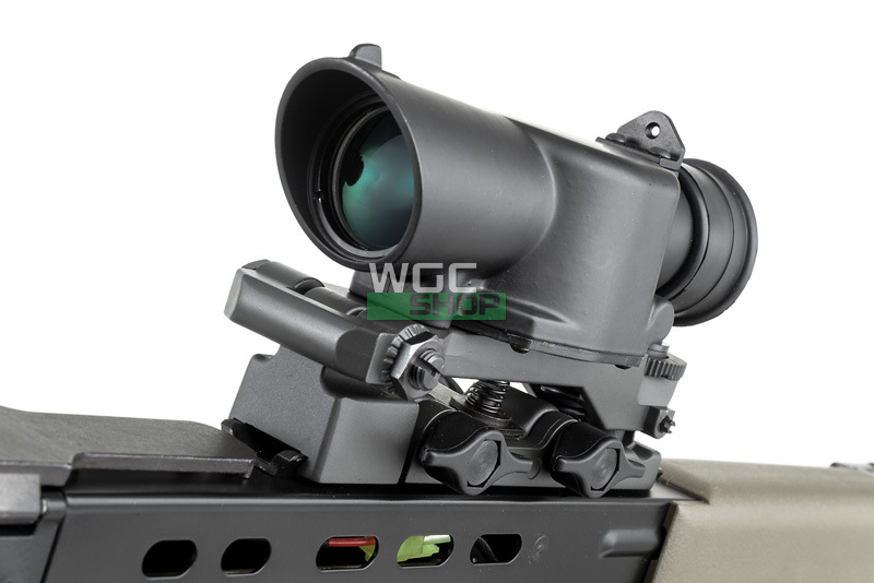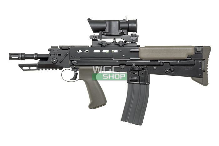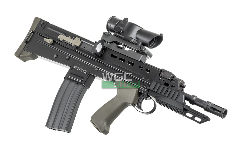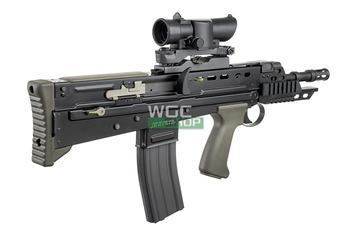 Wewnątrz znajdziemy gearbox typu 2 oraz lufę wewnętrzną o długości 300 mm. Do zestawu dołączona jest luneta typu SUSAT o czterokrotnym przybliżeniu i magazynek typu hi-cap o pojemności 450 kulek. L85 generuje prędkość wylotową na poziomie 360-380 fps na kulkach 0,2 g.