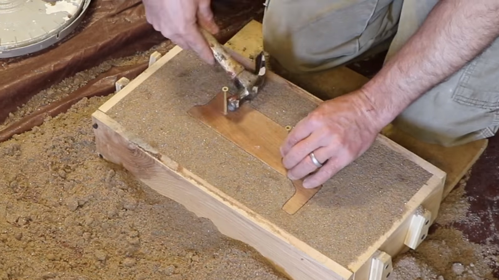 Pierwszym krokiem było stworzenie formy, która pozwoli odlać wstępną wersję elementu. W tym celu przygotował drewniany model, który umieścił w piasku do odlewów tak aby zrobić z niego matrycę.