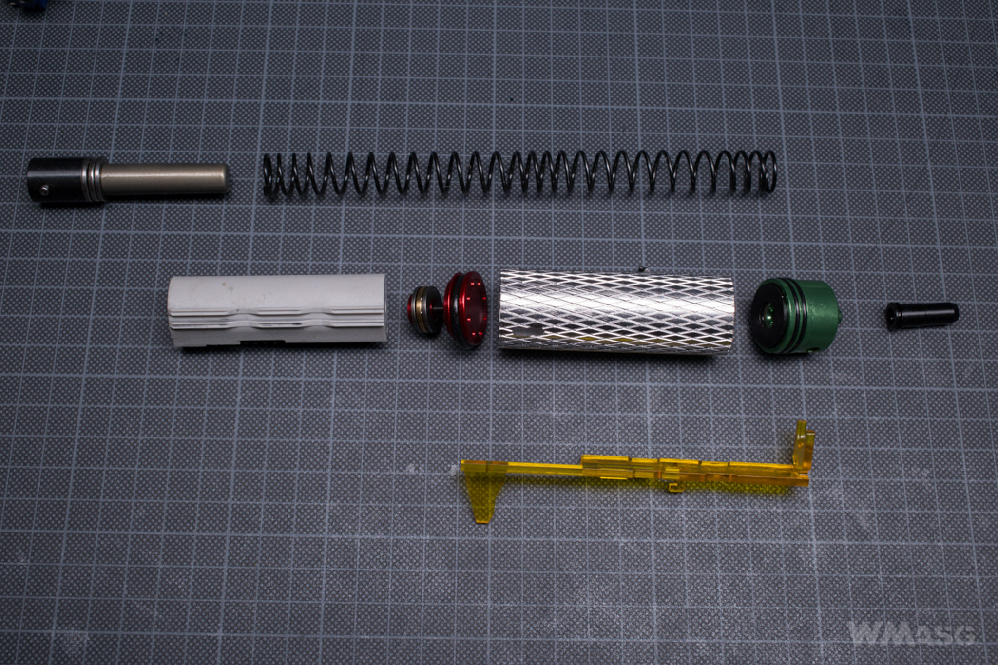 Komora wykonana jest z tworzywa i posiada regulację pokrętłem wokół osi lufy. Fabrycznie zamontowano ramię dociskowe z zaokrąglonym elementem roboczym. W zestawie z repliką otrzymujemy dodatkowe ramię, którego kształt przystosowany jest do współpracy z klasycznym walcowatym dystanserem. Komora jest dociskana do gearboxa stożkową sprężyną nałożoną na lufę (szerszą stroną w kierunku wylotu lufy).