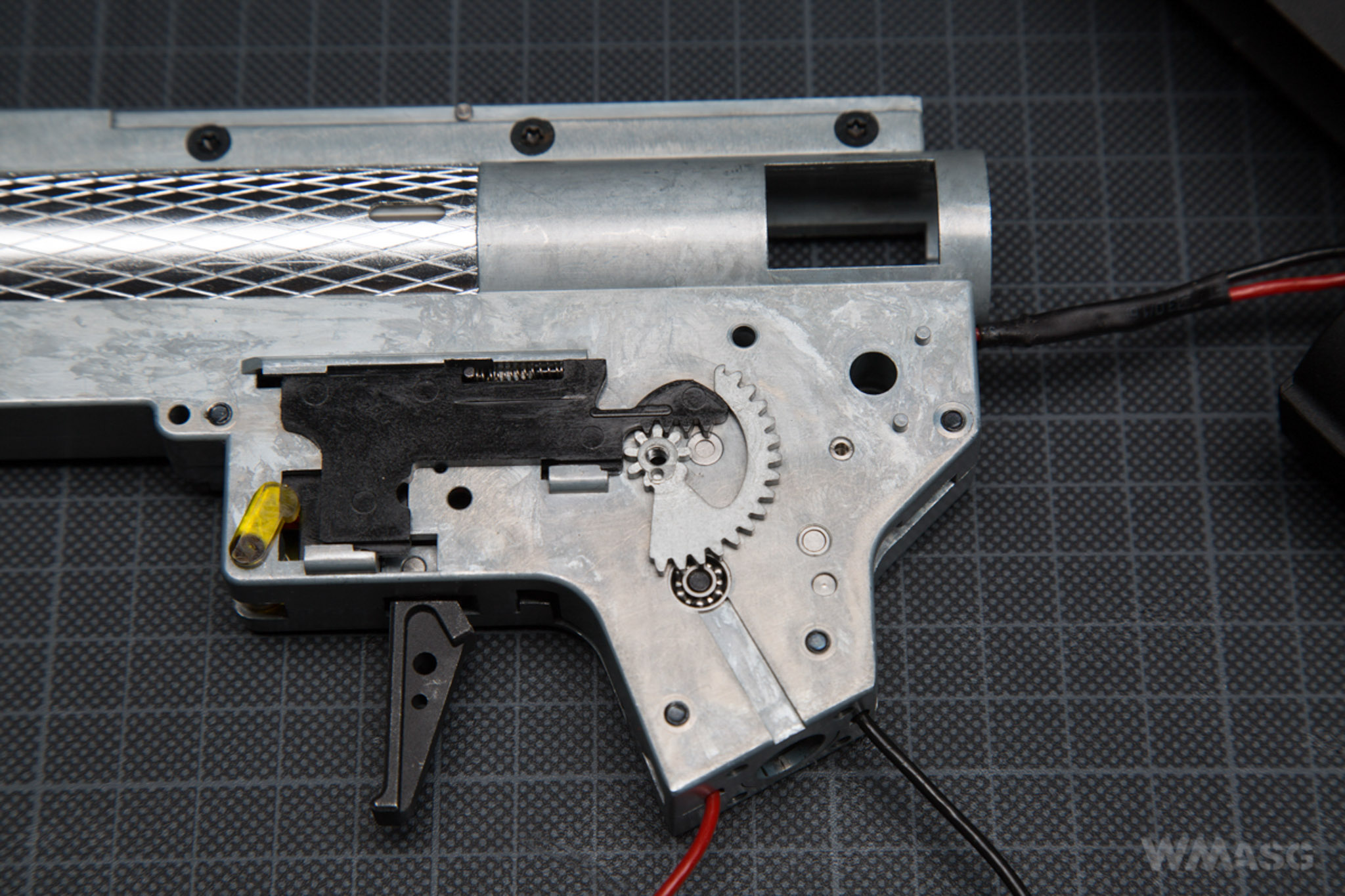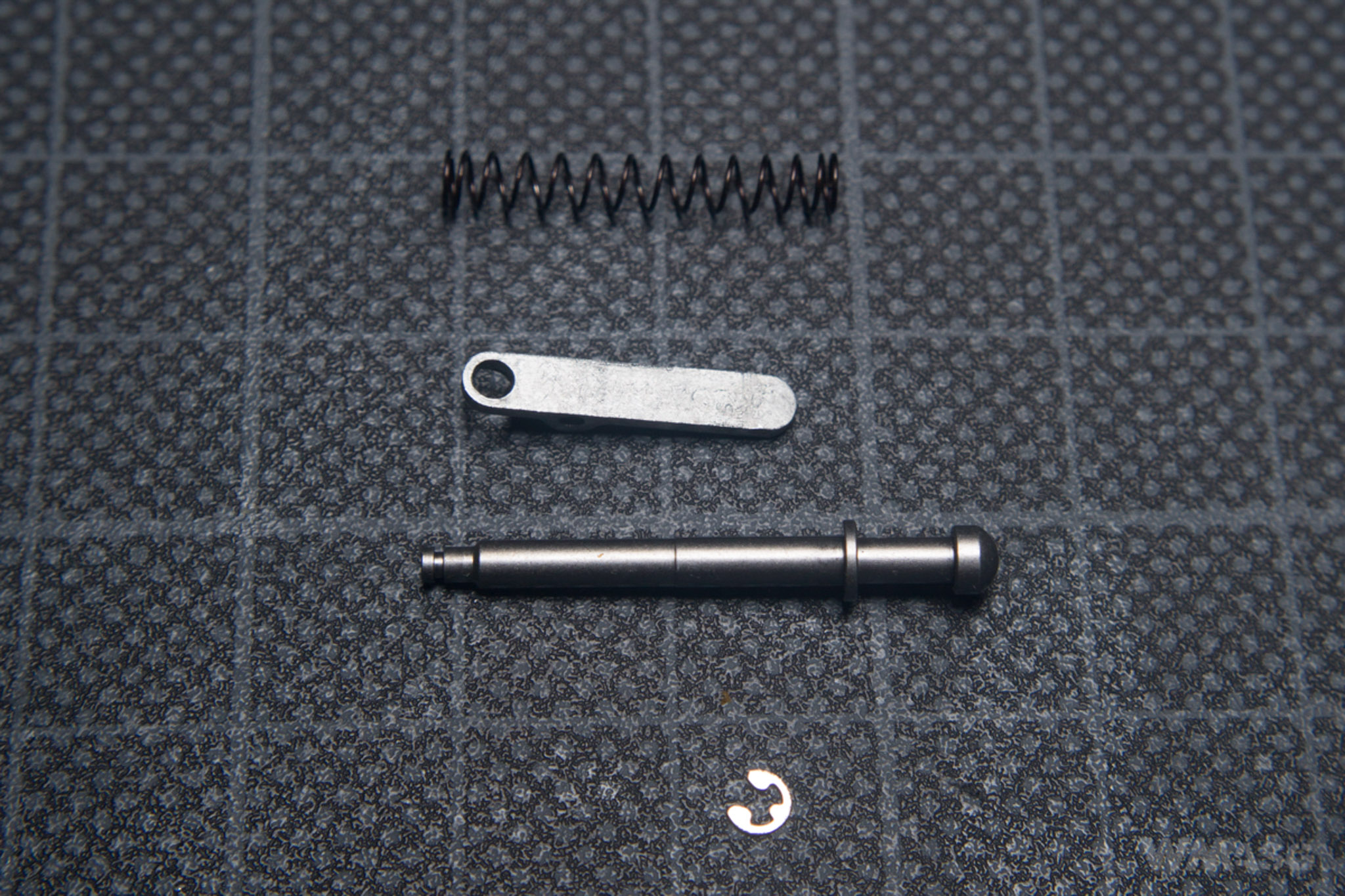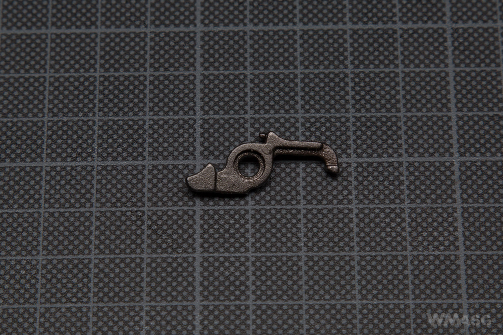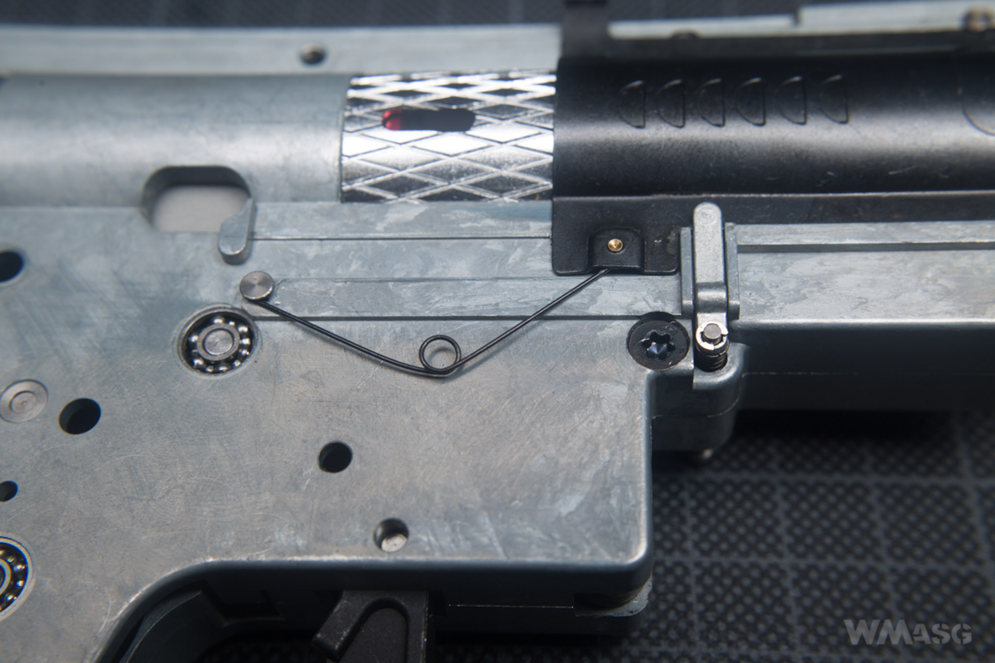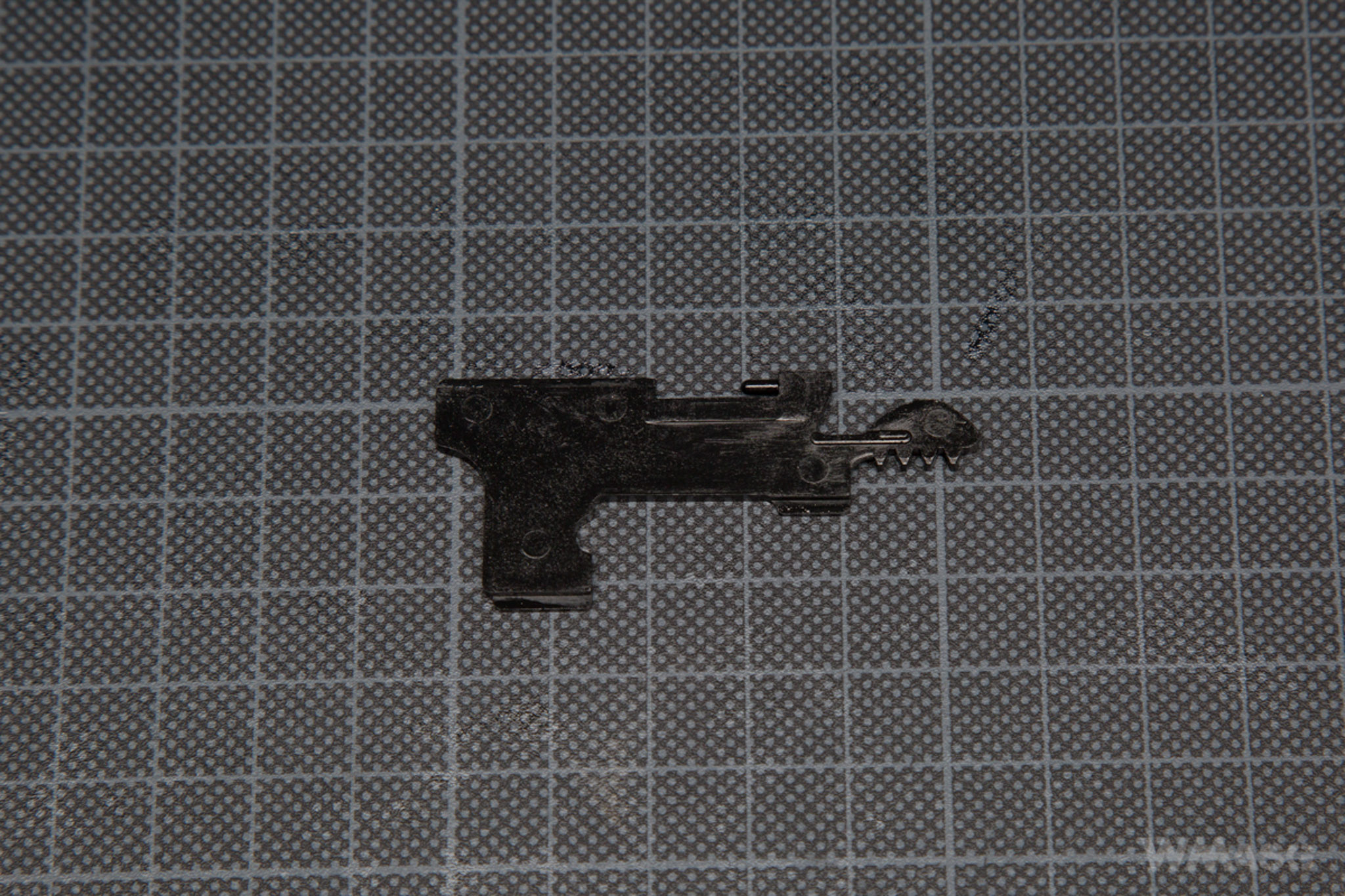 Według mnie stanowczo zbyt zegarmistrzowski w konstrukcji i wymiarach – pierścień Seegera utrzymujący na miejscu sprężynkę zatrzasku ma niecałe 3mm średnicy zewnętrznej. Zgubić lub skrzywić łatwo. Zdjąć trudno. Założyć jeszcze trudniej. Niestety demontaż zatrzasku jest niezbędny do otwarcia gearboxa. Pomysł na mocowanie sprężynki odpowiadającej za powrotny ruch atrapy zamka równie zegarmistrzowski.