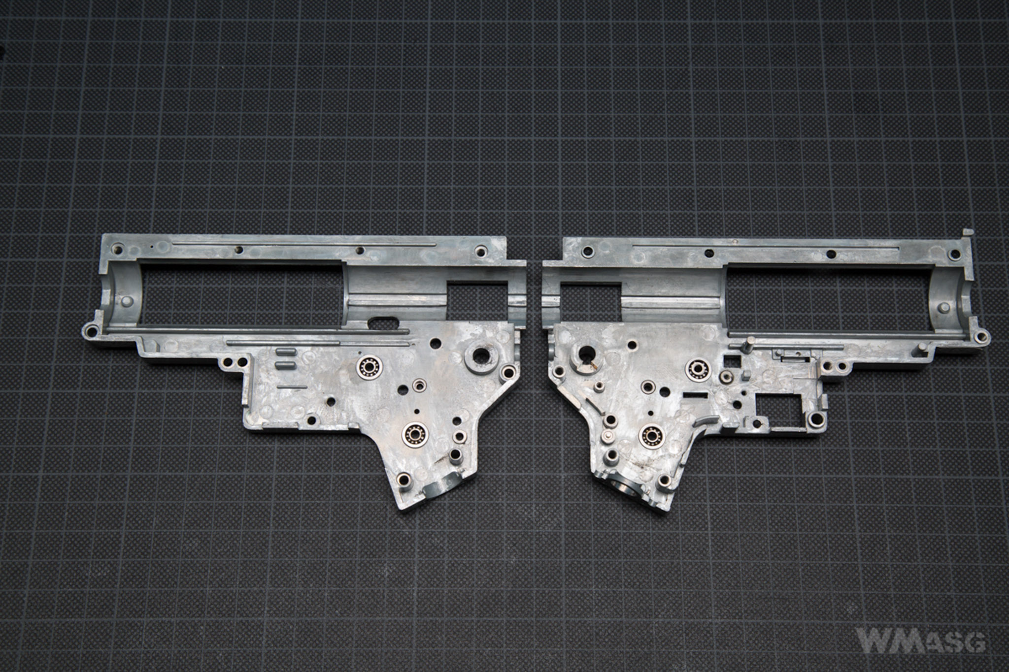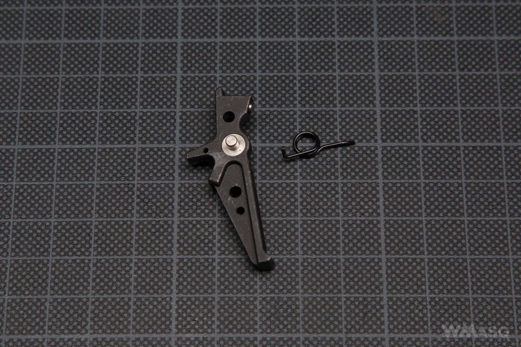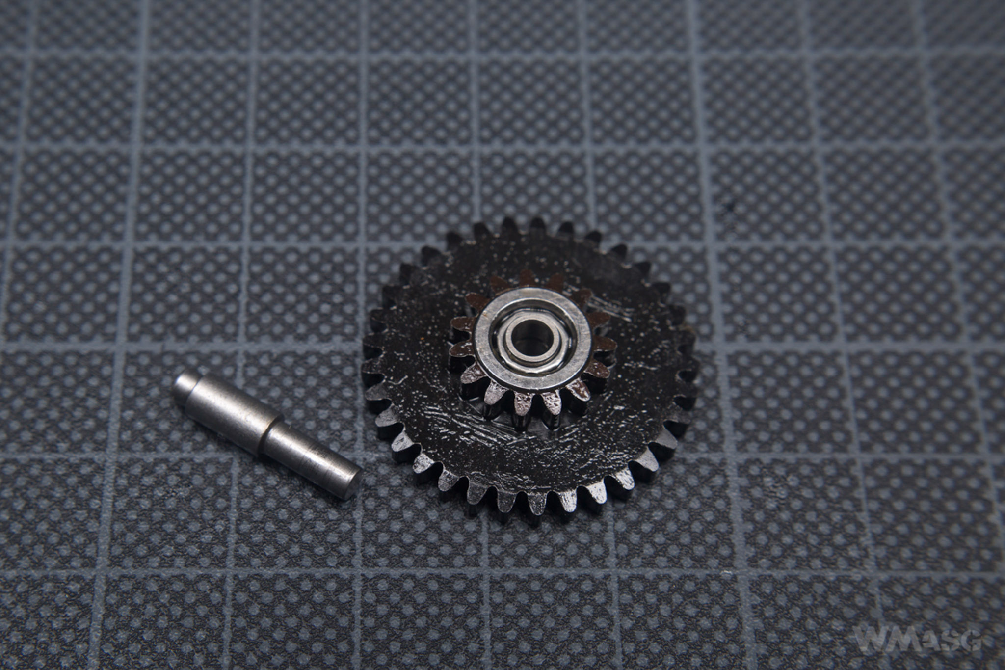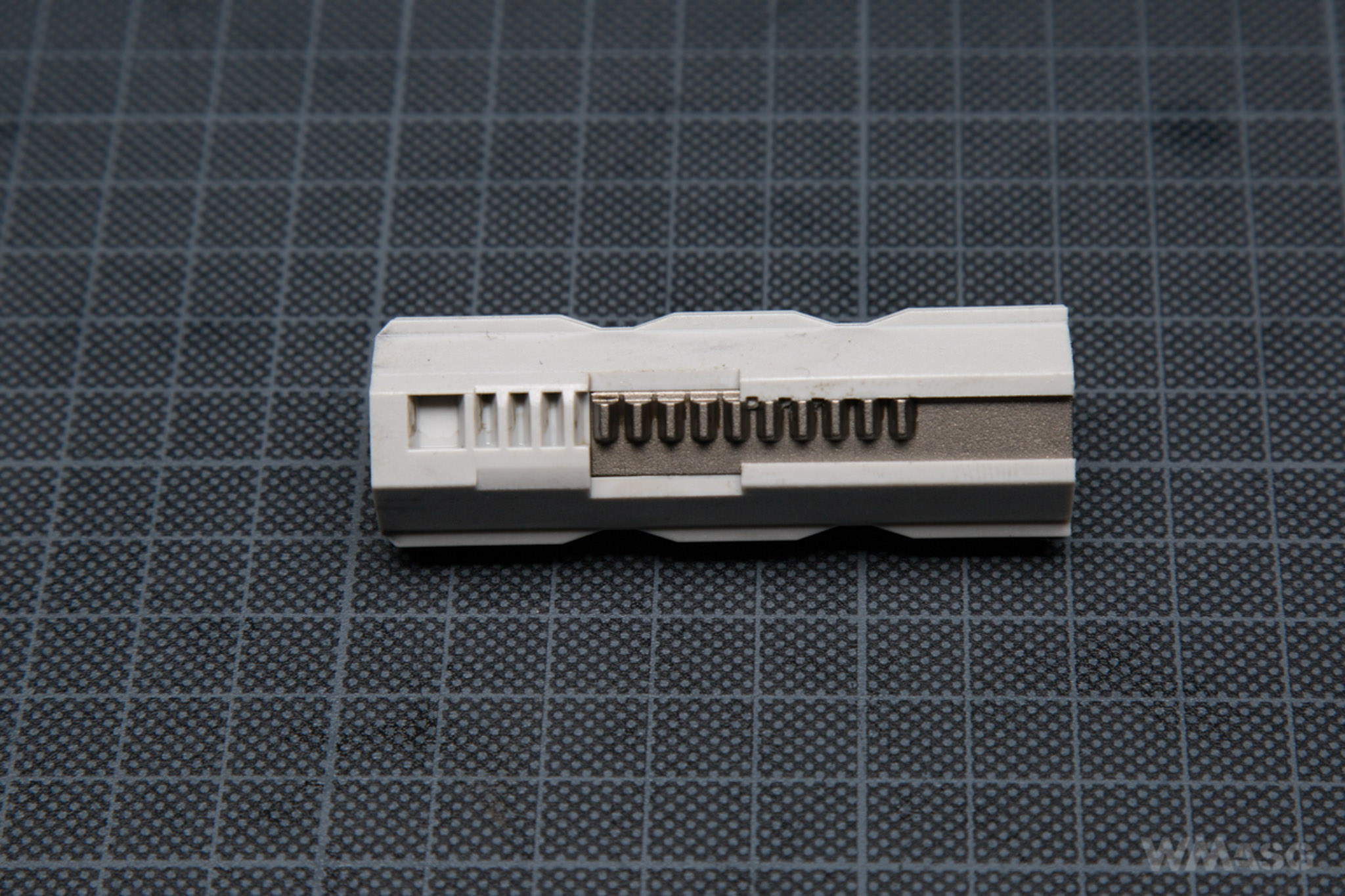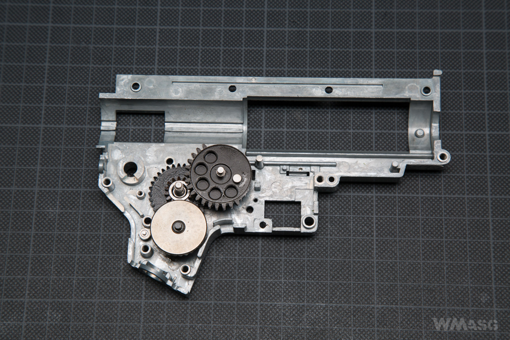 Według mnie stanowczo zbyt zegarmistrzowski w konstrukcji i wymiarach – pierścień Seegera utrzymujący na miejscu sprężynkę zatrzasku ma niecałe 3mm średnicy zewnętrznej. Zgubić lub skrzywić łatwo. Zdjąć trudno. Założyć jeszcze trudniej. Niestety demontaż zatrzasku jest niezbędny do otwarcia gearboxa. Pomysł na mocowanie sprężynki odpowiadającej za powrotny ruch atrapy zamka równie zegarmistrzowski.