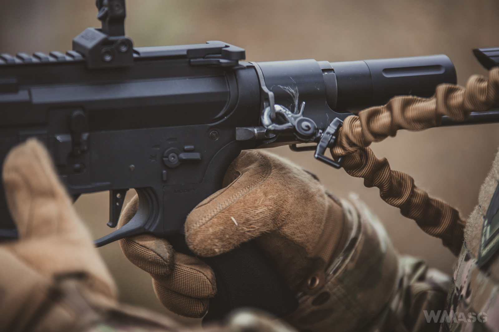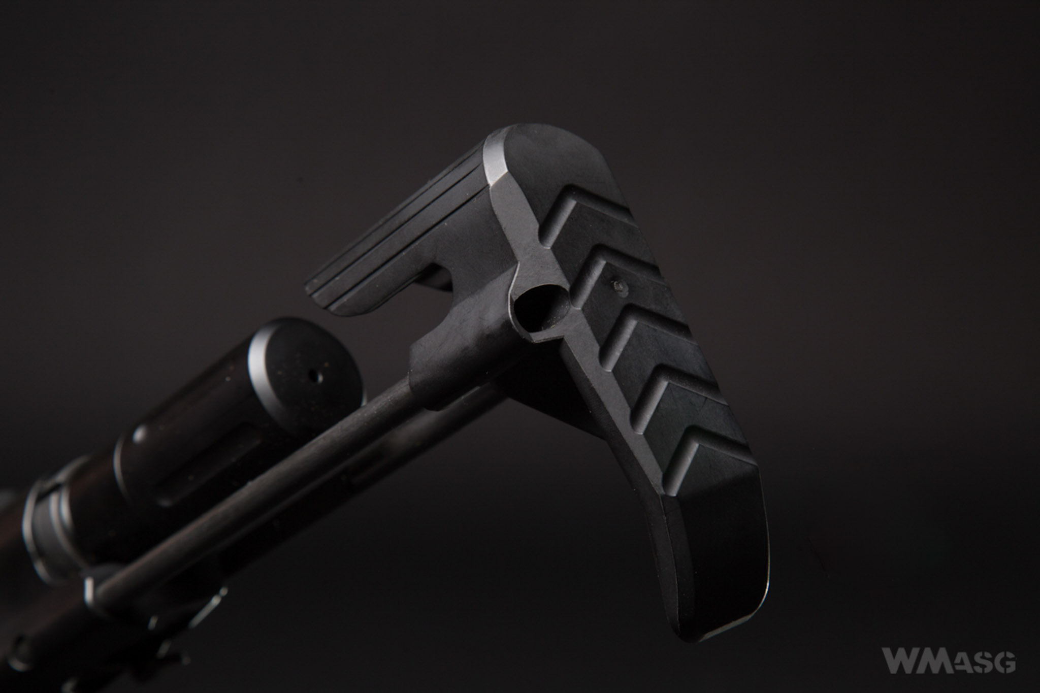 Chwyt pistoletowy wydaje się być węższy od standardowych, ale to tylko wrażenie. Nie posiada przetłoczenia rozdzielającego palce, a w tylnej części płynnie zachodzi na korpus karabinka. Boczne powierzchnie posiadają fakturę ułatwiającą pewne trzymanie. Wewnątrz chwyt posiada wklejone mosiężne gwintowane tulejki na śruby dekielka oraz sprytnie wymyśloną przestrzeń do poprowadzenia przewodów. Dekielek żebrowany, w połowie ażurowy. Nie zastosowano podkładki dystansowej do silnika. Montaż i regulacja silnika śrubami odbywa się przy pomocy klucza imbusowego.