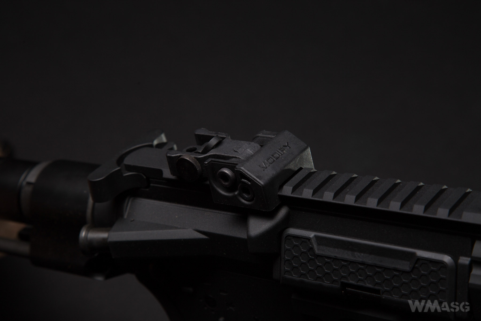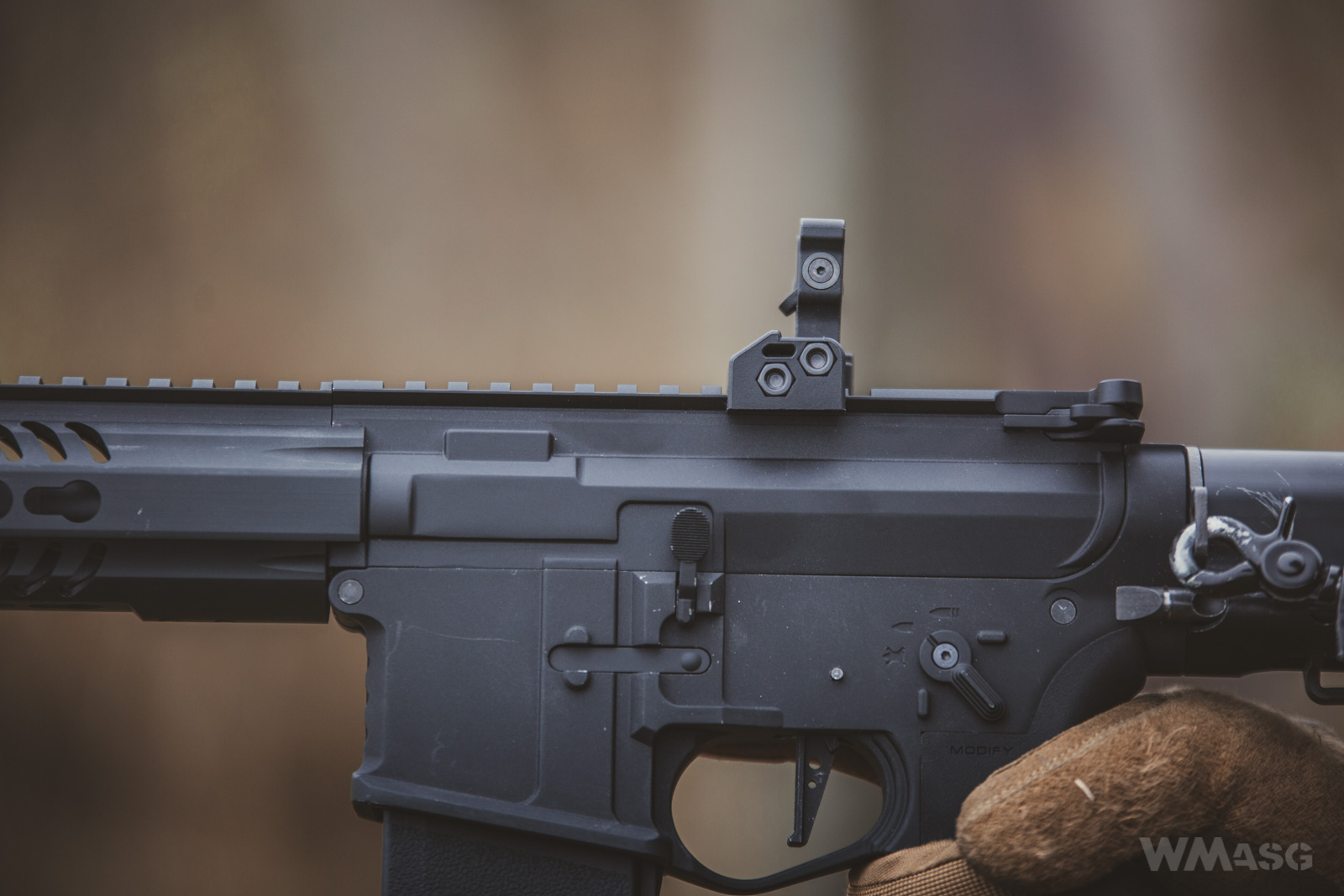 Ciekawa jest otwierana dźwignią przeładowania klapka okna wyrzutnika. Jest wykonana z polimeru i posiada fakturę plastra miodu. Po otwarciu klapki na czas regulacji komory Hop-Up można zablokować atrapę zamka w tylnym położeniu.