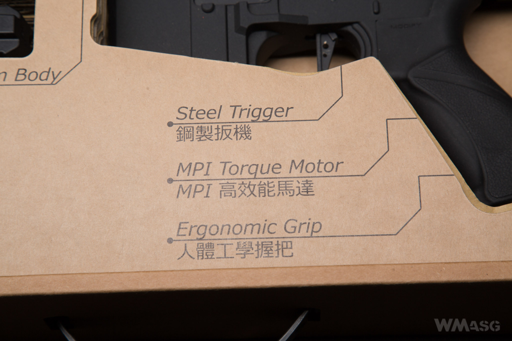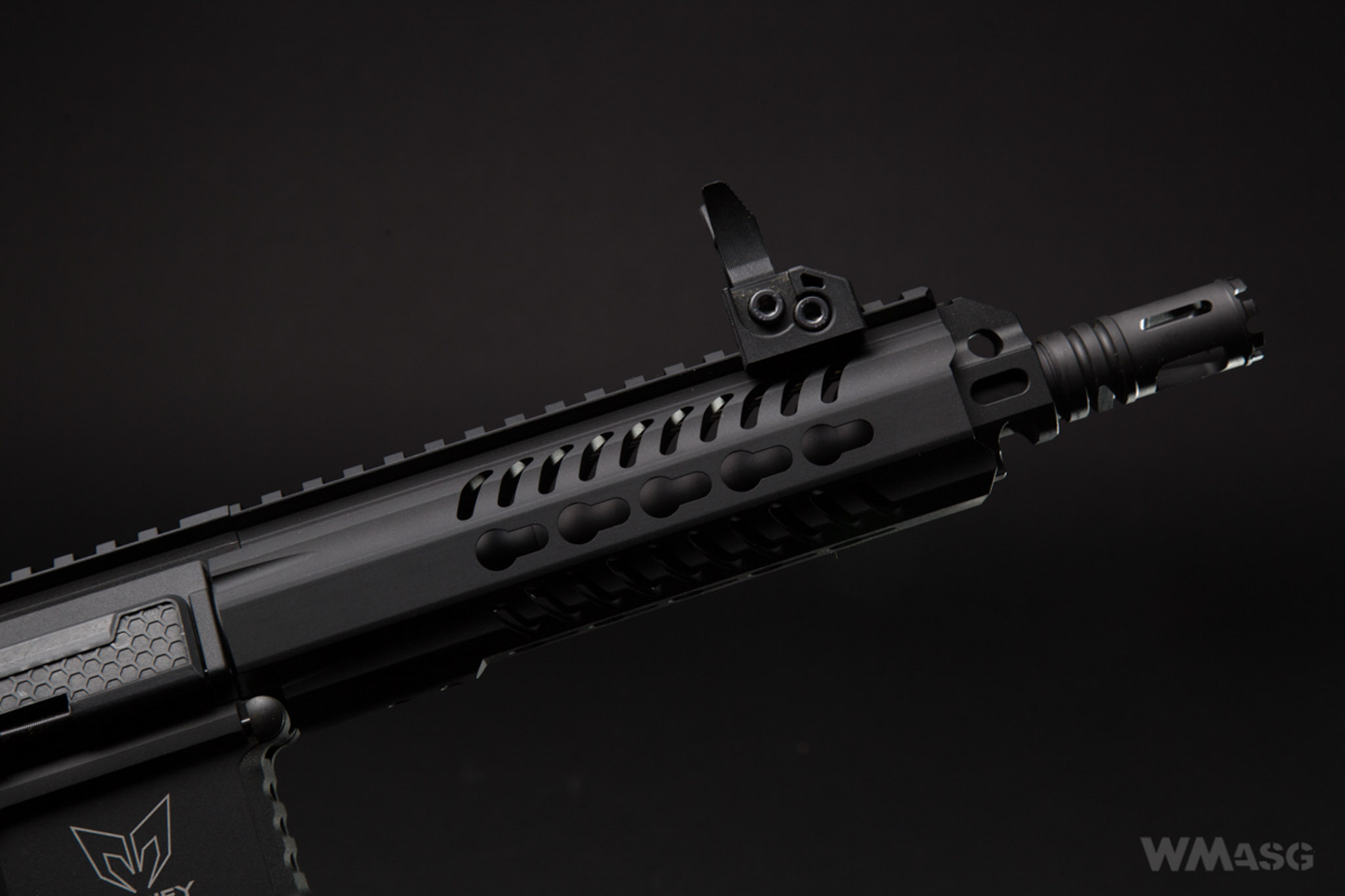 Według informacji od producenta, podstawowym materiałem konstrukcyjnym jest aluminium. Z niego wykonany jest korpus, łoże w systemie Keymod, lufa zewnętrzna, niektóre elementy kolby oraz manipulatory. Stalowy jest spust, tłumik płomienia oraz prowadnice kolby. W materiałach informacyjnych korpus określany jest jako „billet style”, czyli w stylu frezowanych z kawałka walcowanego aluminium. Kluczowym jest chyba słowo „style” – nigdzie nie znalazłem informacji o frezowaniu korpusu repliki.