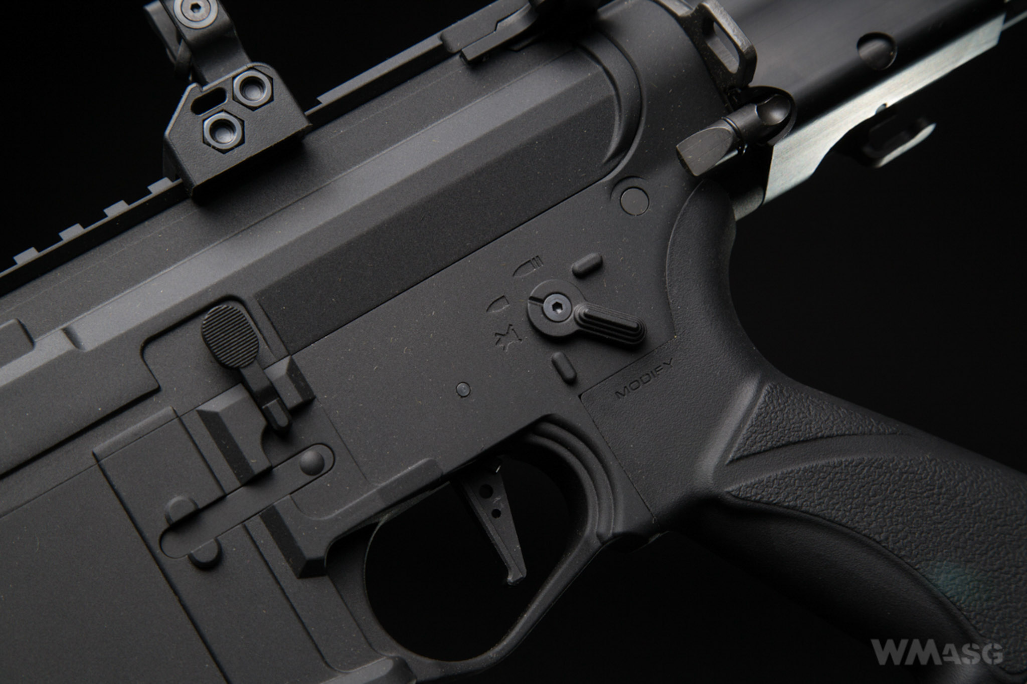 Umiejscowione wyłącznie z lewej strony korpusu skrzydełko selektora pracuje w zakresie od 0 do 90 stopni. Nastawa na ogień pojedynczy jest po obróceniu skrzydełka o 45 stopni. Obrót o 90 stopni to nastawa na ogień ciągły.
