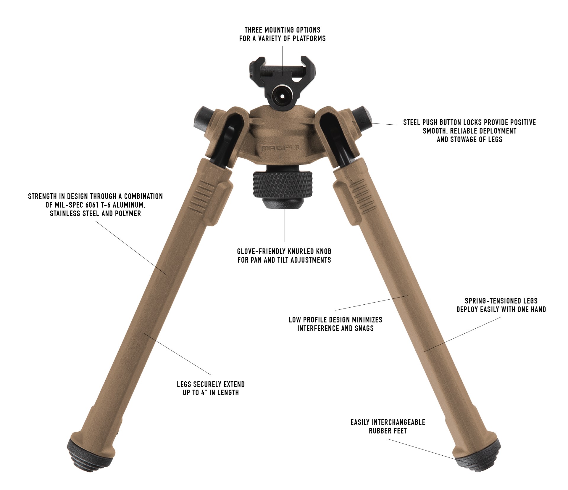 Nóżki posiadają standardowo długość 10,16 centymetra, zapewniając dodatkowo regulację ich długości po rozłożeniu do 23 cm. Łatwo zdejmowalne gumowe końcówki na ich końcach, mają sprawić że używanie dwójnogu będzie łatwiejsze w pełnym spektrum warunków.