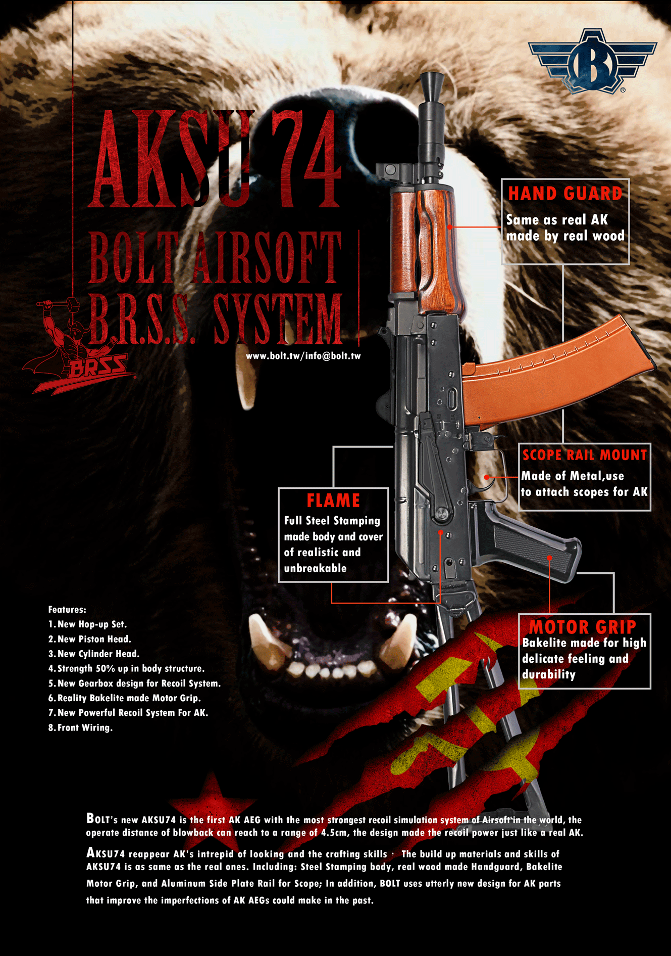Według producenta, replika ta ma posiadać najmocniejszy system odrzutu ze wszystkich replik AK wyposażonych w EBB. Ma on powodować, że ta w trakcie strzału bez podparcia, ma się przesuwać do tyłu nawet o 4,5 cm.