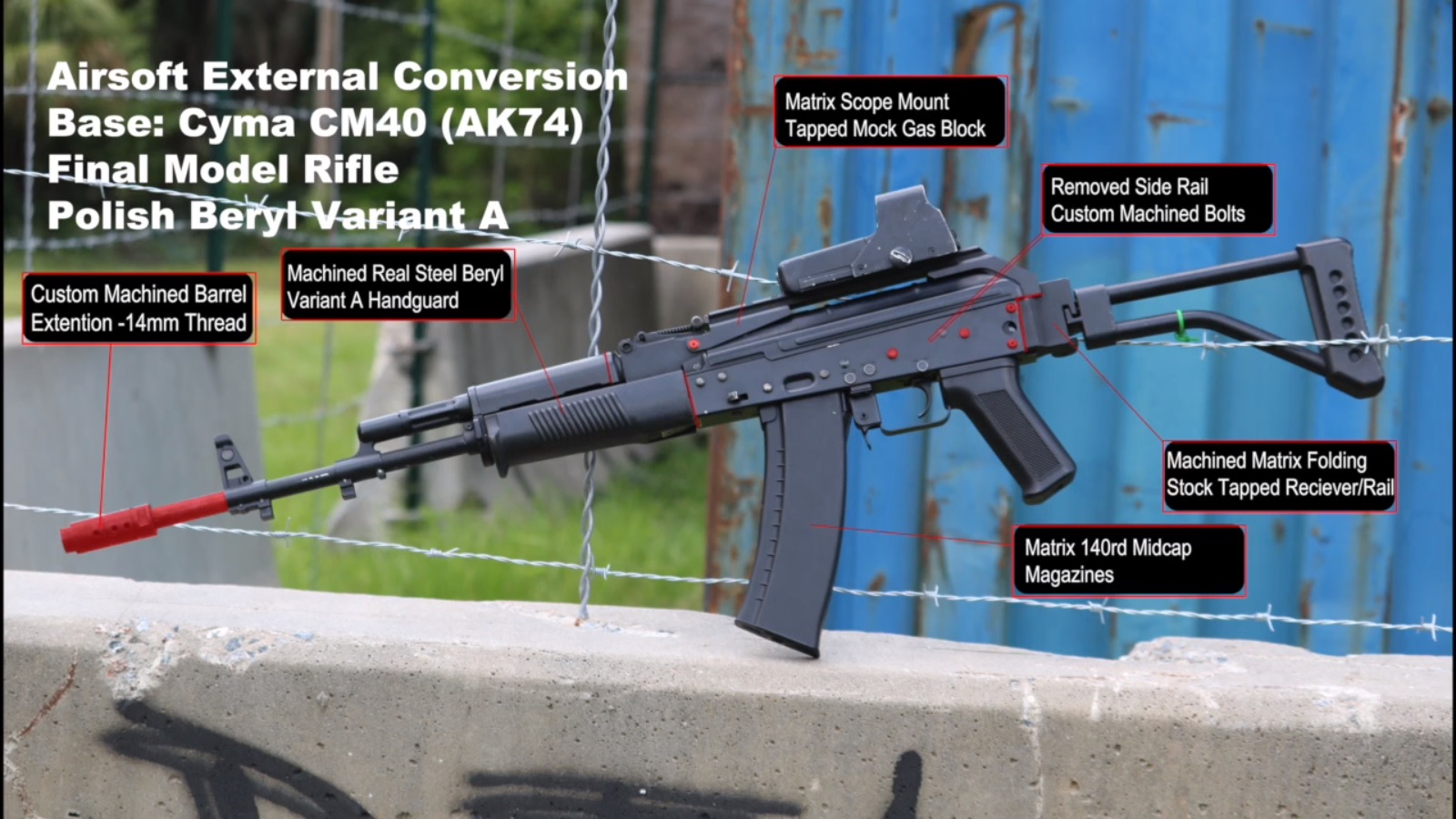 Bazą całości jest replika CYMA CM40, a efekt finalny wzorowany był na karabinku Beryl wariant A. Impulsem do stworzenia repliki był fakt, że wersja od Aresa jest ciężko dostępna w USA, a obecnie w ogóle na rynku cywilnym także w Polsce. Modyfikacje obejmują między innymi zamontowanie chwytu przedniego z wersji palnej, stworzenie od podstaw repliki urządzenia wylotowego i pinów w korpusie oraz dodanie szyny montażowej i zmiana kolby na składaną, wyglądem przypominającą tą oryginalną.