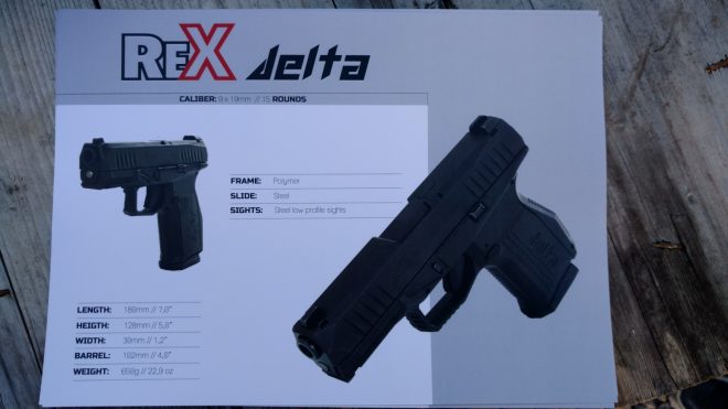 Bezkurkowy Rex Delta, zasilany ma być amunicją 9 x 19 mm. Jego rama wykonana będzie z polimeru, dzięki czemu całość ważyć ma 650 gram. Same wymiary broni natomiast zbliżone są do glocka 19. Prezentują się one następująco: długość całkowita – 180 mm (G19 174 mm), długość lufy – 102 mm (G19 102 mm), szerokość – 30 mm (G19 30 mm) i wysokość – 128 mm (G19 127 mm).