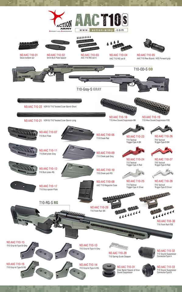 Wszystkie części dedykowane są do serii replik o nazwie AA T10. Wśród nich odnaleźć można akcesoria do kolb, takie jak dolna szyna akcesoryjna, wymienne zaślepki kolby, baki policzkowe, lufy o różnych długościach, tłumiki i adaptery do nich, jak i dwójnóg. Dodano również do oferty dwa rodzaje spustów, a każdy z nich dostępny jest w kolorze czarnym, czerwonym i srebrnym. Nie zapomniano o szynie akcesoryjnej nakładanej na front lufy, wymiennych chwytach, skorupie magazynka i całych replikach w kolorze szarym i od green.
