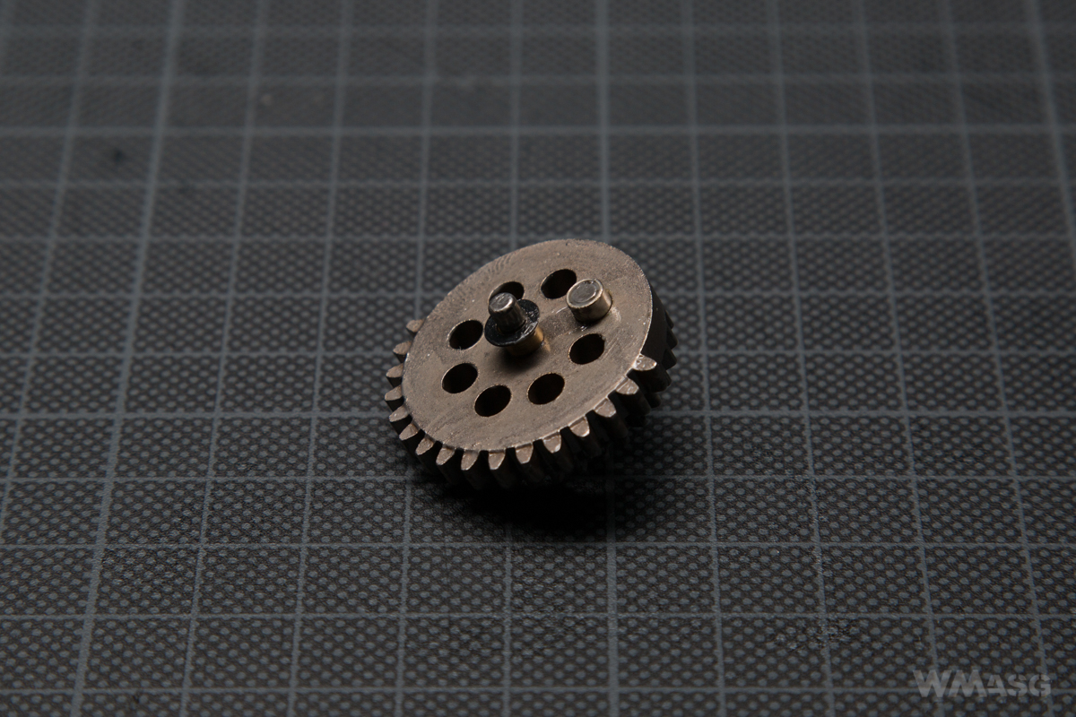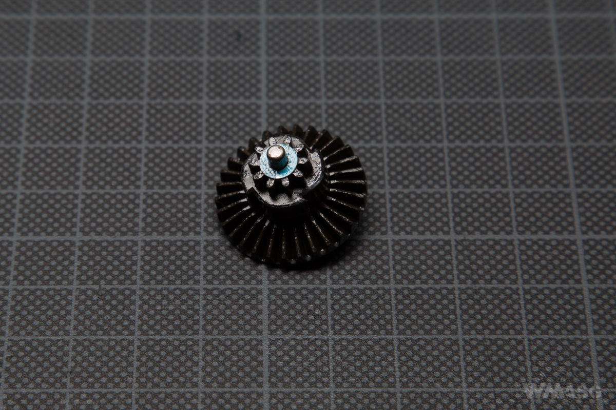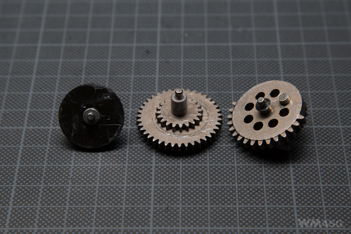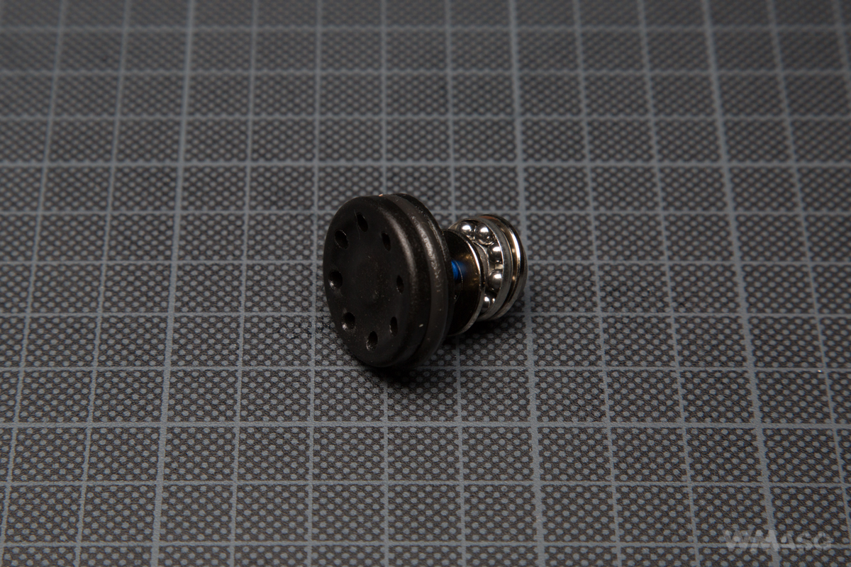 Koło silnikowe i koło na wałku silnika wykonane w technologii MIM. Faktycznie wyglądają zupełnie inaczej niż pozostałe. Na kole tłokowym na element napędzający popychacz nałożona cienka tulejka mająca zapewne poprawić podawanie kulek.