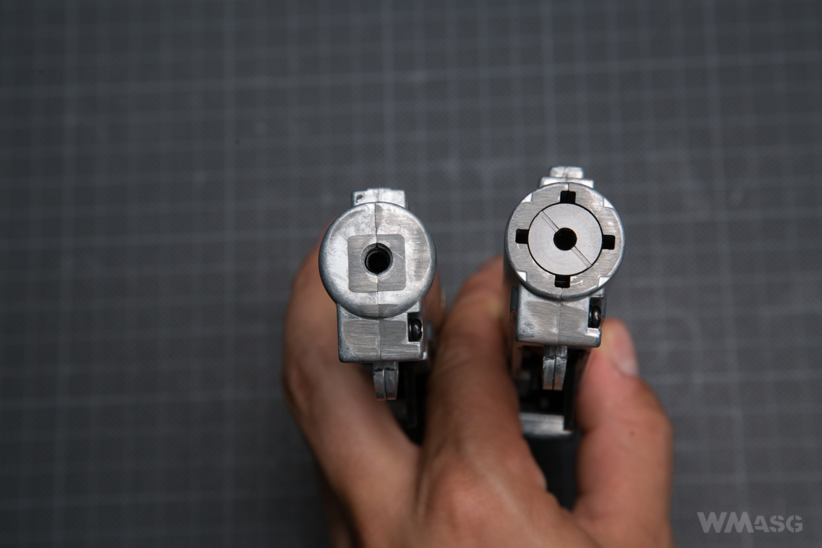 Klapka okna wyrzutowego otwiera się po odciągnięciu dźwigni przeładowania i pozostaje otwarta po jej zwolnieniu otwierając dostęp do regulacji HopUp. Niestety atrapa zamka nie blokuje się w tylnym położeniu - podczas regulacji konieczne jest przytrzymanie dźwigni przeładowania. Podczas strzelania atrapa zamka porusza się wraz z ruchami tłoka w cylindrze (system EBB).