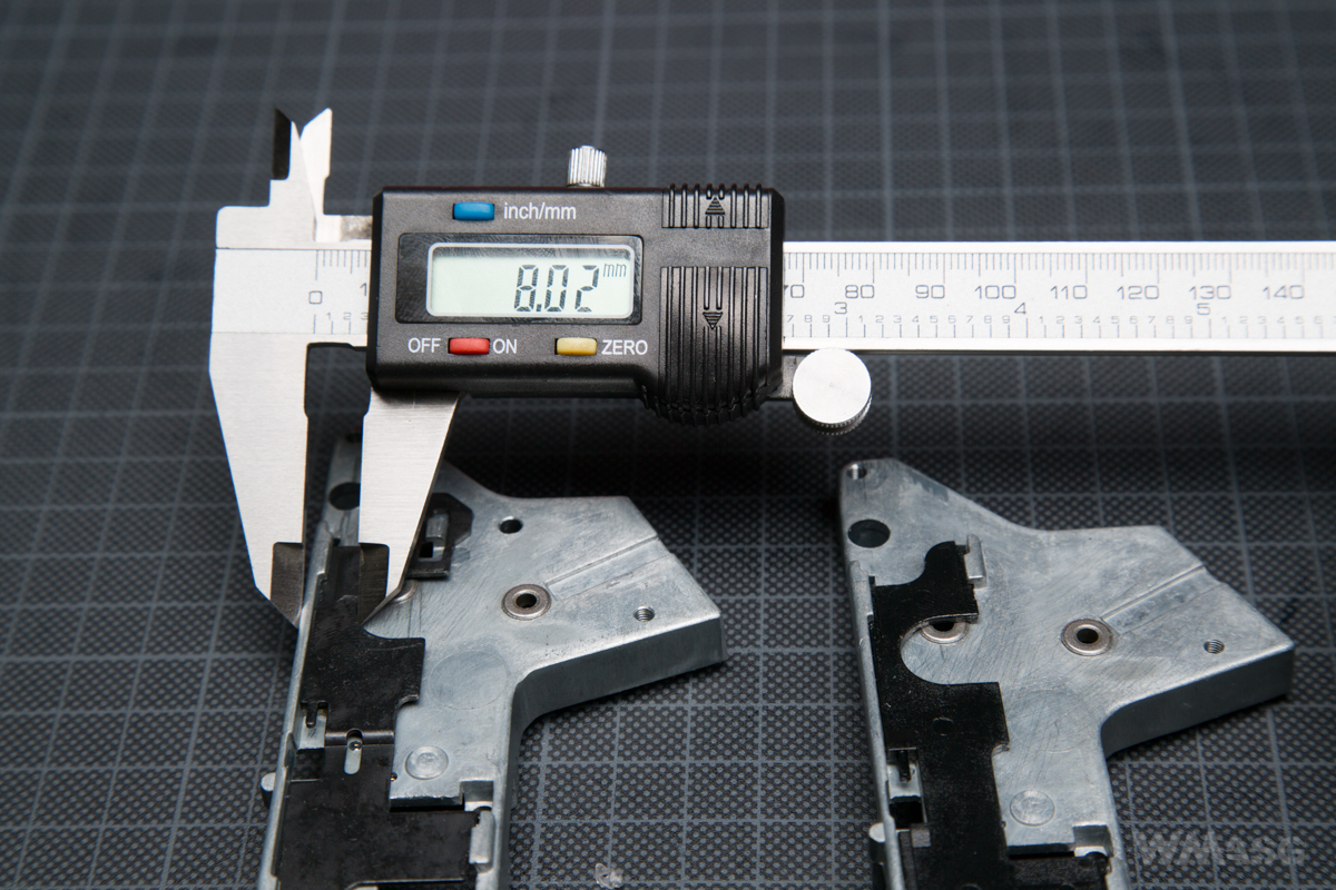 Z zewnątrz płytka selektora niestandardowa, wykonana z metalu. Na zdjęciach pokazujemy różnicę pomiędzy płytką karabinka CXP-MARS, a standardową płytka gearboxa wersji 2. MARS u góry.