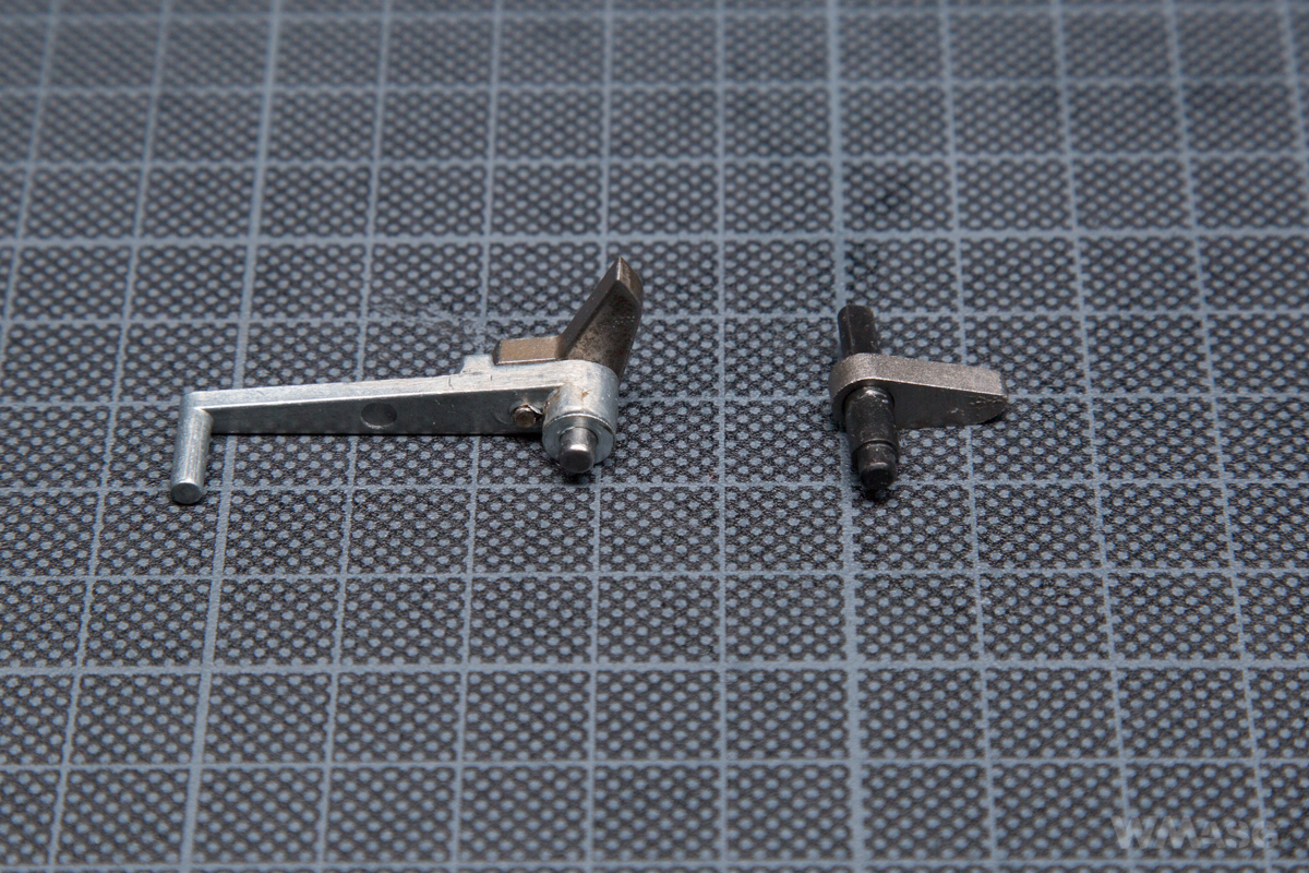 Zapadka przeciwpowrotna (anti-reversal) inna niż replikach ICS ze zwalnianiem sprężyny przyciskiem dosyłacza.  Kształt elementu roboczego jest standardowy, ale oś jest nieznacznie dłuższa i zakończona charakterystycznym wieloklinem. Część MARS-a po prawej. Po lewej ta współpracująca z dosyłaczem.
