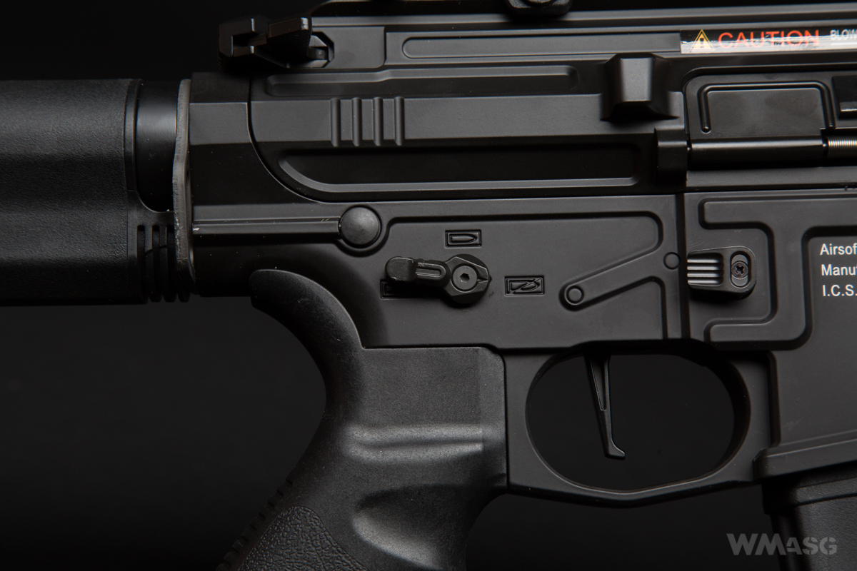 Jest to prowadnica wyposażona sprytny system bezpiecznego prowadzenia przewodów, którą ICS wykorzystuje także w innych replikach.  Dzięki prowadnicy możliwe jest ustawianie kolby w pięciu dodatkowych pozycjach. Niestety regulacji można dokonać jedynie kluczem imbusowym 4 mm. Należy wykręcić wkręt dociskowy znajdujący się w dolnej części kolby, ustawić kolbę trafiając w wybrane gniazdo w dole prowadnicy i dokręcić wkręt. Regulacja na prowadnicy pozwala ustawić długość kolby w przedziale 27-36 cm. Do tego oczywiście dochodzi możliwość dalszego wydłużenia stopką. W kolbie przewidziano także miejsce na akumulator (w prowadnicy). Dostęp uzyskujemy pod obróceniu o ćwierć obrotu śruby znajdującej się tuż nad zaczepem pasa typu QD i wysunięciu tylnej części kolby. Bez problemu mieści się pakiet LiPo 11,1 V 1400 mAh o wymiarach 21 x 20 x 130 mm.