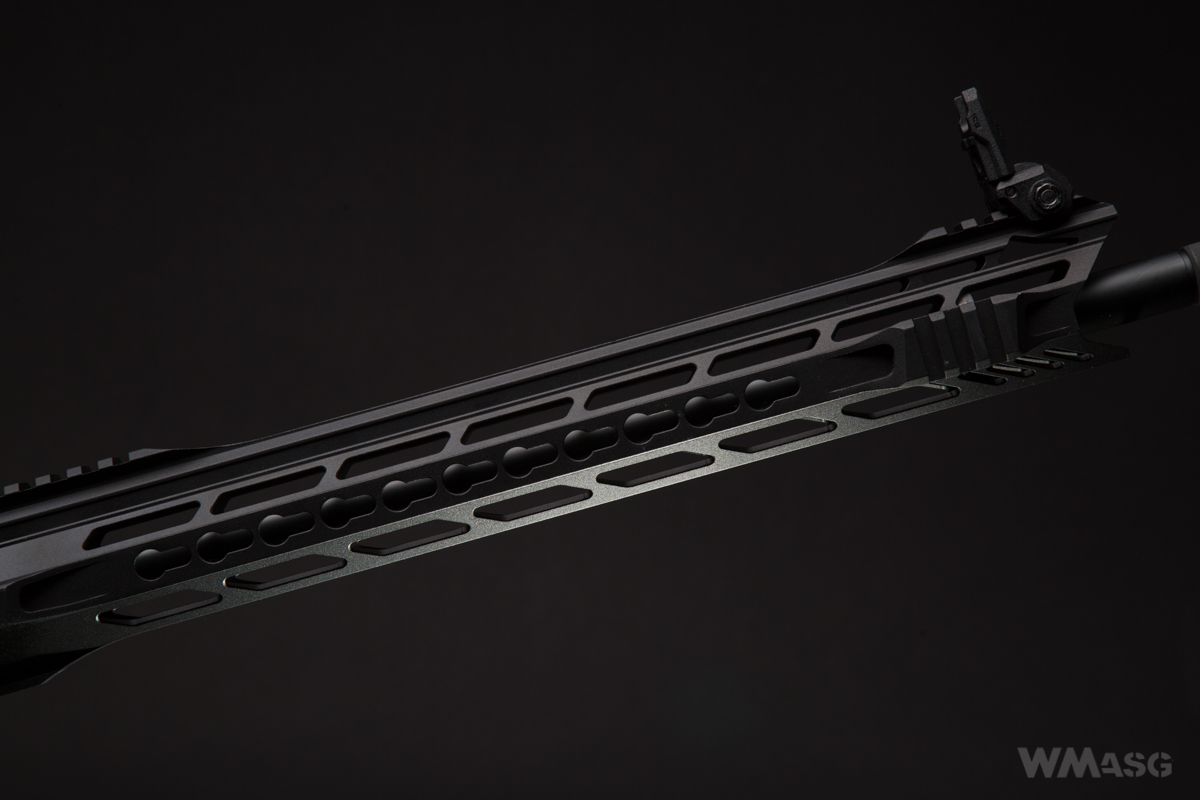 Po bokach jest po 11 gniazd systemu Keymod. Na górze jest ich 9, a na dole 16. Ponadto od strony wylotu lufy łoże ukształtowane jest w 3 krótkie szyny Picatinny – 2 po bokach i 1 na górze. Na górnej szynie zamontowana jest muszka będąca częścią zestawu składanych przyrządów celowniczych CFS. Od strony korpusu łoże wyprofilowane jest w kolejną szynę Picatinny, która płynnie łączy się z szyną znajdującą się na górze komory zamkowej.