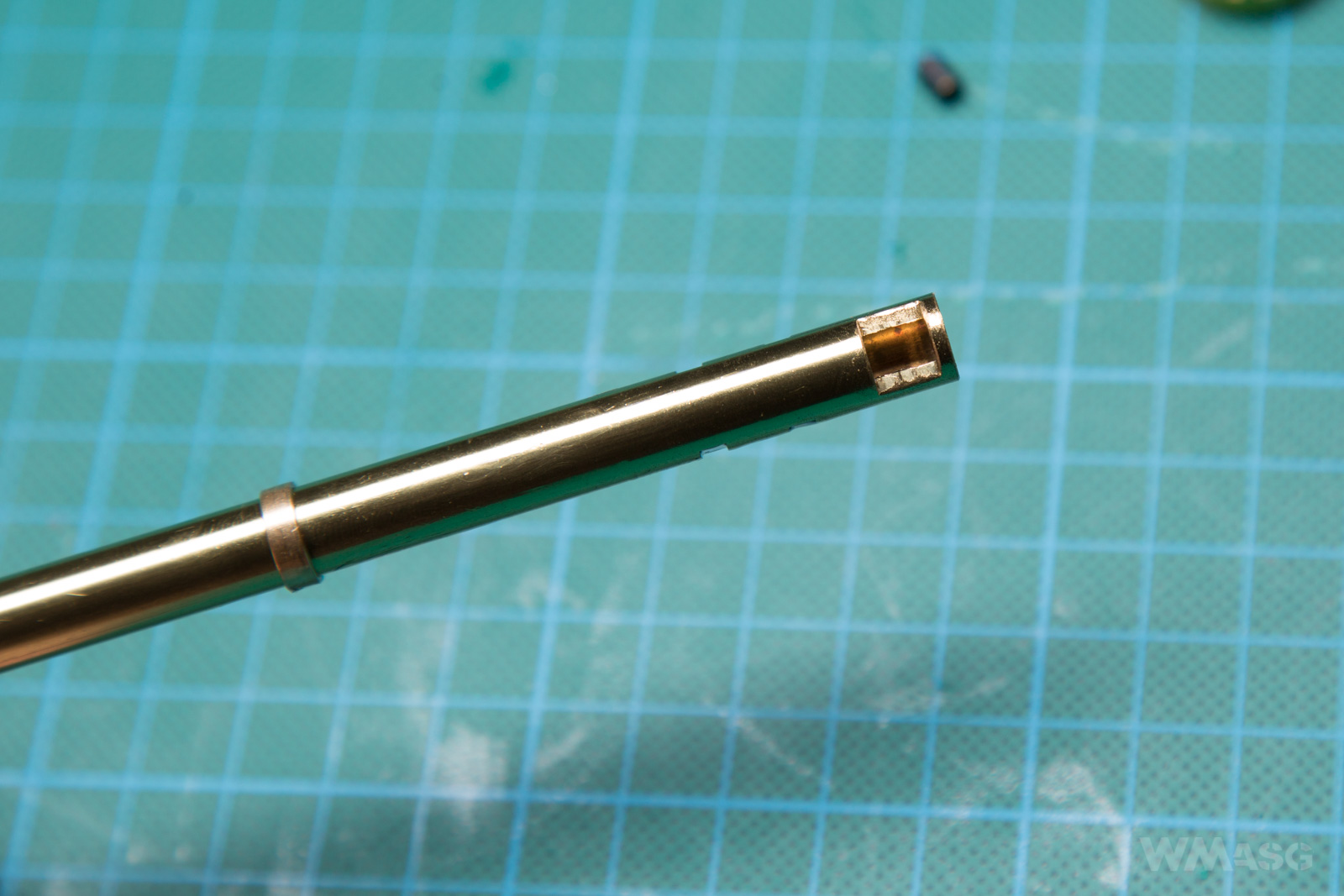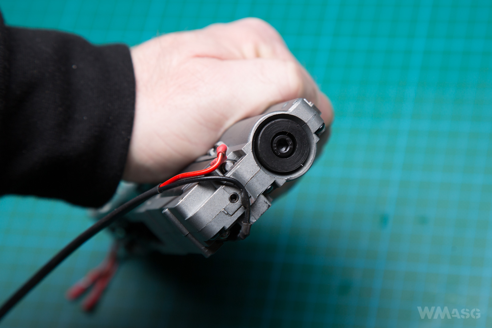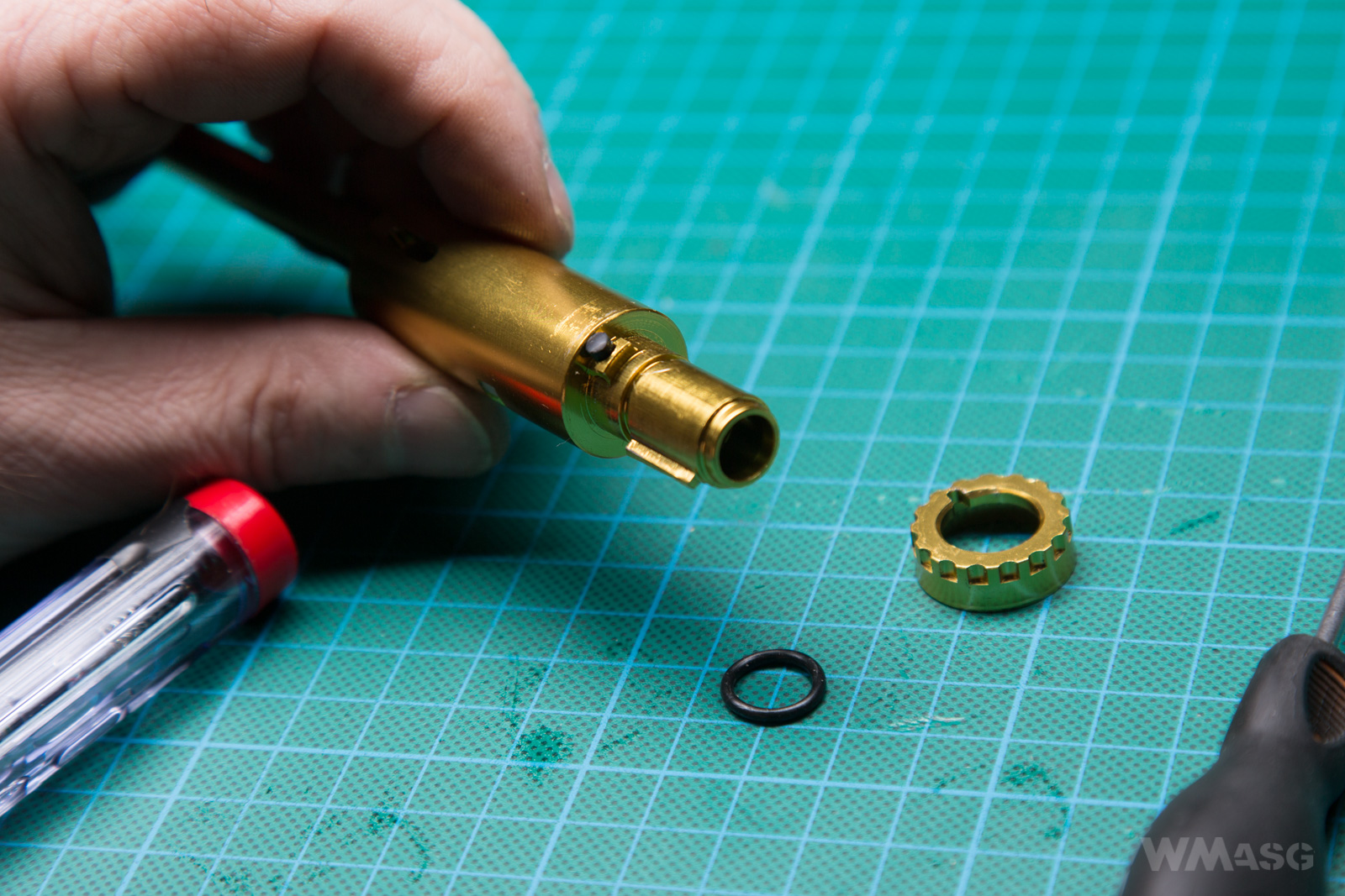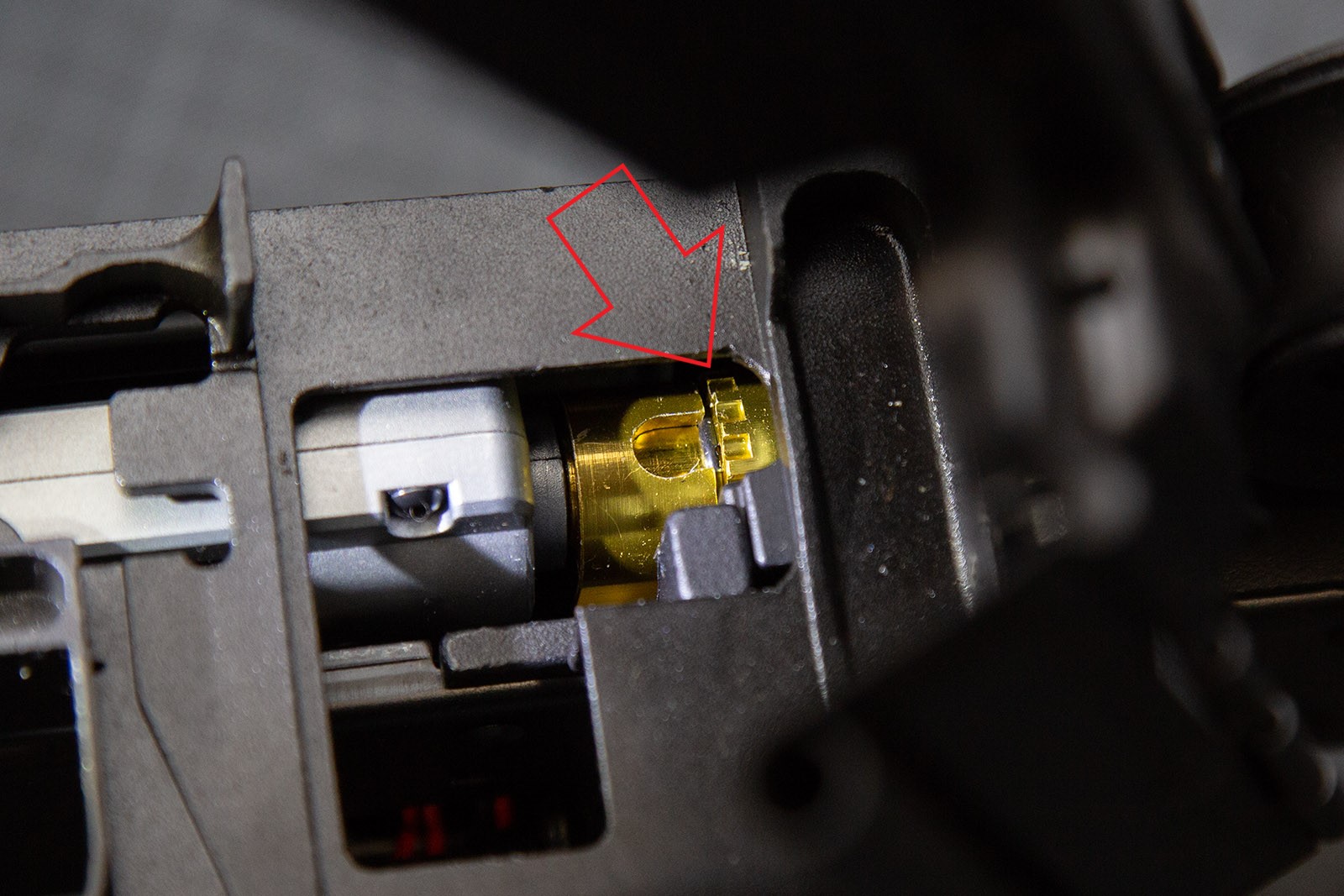 Regulację przeprowadza się kręcąc pierścieniem wokół osi lufy. Na kolejnych zdjęciach dla większej czytelności pokażemy wymontowaną komorę, ale powtórzę: do regulacji HopUp wystarczy unieść klapę.