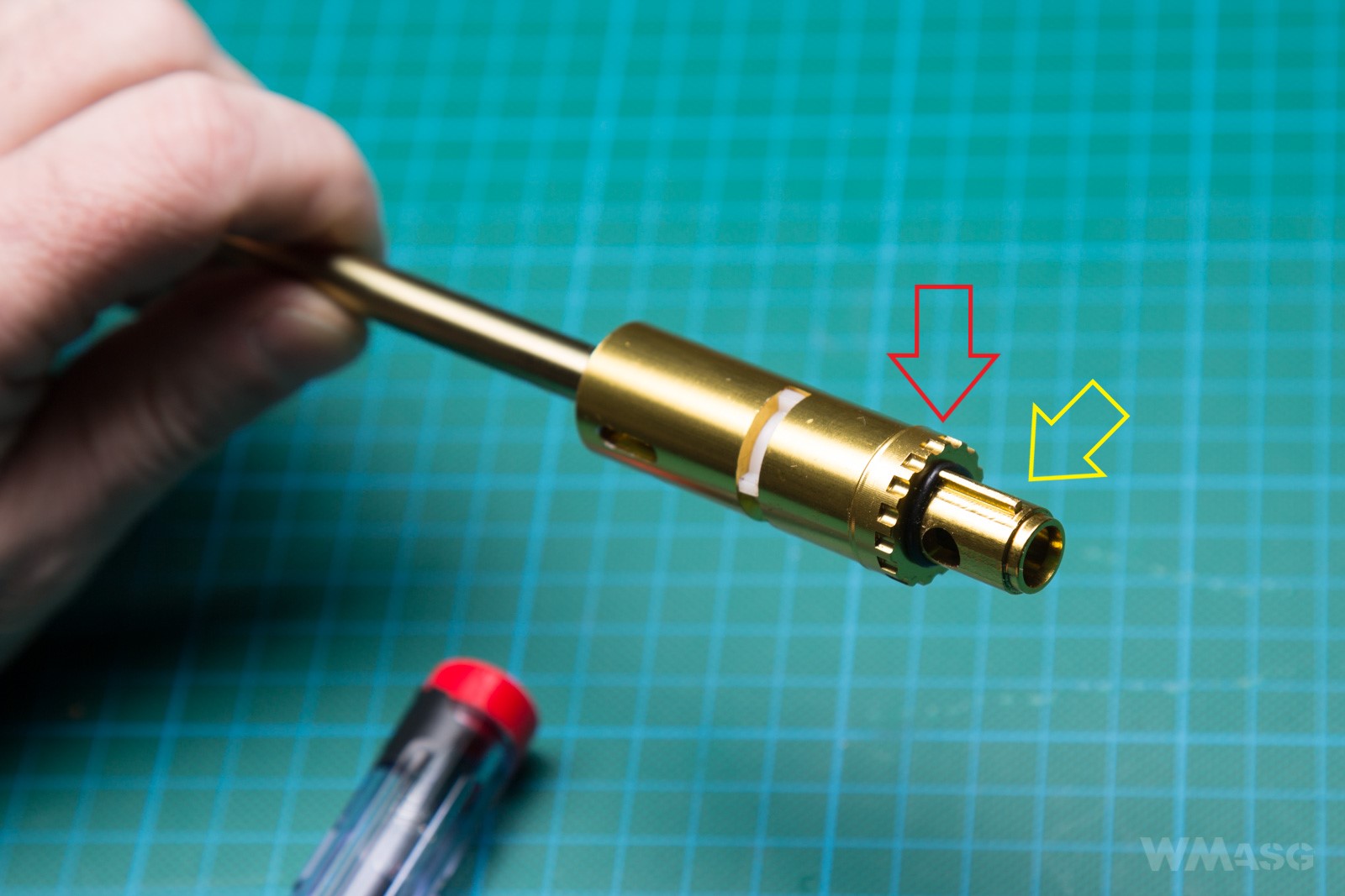 Czerwona strzałka wskazuje pierścień regulacyjny. Żółta - krawędź ustalającą położenie komory w replice.