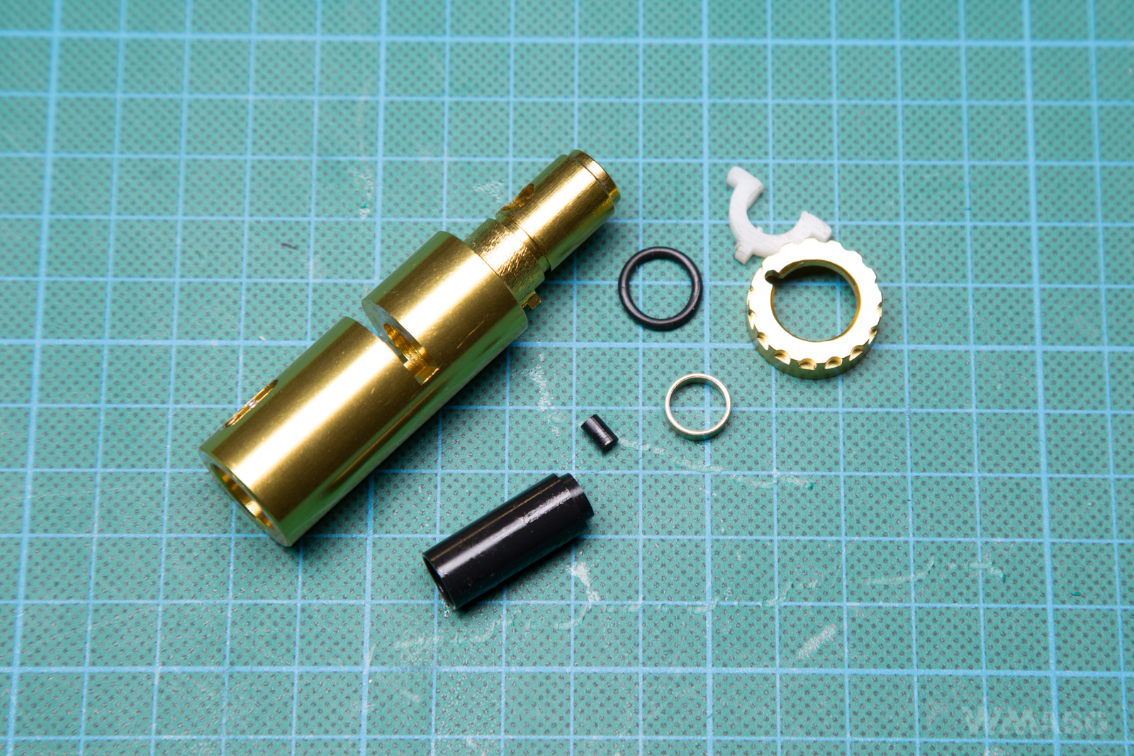 oraz sprężynę o nieregularnych zwojach i prowadnicę z łożyskiem, oraz uszczelnioną aluminiową dyszę o długości 35 mm.