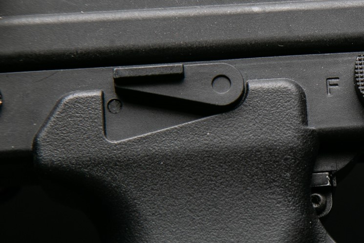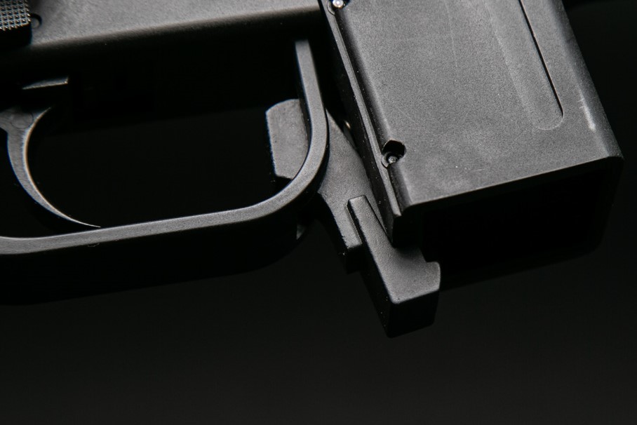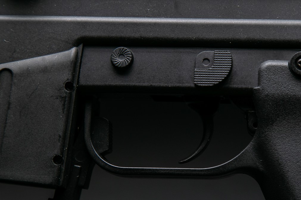 Prawdopodobnie osoby posiadające długie palce mogłyby nacisnąć go palcem wskazującym. Mój palec okazuje się zbyt krótki - mogę co prawda nacisnąć przycisk zmieniając nieco ułożenie dłoni na chwycie, ale i tak robię to na siłę, dosłownie samą opuszką palca. Dużo wygodniejszy, szybszy, a przede wszystkim pewniejszy sposób to wciśnięcie przycisku kciukiem ręki wspierającej, która jednocześnie trzyma magazynek. Szczęśliwie miejsca wewnątrz osłony spustu jest bardzo dużo - można to zrobić także w rękawiczkach.